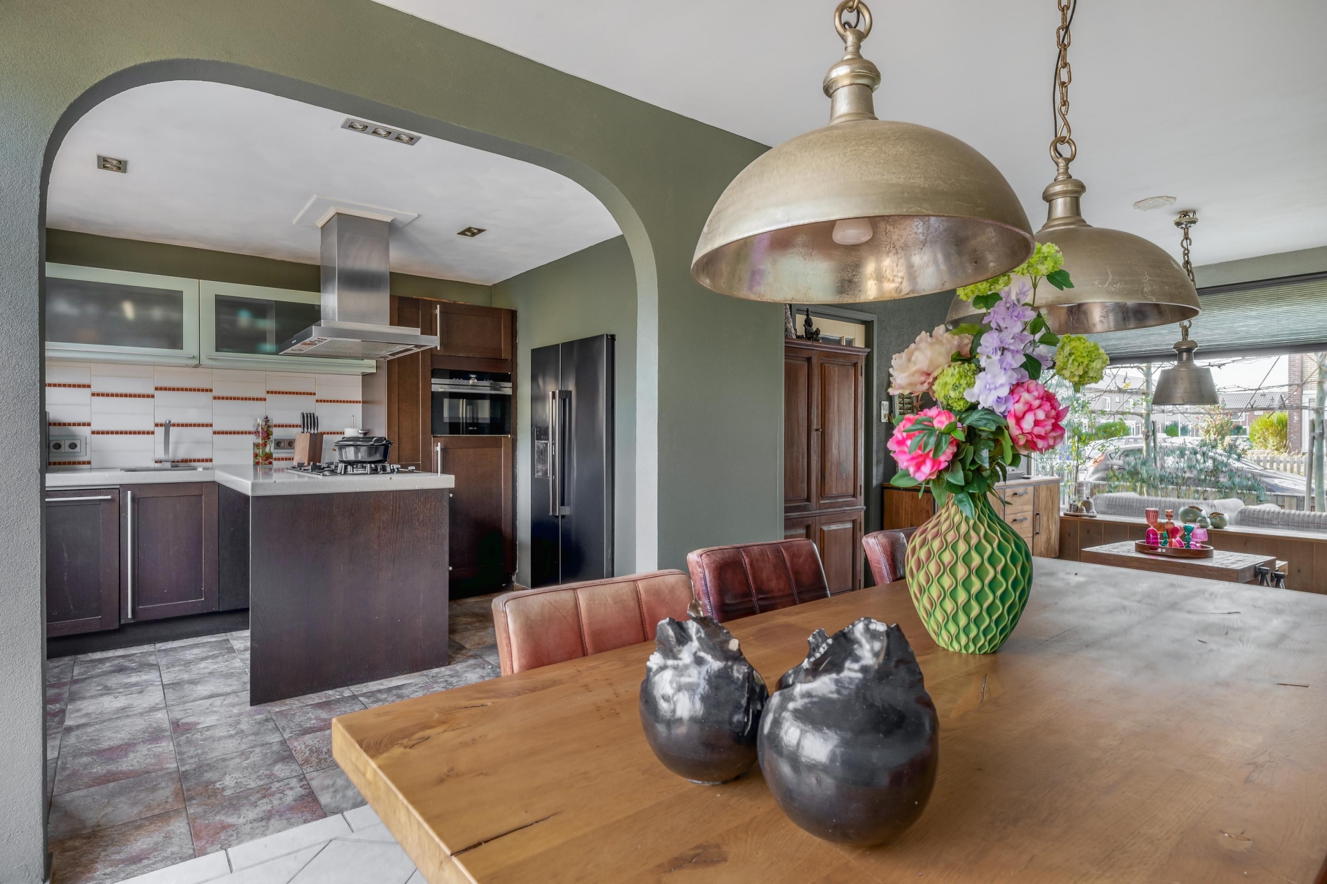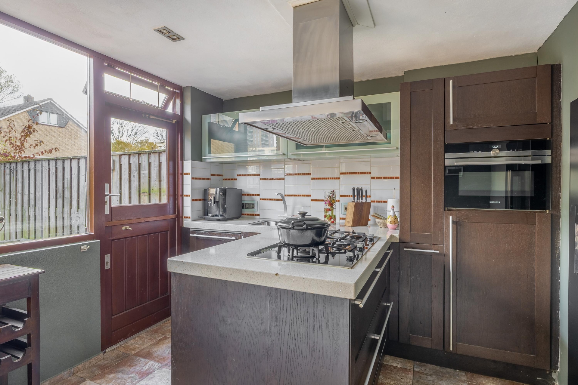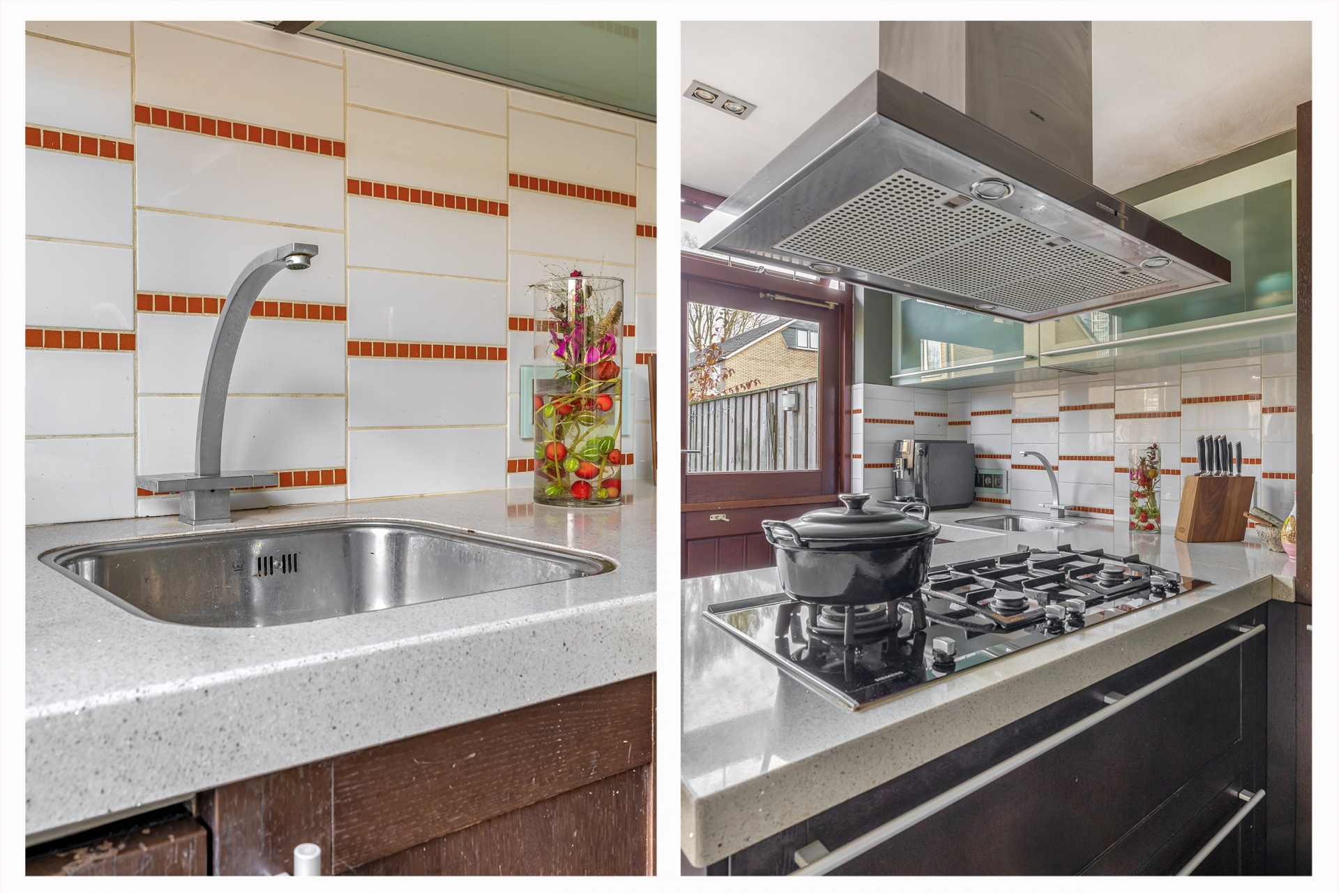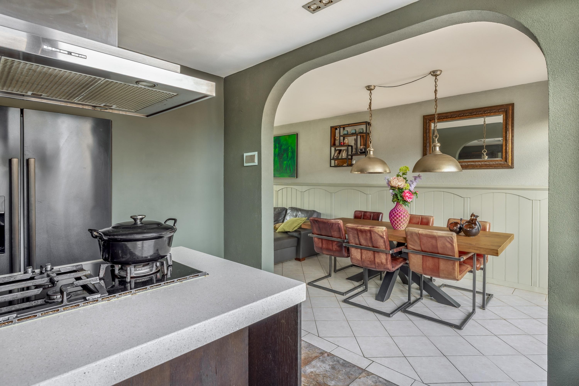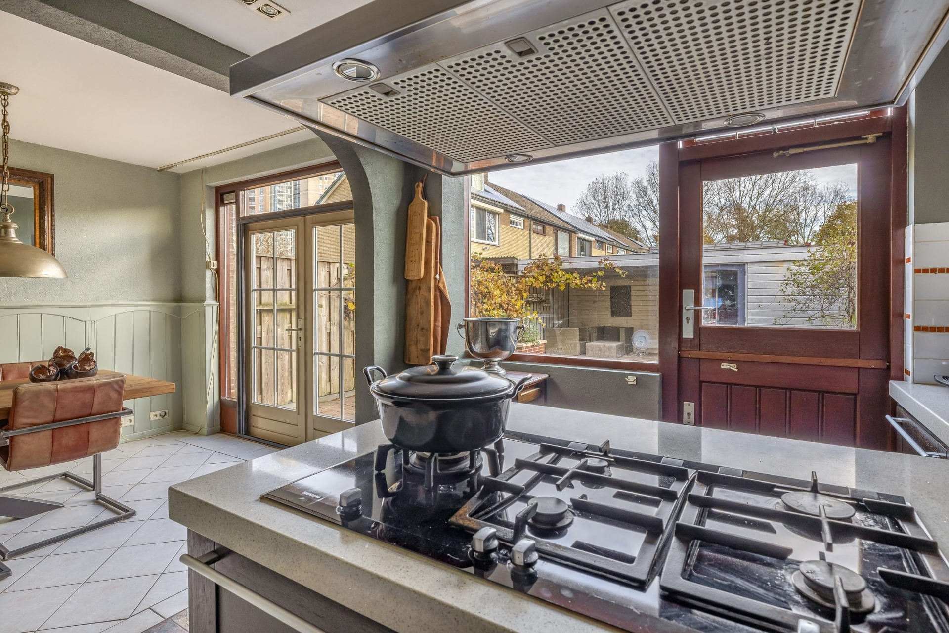 De begane grond is slim ingedeeld met een sfeervolle, lichte woonkamer aan de achterzijde. Dankzij de grote ramen en tuindeur heb je hier prettig contact met de tuin en valt het licht mooi naar binnen. De zithoek aan de voorzijde kijkt uit over de straat, terwijl het eetgedeelte naadloos aansluit op de open keuken. De keuken zelf heeft een speelse opstelling met kookeiland en is uitgerust met een gaskookplaat, afzuigkap, vaatwasser, koelkast en een oven. De praktische betegelde vloer met vloerverwarming loopt door in de gehele ruimte, wat zorgt voor een rustig geheel. Handig is ook de trapkast voor extra opbergruimte.