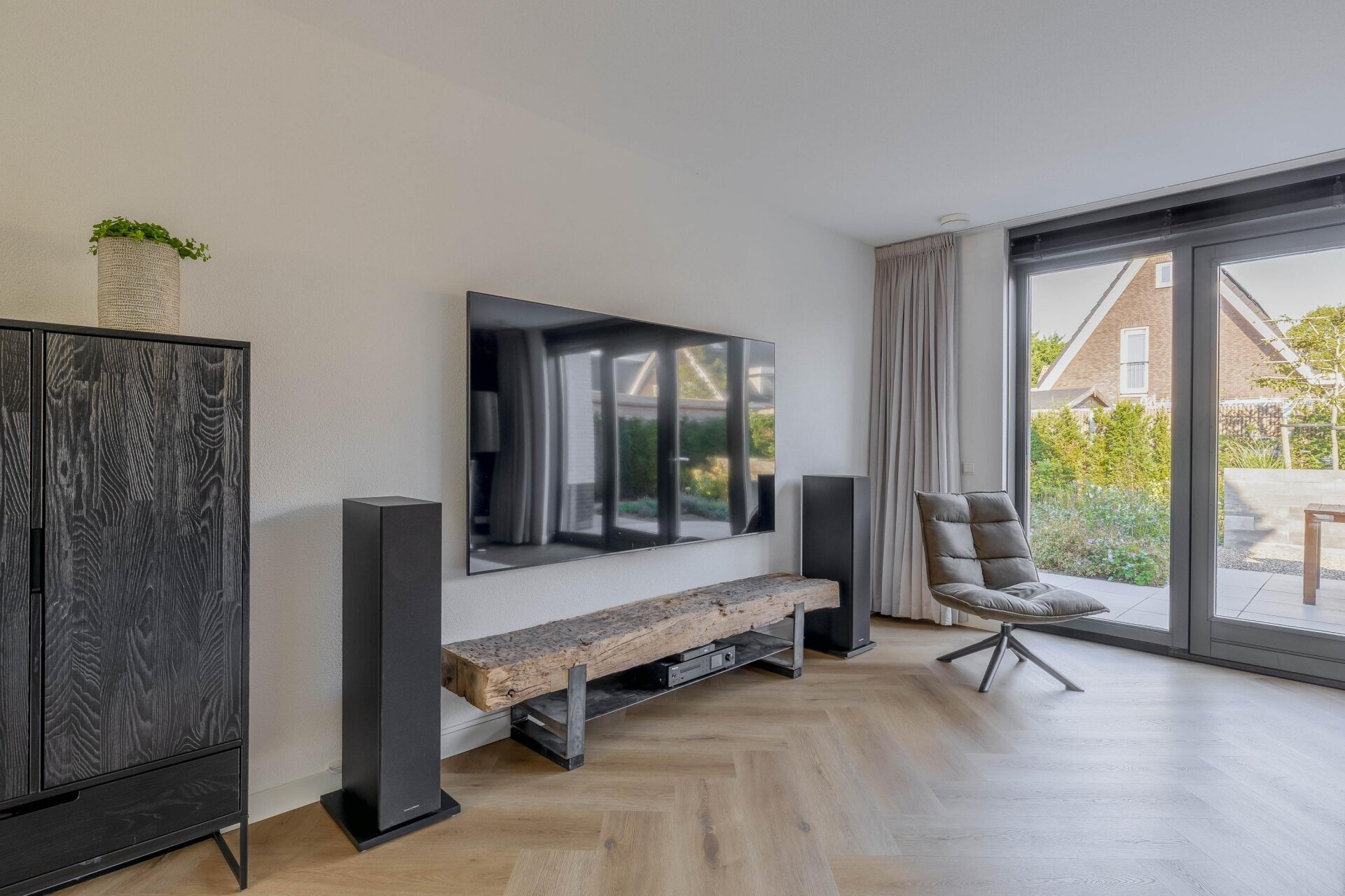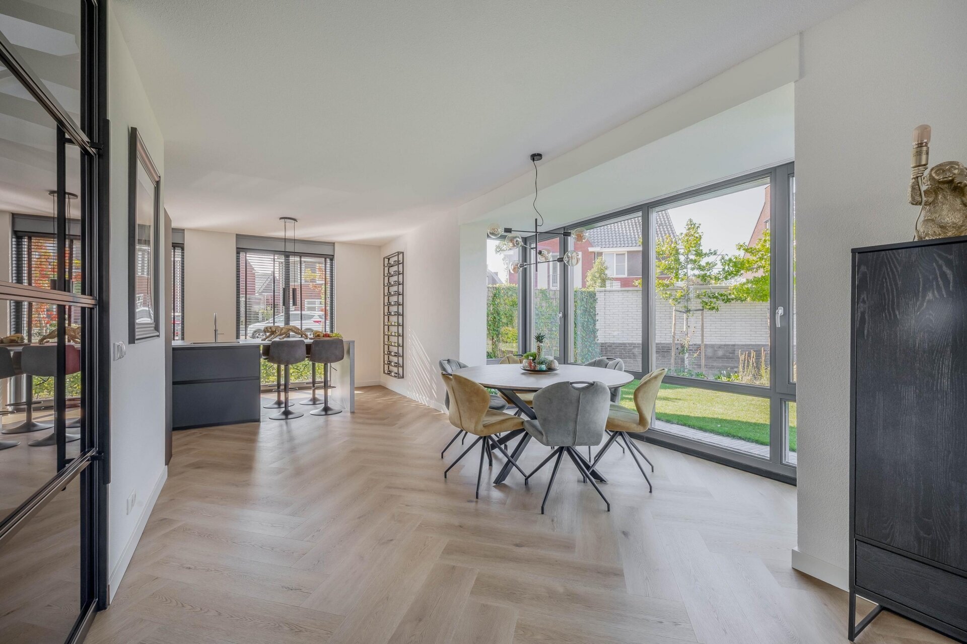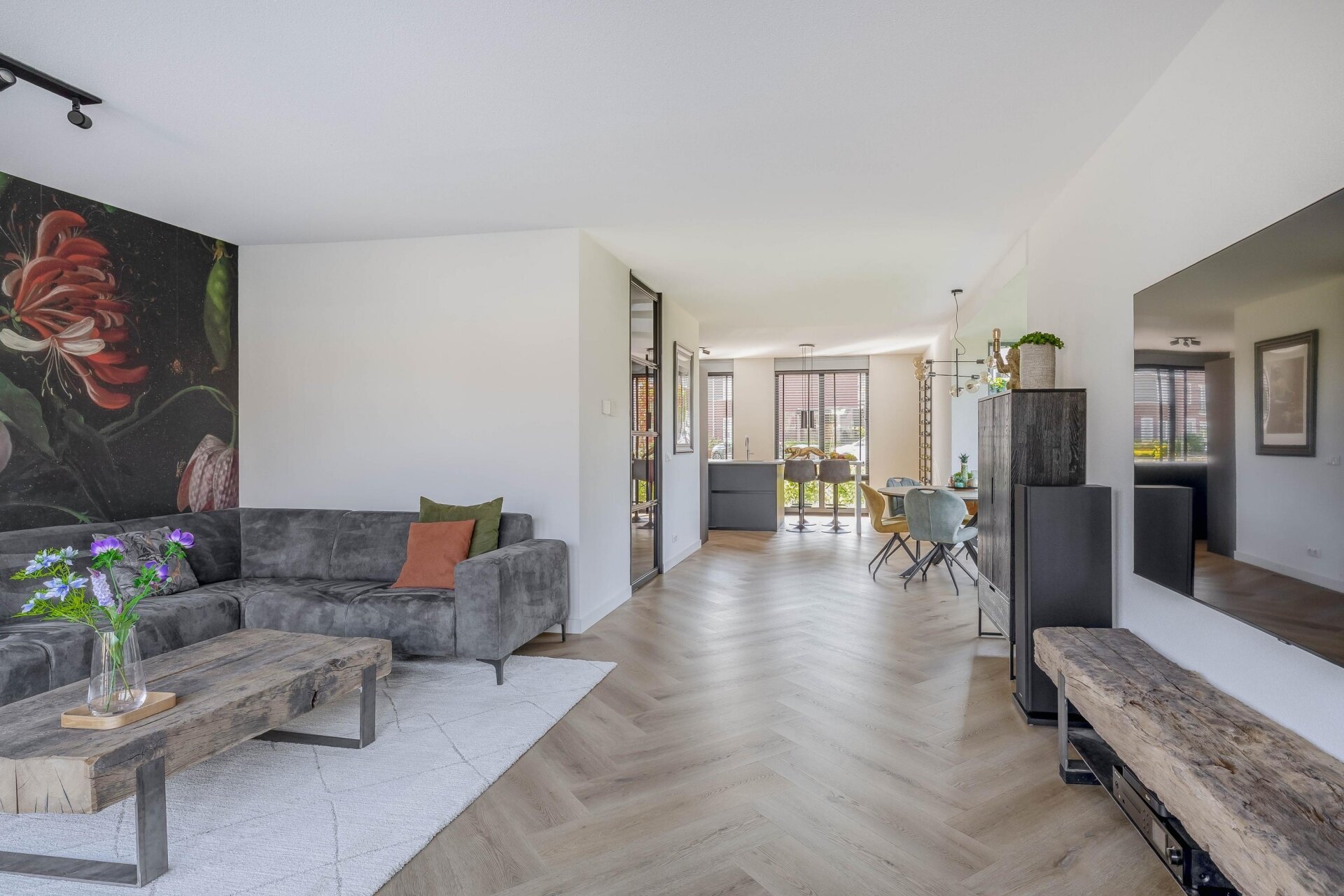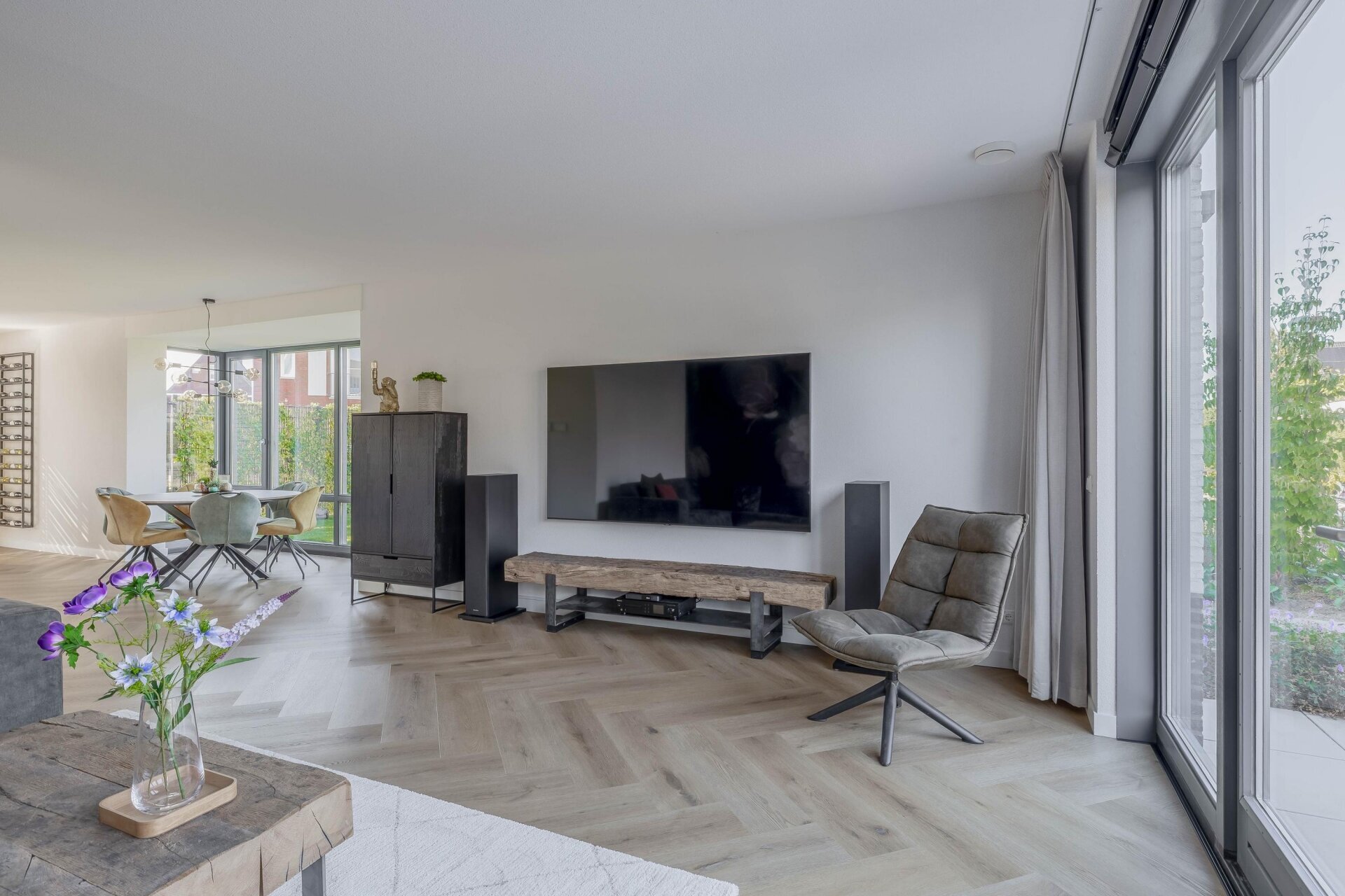 Binnenkomend in de ruime hal valt meteen de stijlvolle afwerking op: gestuukte wanden, een visgraat pvc-vloer en zwarte stalen binnendeuren. De woonkamer is tuingericht, met openslaande deuren naar het terras. Dankzij de grote raampartijen komt er volop natuurlijk licht binnen.