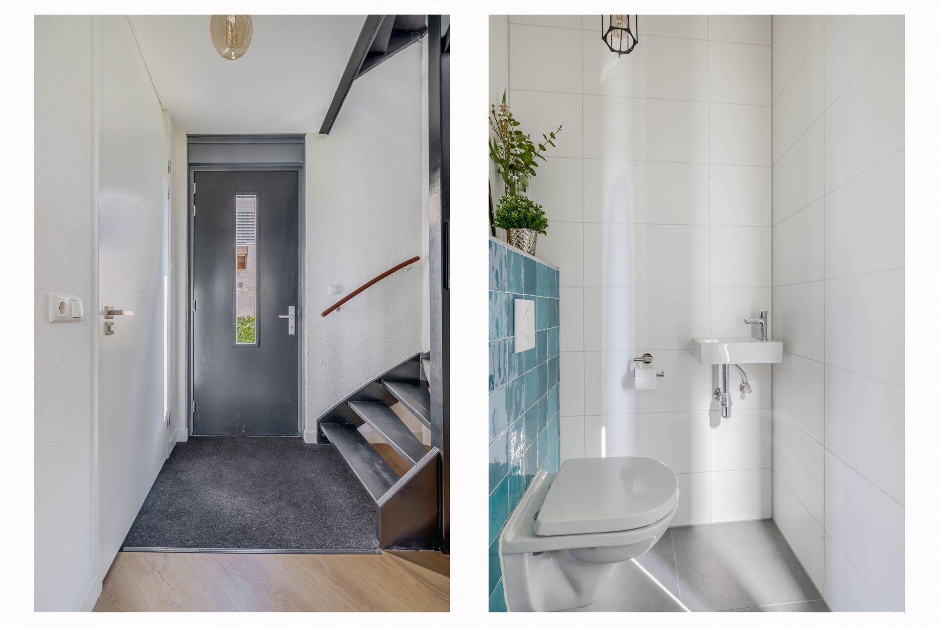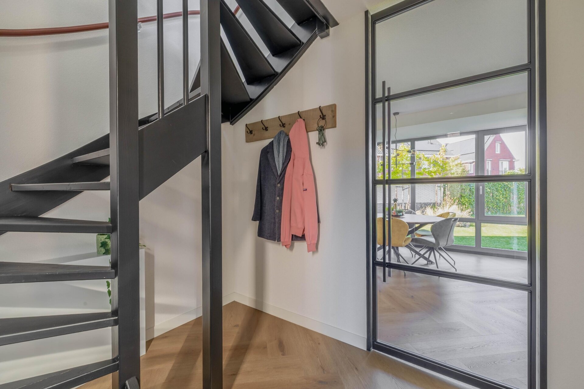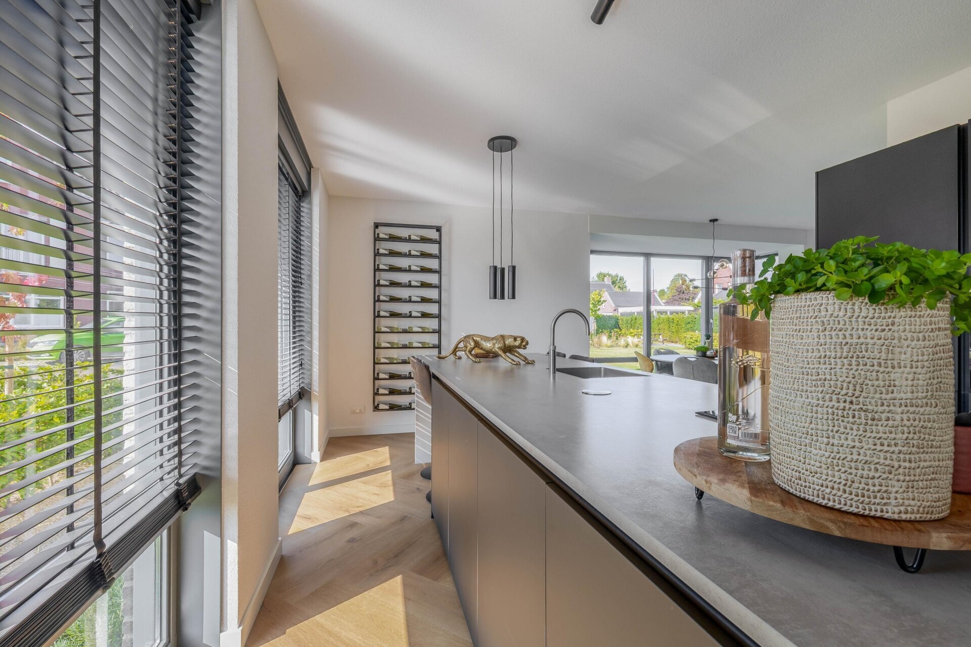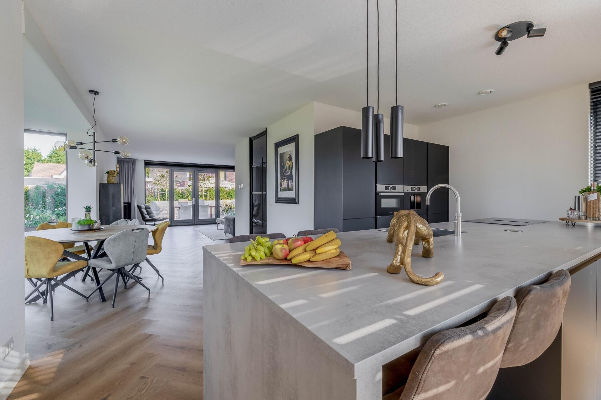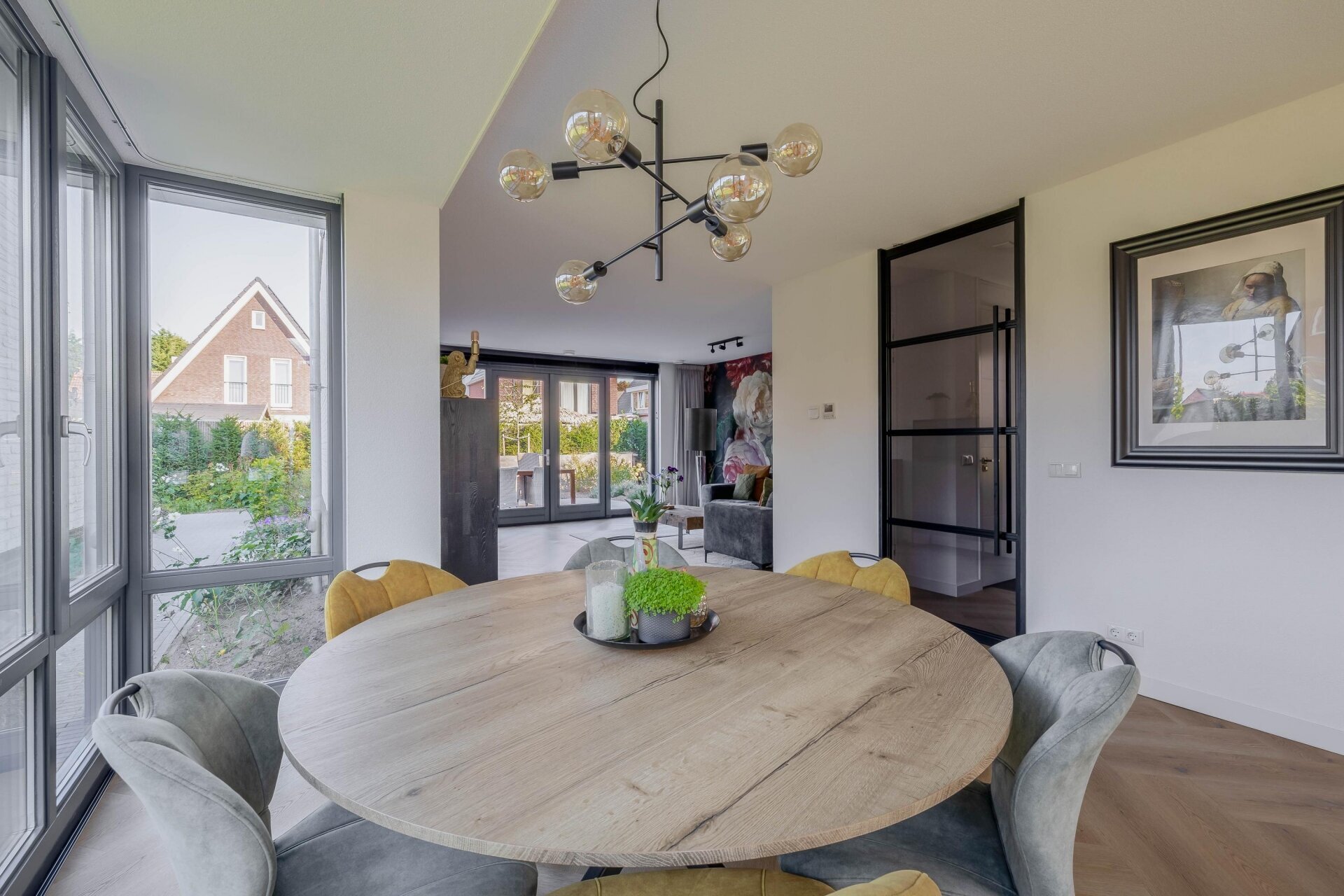 Binnenkomend in de ruime hal valt meteen de stijlvolle afwerking op: gestuukte wanden, een visgraat pvc-vloer en zwarte stalen binnendeuren. De woonkamer is tuingericht, met openslaande deuren naar het terras. Dankzij de grote raampartijen komt er volop natuurlijk licht binnen.