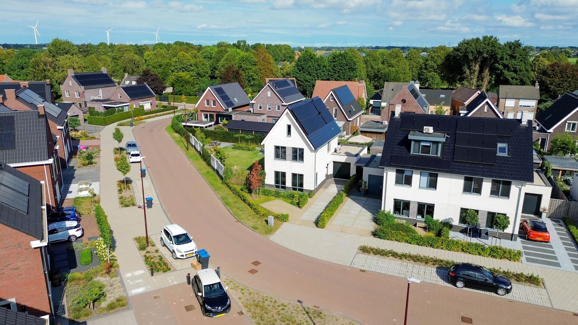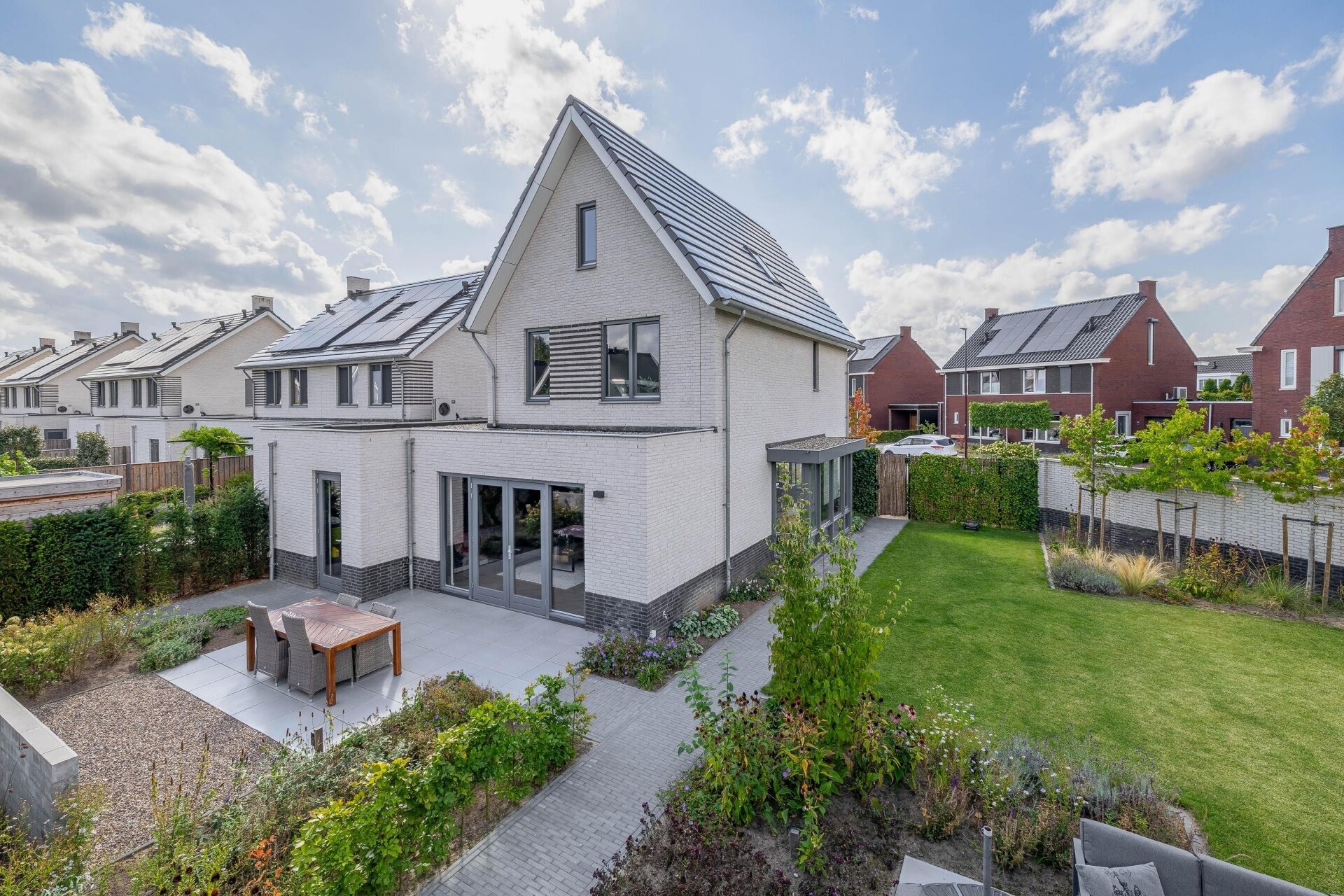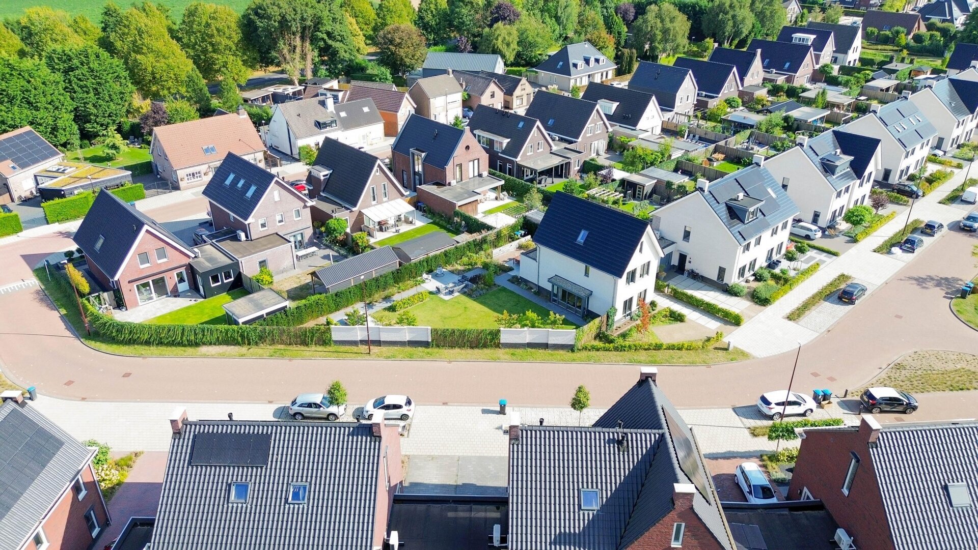 De gevels zijn fris wit gemetseld, wat mooi contrasteert met het zwarte pannendak en de donkere kozijnen. De ligging aan een rustige straat in een kindvriendelijke woonwijk maakt dit huis bijzonder aantrekkelijk voor doorstromers die meer ruimte én comfort zoeken.