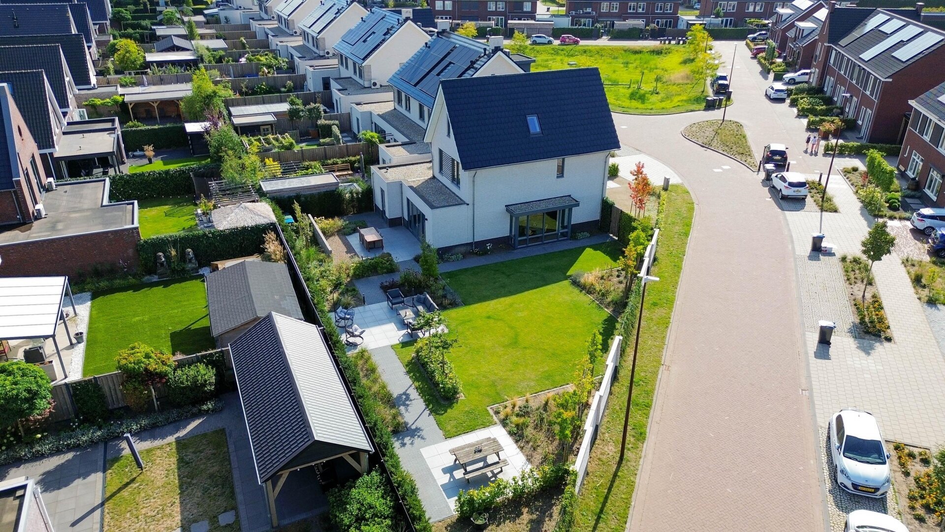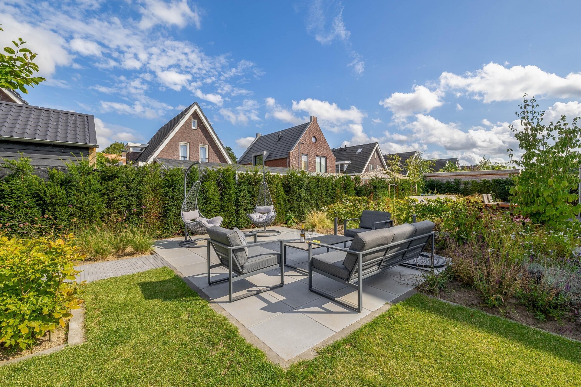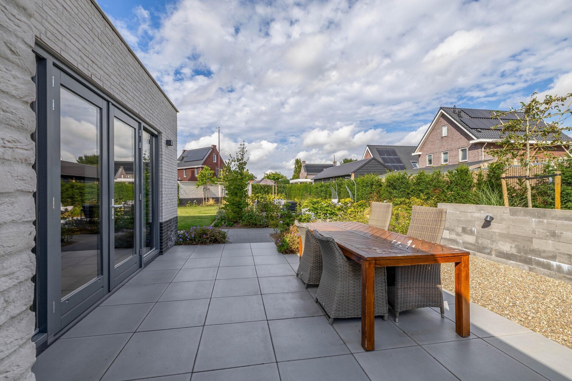 De tuin is modern aangelegd met meerdere terrassen, een strak gazon en volwassen beplanting. Er staat geen aparte berging in de tuin, maar dankzij de aangebouwde garage heb je voldoende praktische opbergruimte. De brede oprit biedt plaats aan circa vier auto’s op eigen terrein.
