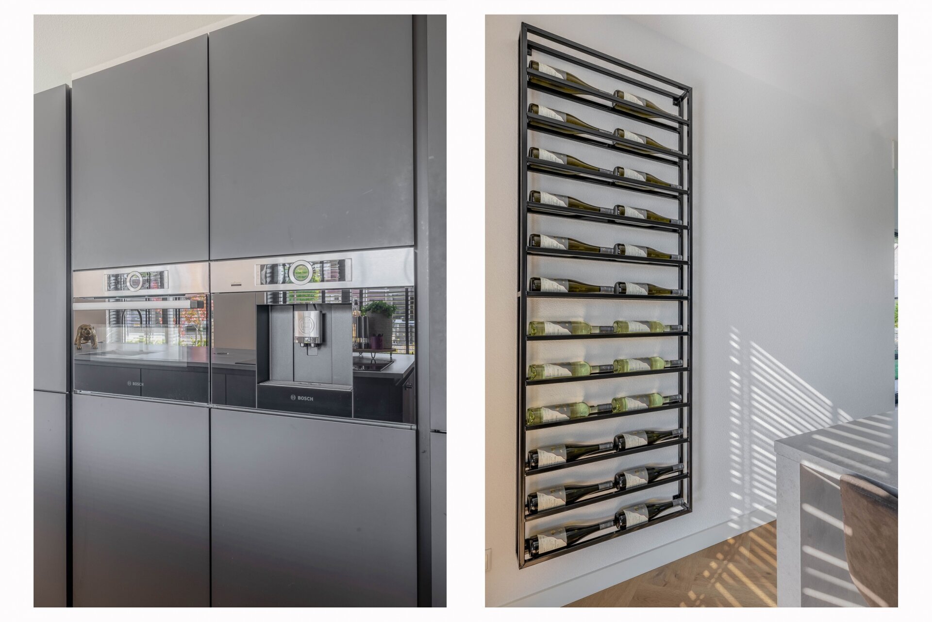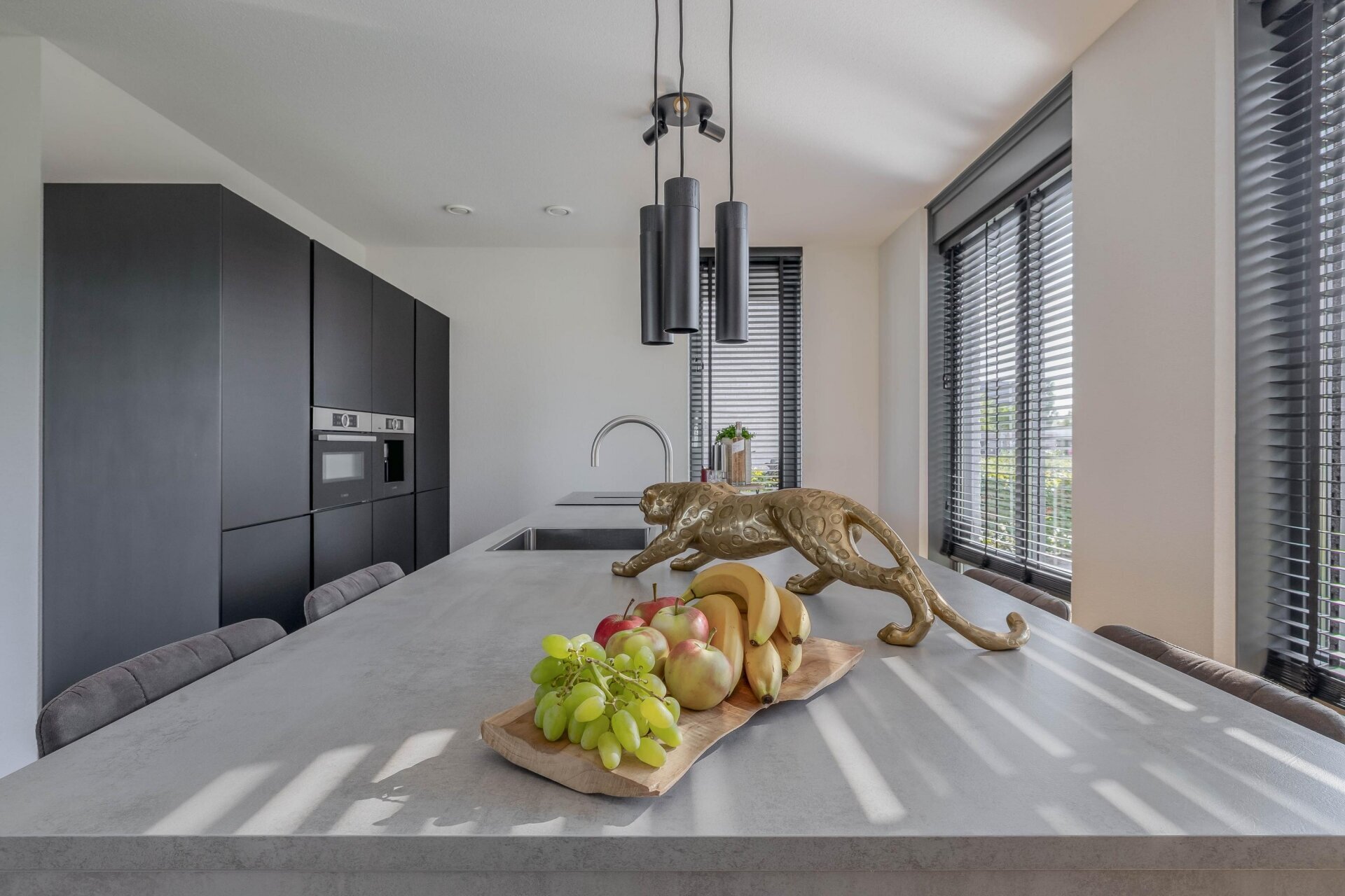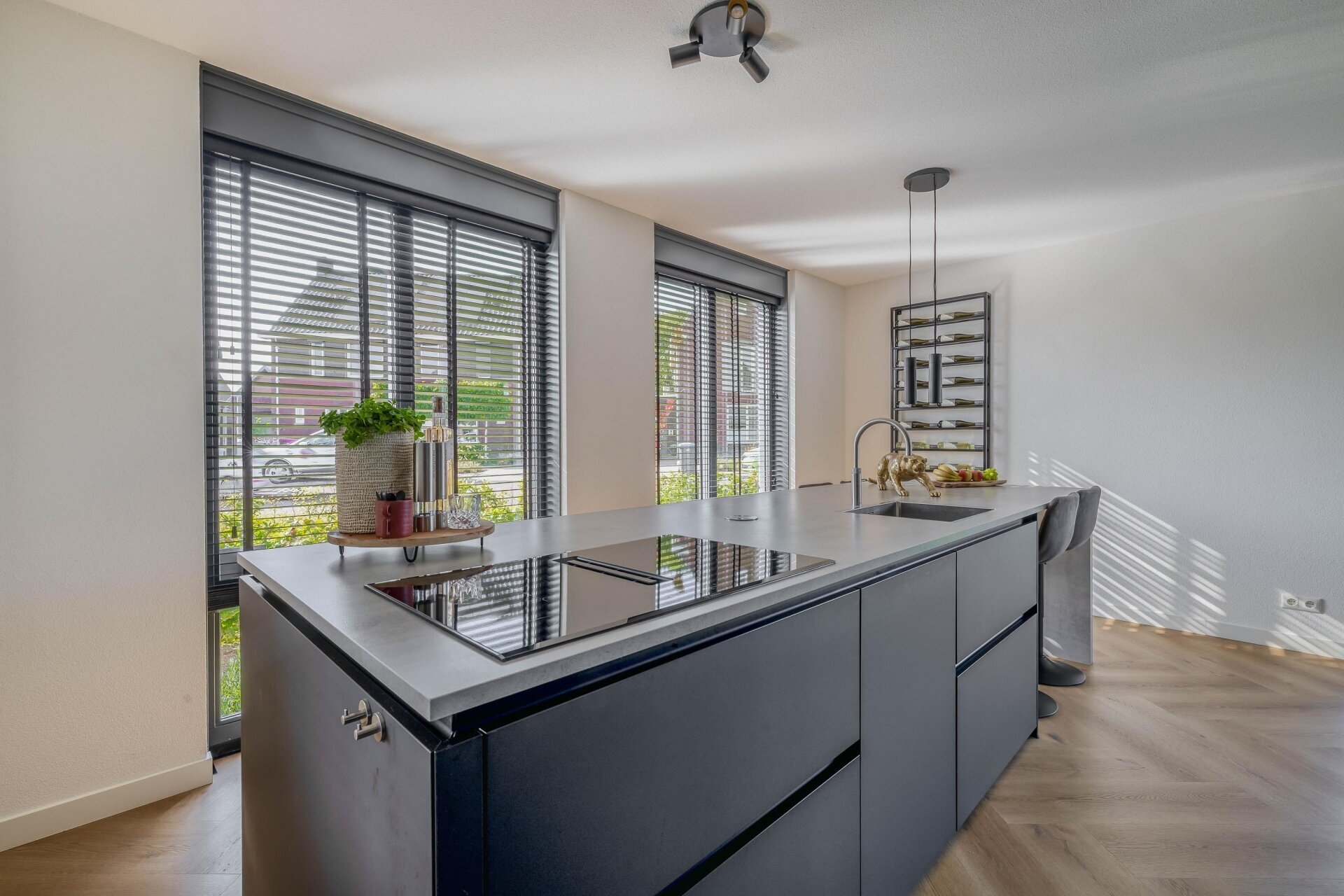 Aan de voorzijde van het huis vind je de luxe open keuken met een royaal kookeiland. De afwerking is modern en strak, met matte zwarte kasten en hoogwaardige inbouwapparatuur, waaronder een inductiekookplaat met geïntegreerde afzuiging, combi-oven, koelkast, vriezer, quooker en een volautomatisch koffiesysteem. Een droomkeuken voor elke kookliefhebber.