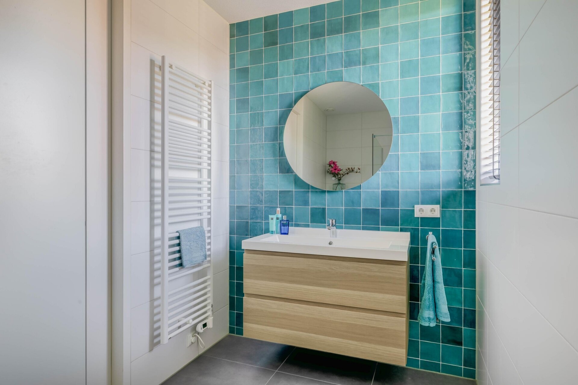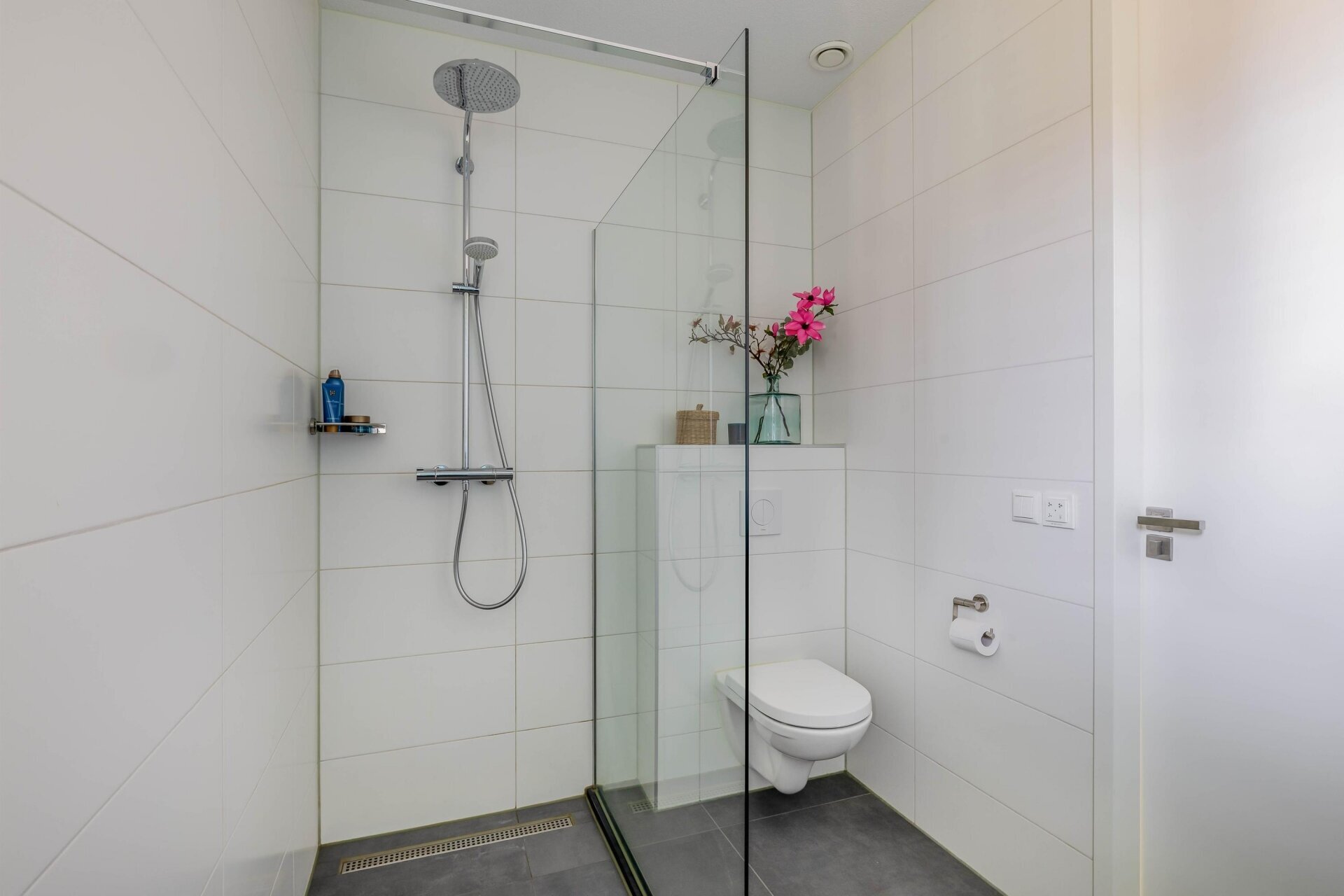 De eerste verdieping biedt drie slaapkamers, waarvan de grootste is voorzien van een royale inloopkast. De badkamer is strak afgewerkt en voorzien van een inloopdouche, een enkele wastafel met meubel en een toilet. Voor extra comfort is hier een elektrische radiator geplaatst, ideaal tijdens koude ochtenden of frisse dagen.