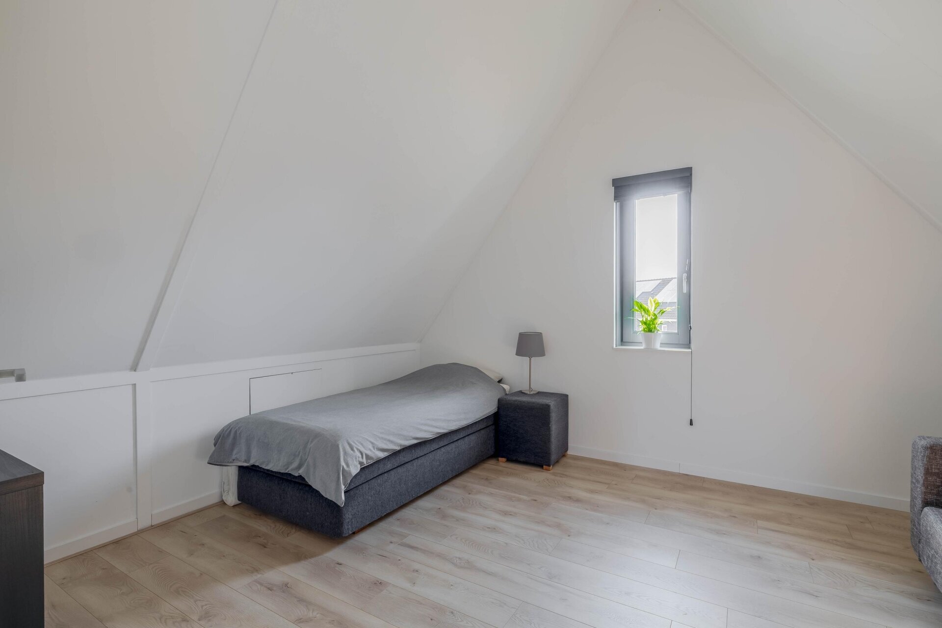 Op de tweede verdieping bevindt zich één volwaardige slaapkamer. De tweede kamer op deze verdieping is ingericht als technische ruimte met de opstelling voor de wasmachine, de warmtepomp, het WTW-systeem en de omvormer van de zonnepanelen. Er zijn geen dakkapellen aanwezig, maar de rechte gevels en goede plafondhoogte zorgen voor voldoende ruimte en lichtinval.