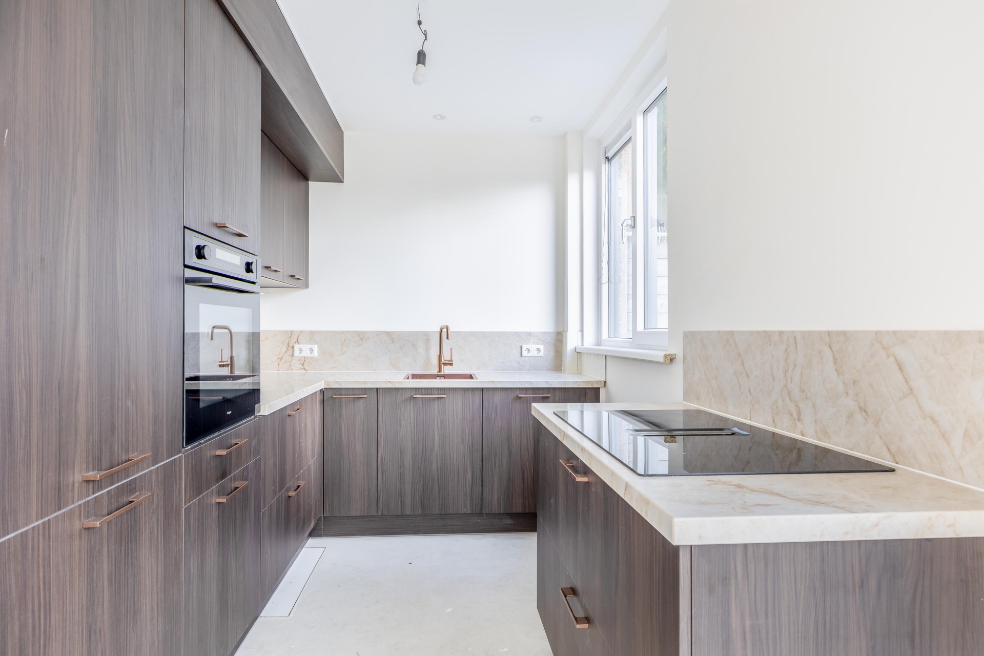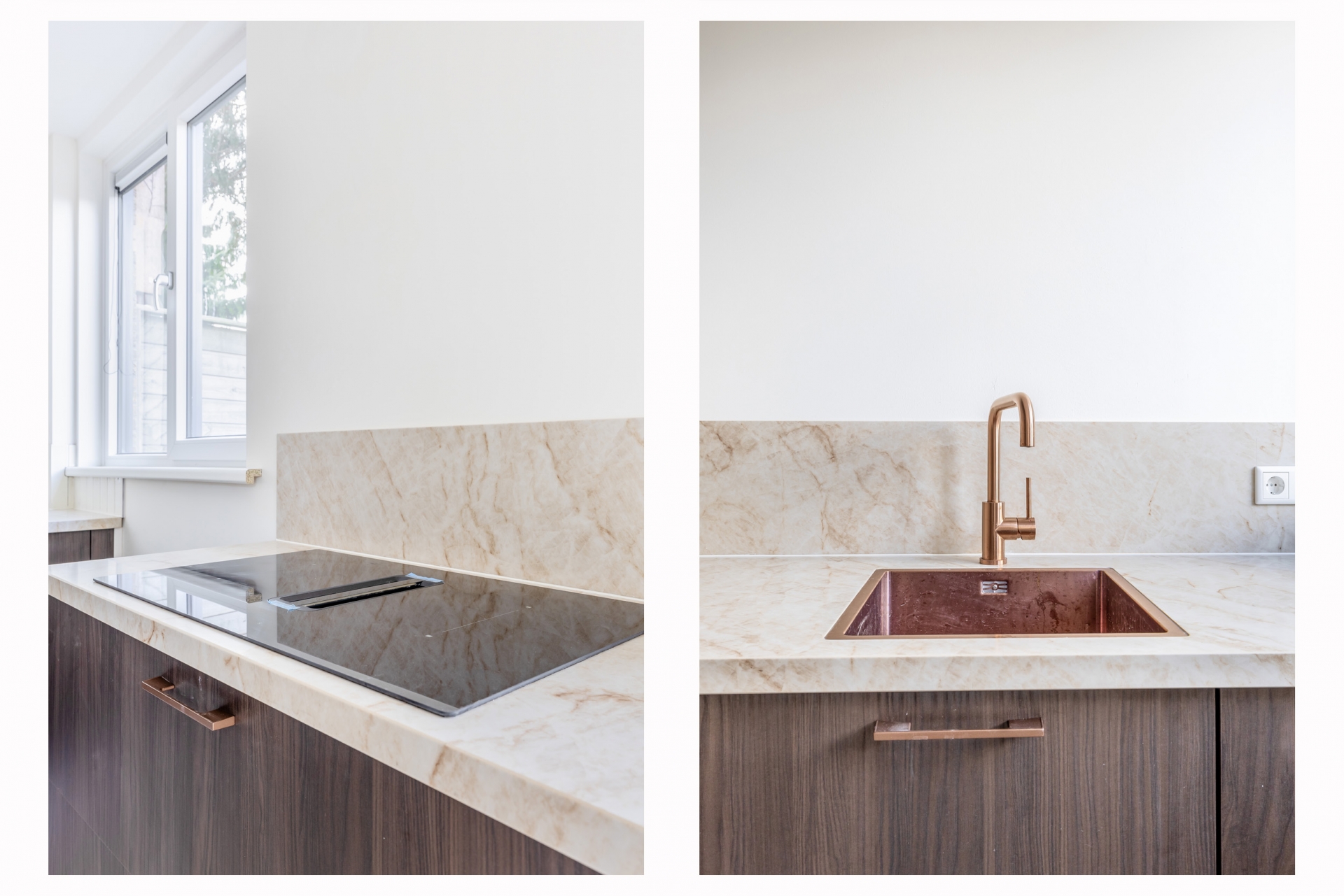 De keuken is een echte eyecatcher en sluit perfect aan bij de moderne uitstraling van het huis. Hier is gekozen voor walnoothout in combinatie met subtiele rosékleurige accenten, wat direct zorgt voor een warme en luxe sfeer. Het werkblad van keramiek met zandkleurige marmerlook geeft het geheel een stijlvolle uitstraling en maakt het een fijne plek om te koken en samen te komen.