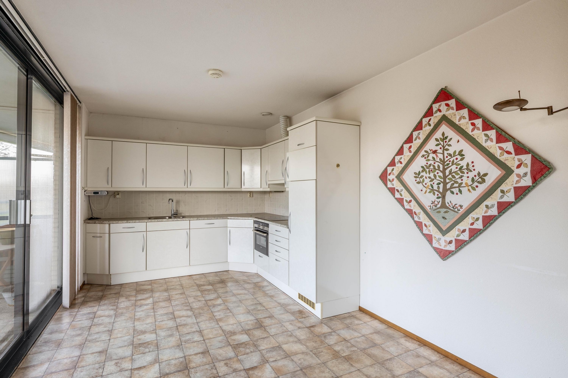 De halfopen keuken heeft een fijne maatvoering en biedt volop kastruimte en werkblad. Hier is ruimte genoeg om een eethoek te plaatsen, waardoor het echt een woonkeuken wordt.