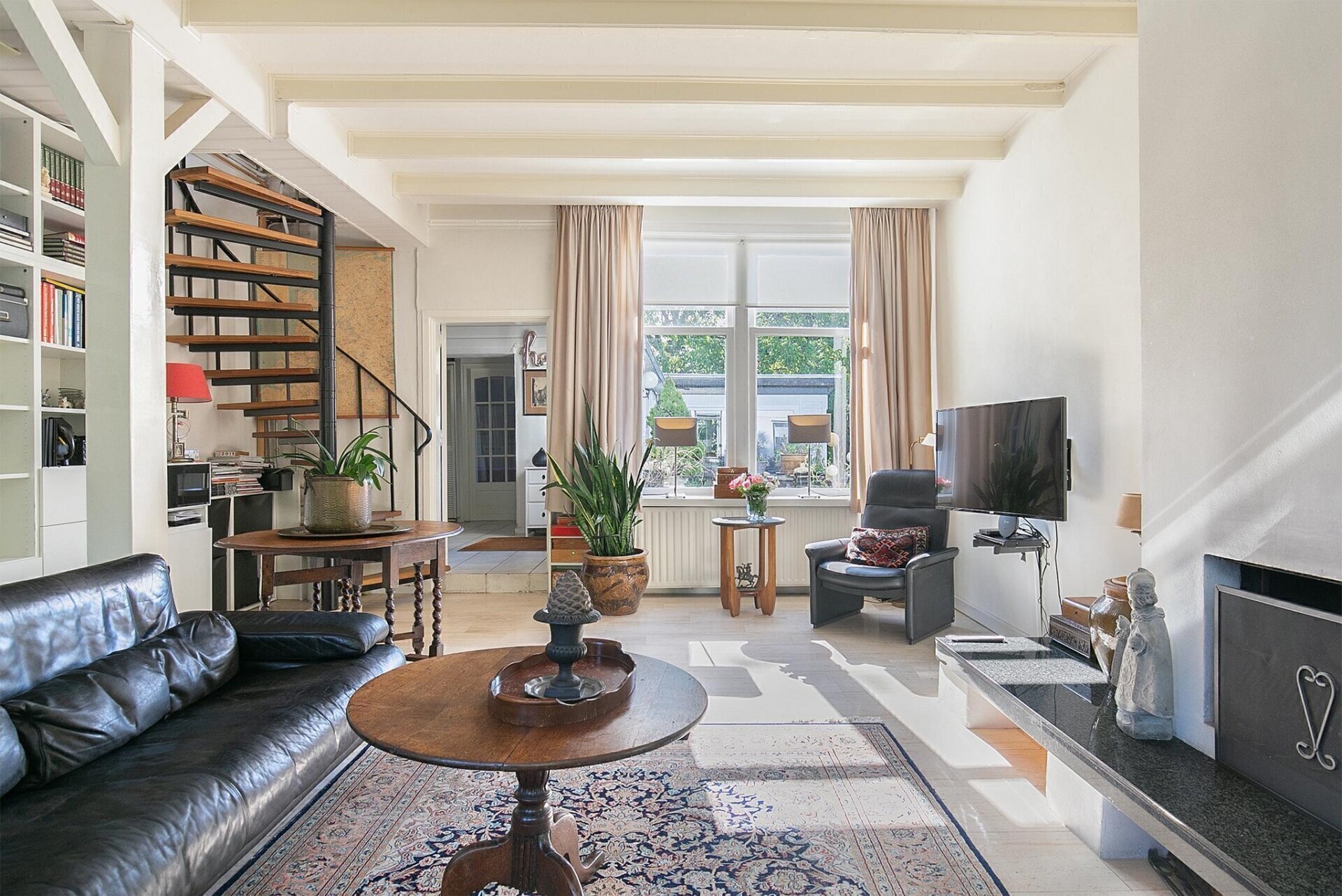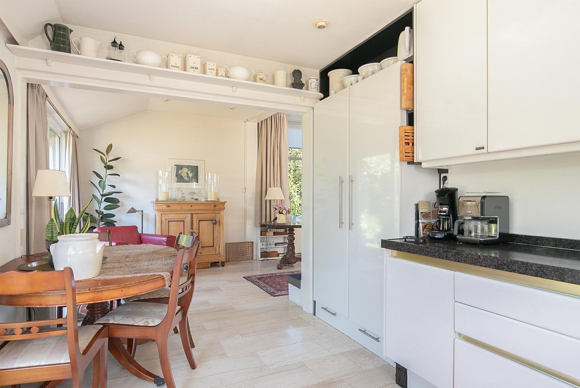 De hal geeft u toegang tot de ingang van de woonkamer, toiletruimte en een slaapkamer met badkamer op de begane grond. De gehele vloer op de begane grond is vervangen voor een betonnen vloer met vloerverwarming. De toiletruimte is volledig betegeld en voorzien van een hangcloset, fontein en radiator. De sfeervolle, royale L-vormige woonkamer heeft een mooie lichtinval en is voorzien van een marmeren vloer, openhaard, hoog balkenplafond en een halfopen keuken. Aan de tuinzijde van de woonkamer is de halfopen keuken gesitueerd, uitgevoerd in een hoekopstelling welke is afgewerkt een granieten werkblad. De keuken is voorzien een vaatwasser, keramische kookplaat, dubbele wasbak, afzuigkap, oven, inbouwkoelkast en voldoende bergruimte. Een tweetal schuifpuien geven u vanuit de keuken toegang naar de riante tuin rondom. Slaapkamer 1 op de begane grond is afgewerkt met een tegelvloer, grote raampartijen en hoog plafond. De badkamer is volledig betegeld en voorzien van een ligbad met glazen scherm, douchecabine, wastafelmeubel en spiegelkast. Aan de badkamer grenst de serre/tuinkamer, waar u kunt genieten van het uitzicht op de prachtige tuin.