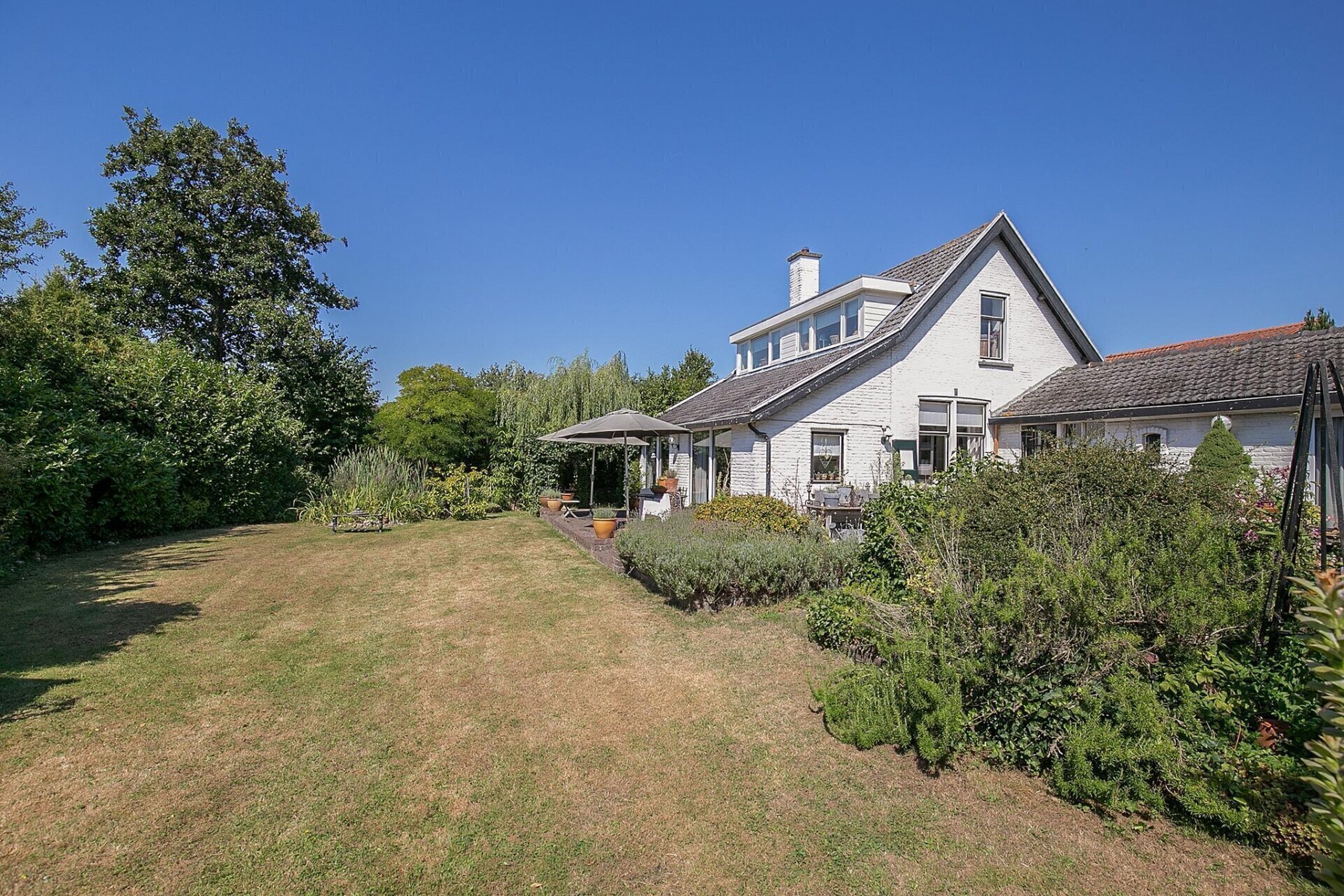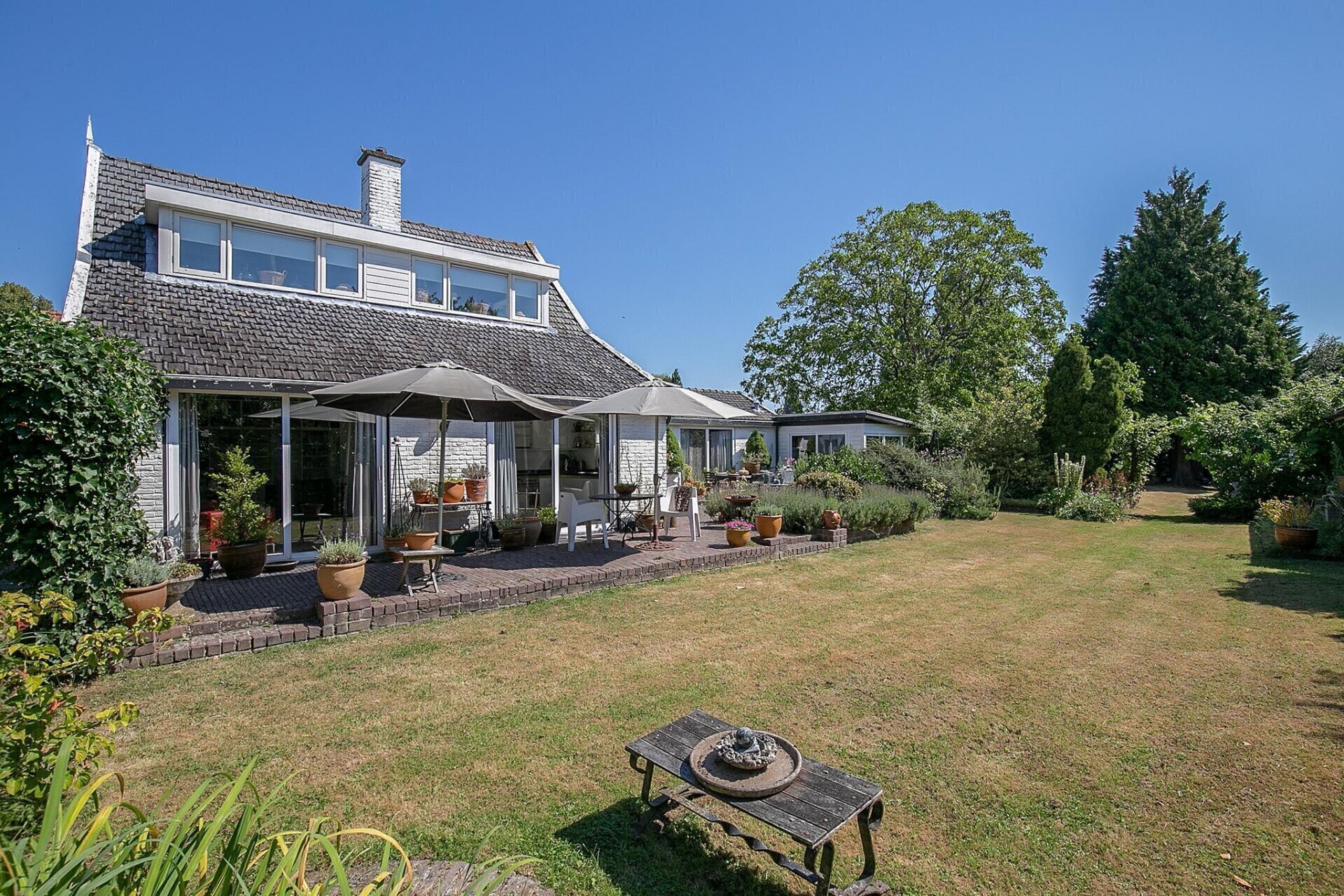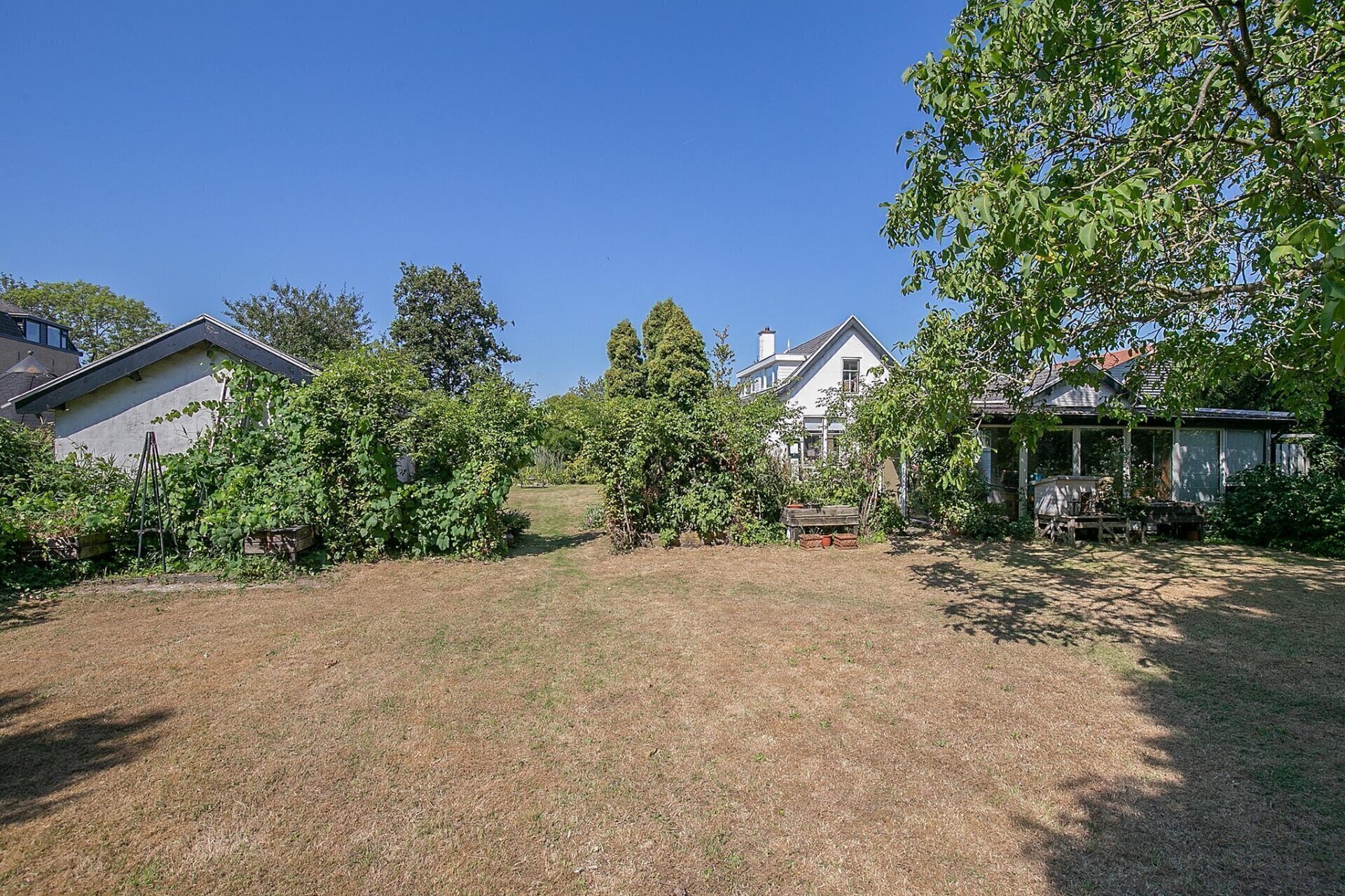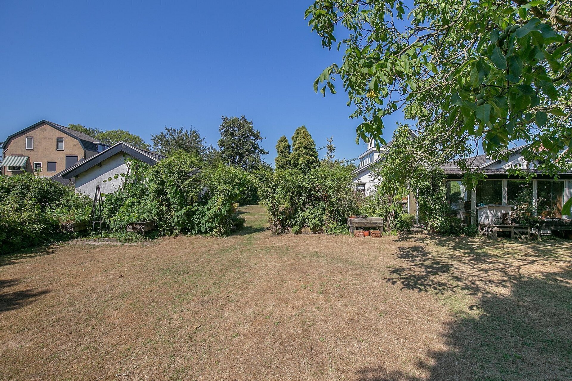Een grote tuin zoals deze, biedt op ieder moment van de dag zon. De tuin is netjes onderhouden en er zijn diverse zitjes gecreëerd, zodat u gedurende de dag altijd een plekje in de zon of schaduw kunt opzoeken. Mocht u woon-werken willen combineren, de 2 grote schuren die gesitueerd zijn op de achterzijde van het perceel zijn zeer geschikt als werkplek. De uitrit aan de achterzijde van het perceel geeft u de mogelijkheid werk en privé toch gescheiden te houden.
