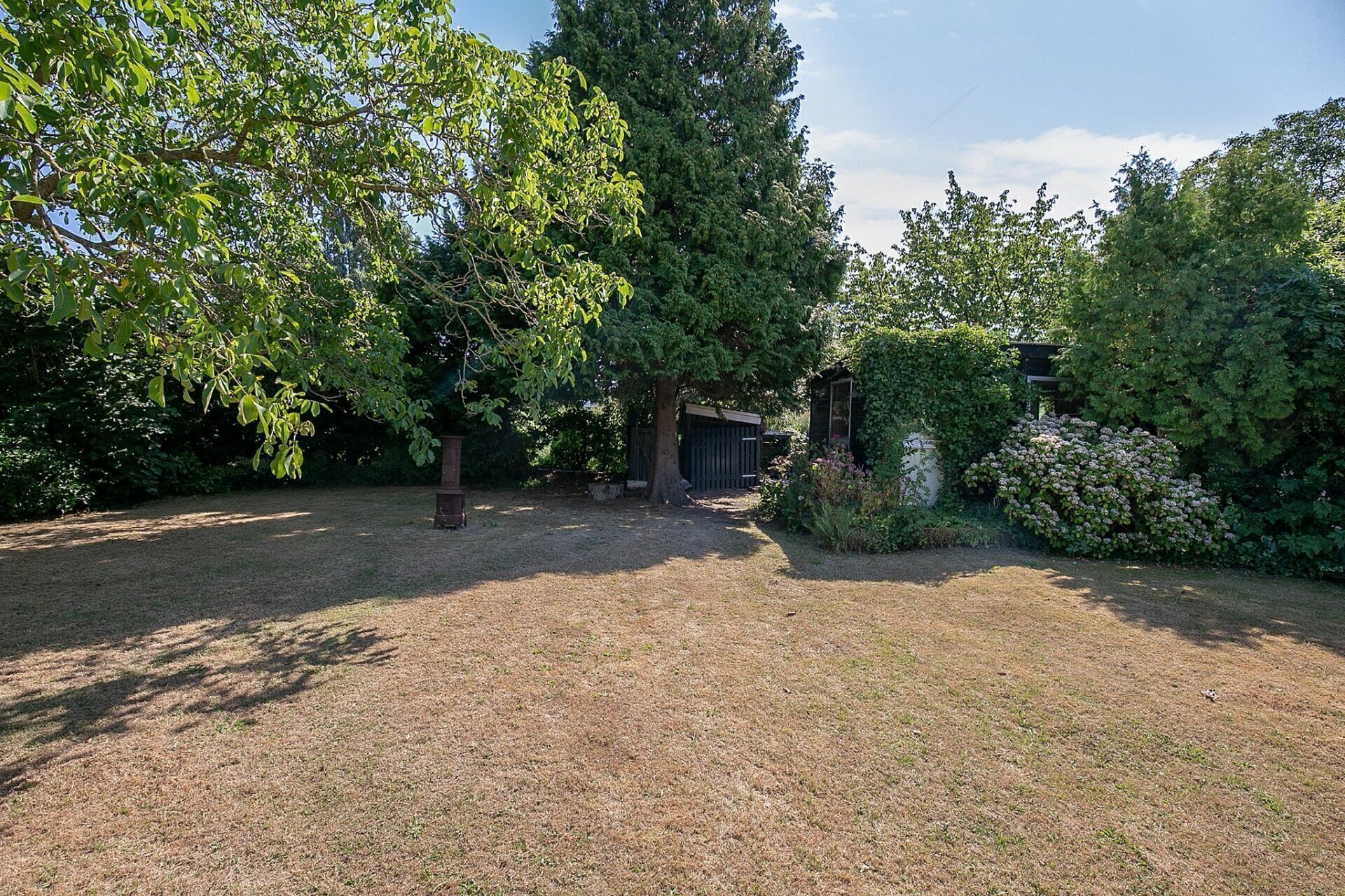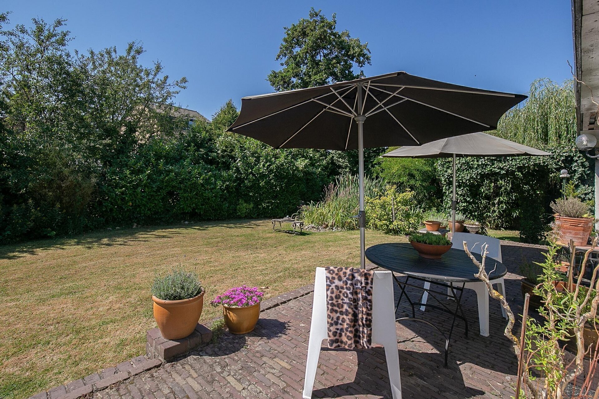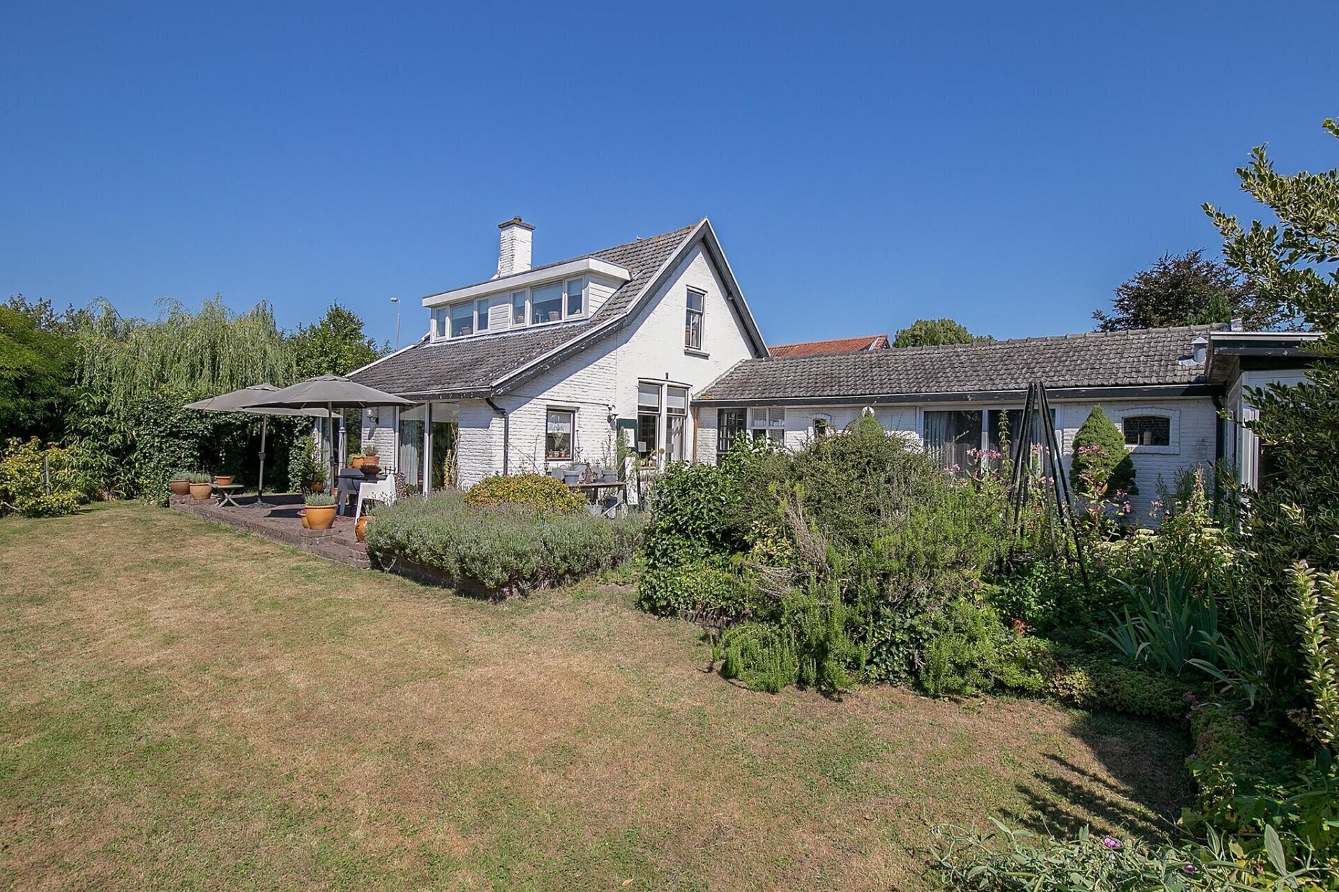 Een grote tuin zoals deze, biedt op ieder moment van de dag zon. De tuin is netjes onderhouden en er zijn diverse zitjes gecreëerd, zodat u gedurende de dag altijd een plekje in de zon of schaduw kunt opzoeken. Mocht u woon-werken willen combineren, de 2 grote schuren die gesitueerd zijn op de achterzijde van het perceel zijn zeer geschikt als werkplek. De uitrit aan de achterzijde van het perceel geeft u de mogelijkheid werk en privé toch gescheiden te houden.