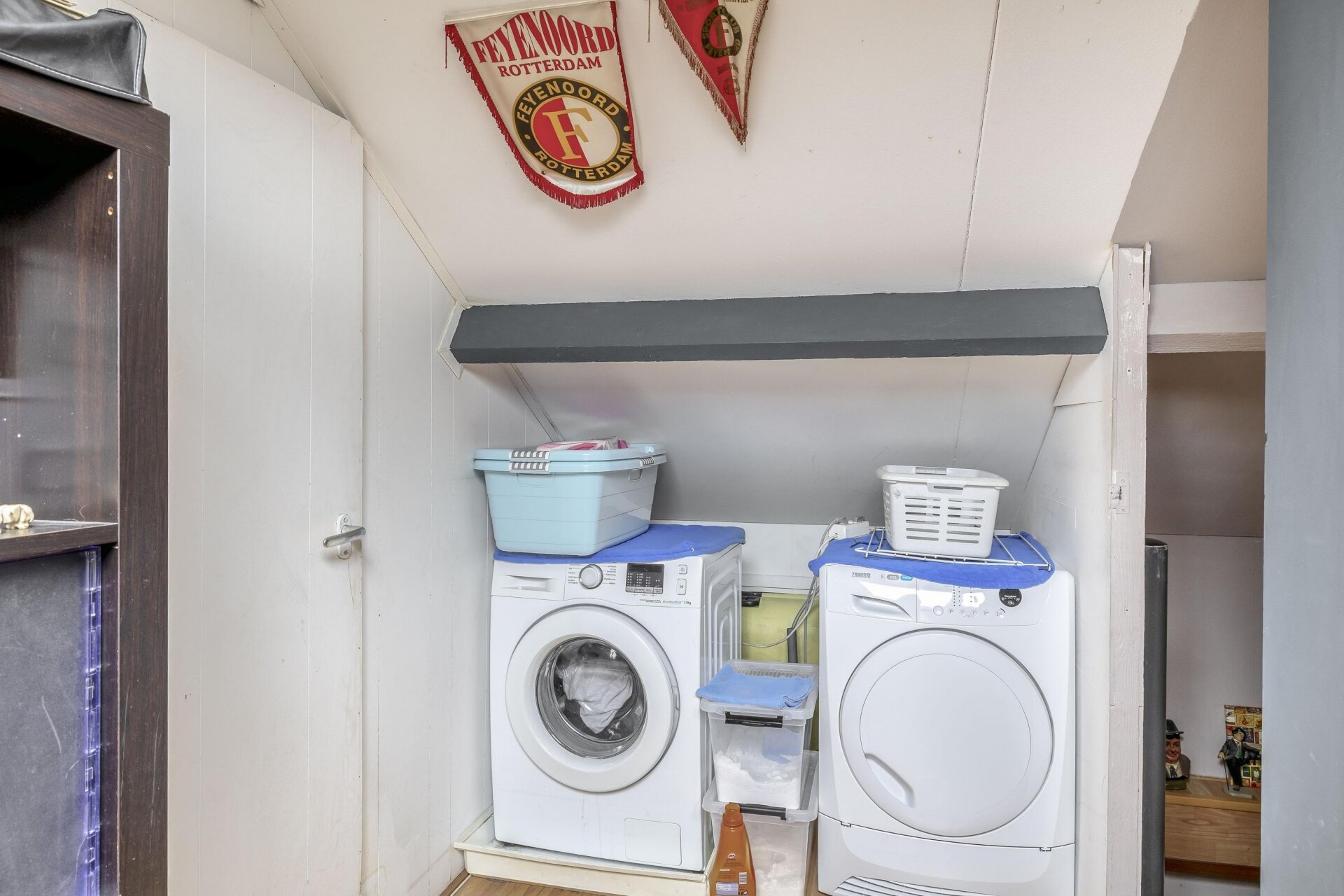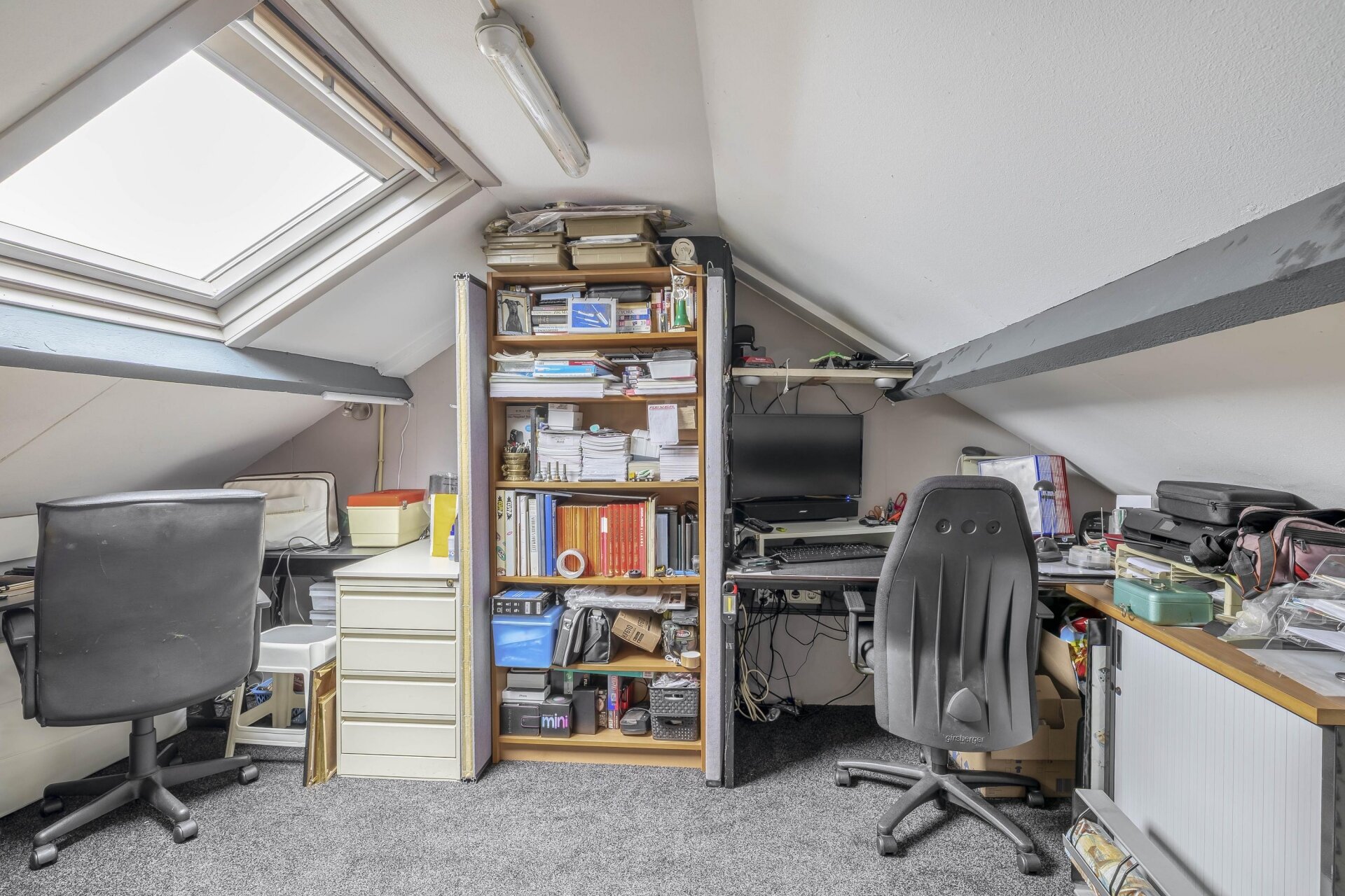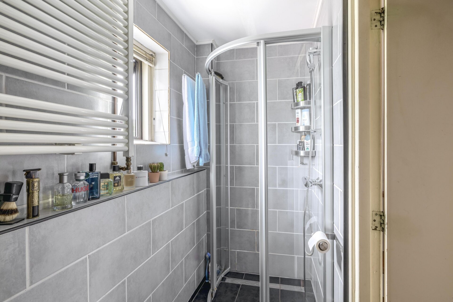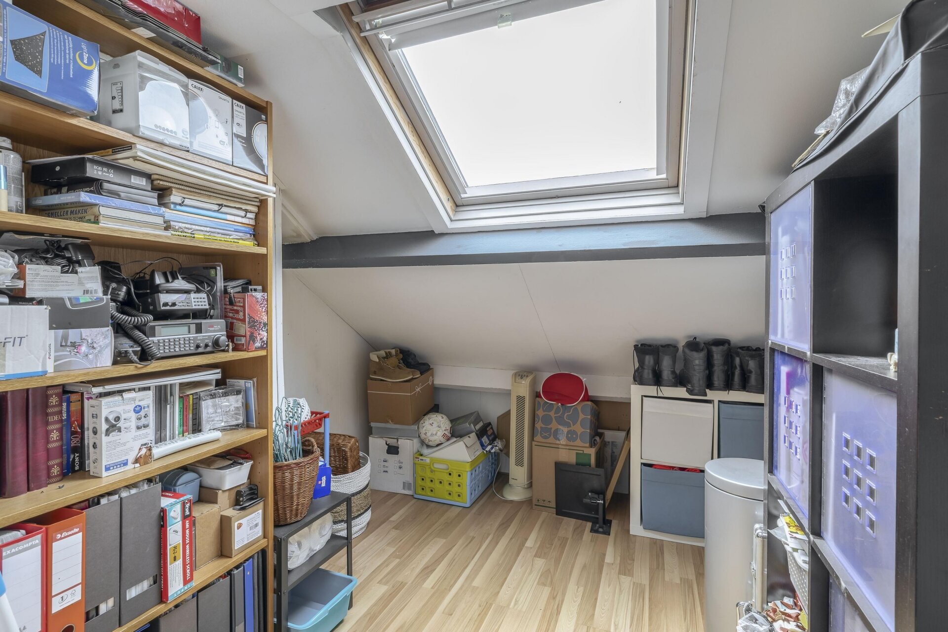 Op de eerste verdieping vind je twee slaapkamers, waarvan één met schuifkastenwand. Daarnaast is er een voorraadkast en een nette badkamer met wastafel, douche en een sanibroyeur-toilet. Op zolder vind je de voorzolder met wasmachineaansluiting en een derde slaapkamer met dakraam en cv-ketel (circa 2010). Dankzij de vaste trap en goede lichtinval is dit een volwaardige verdieping die zich uitstekend leent voor logees, werkruimte of tienerkamer.