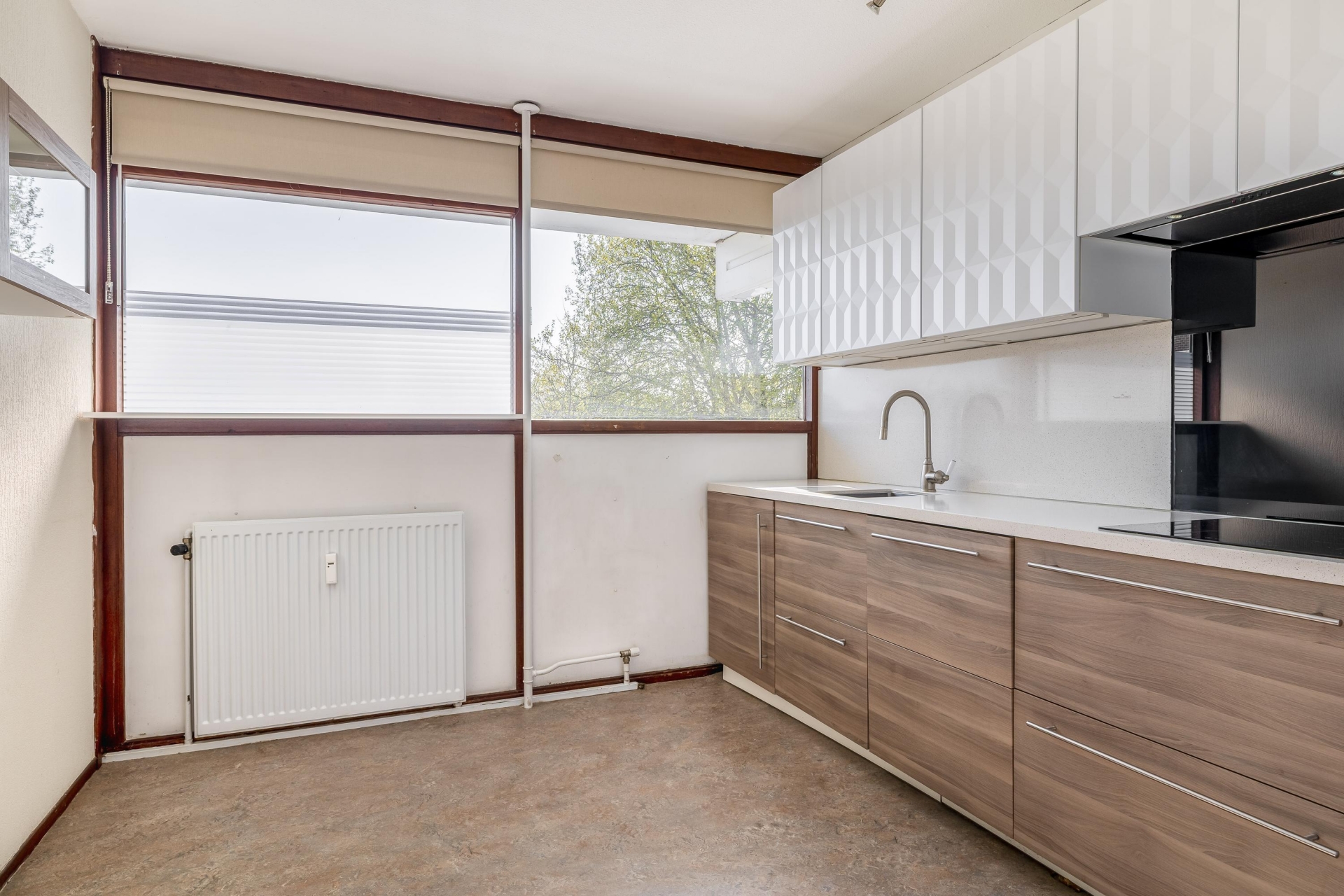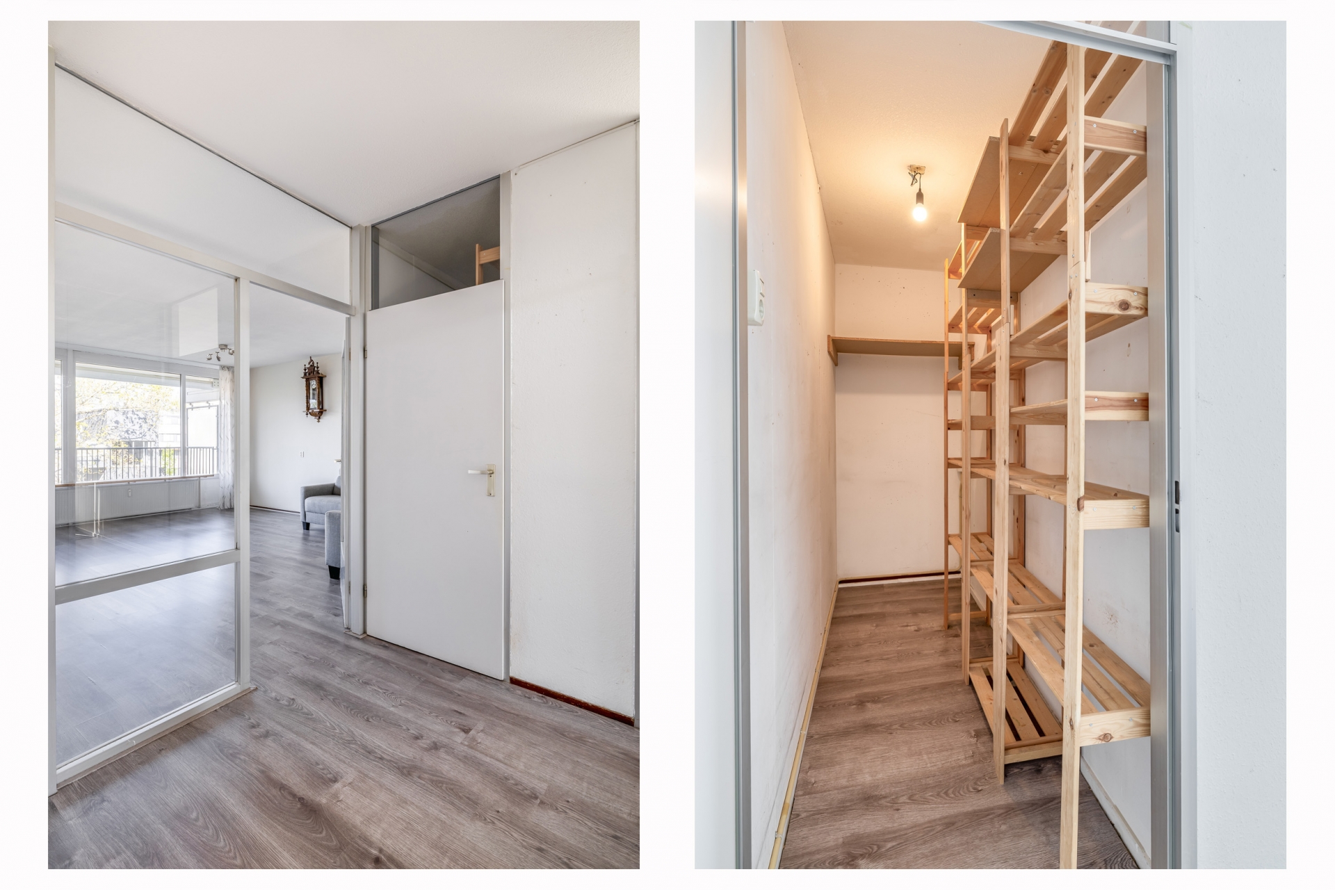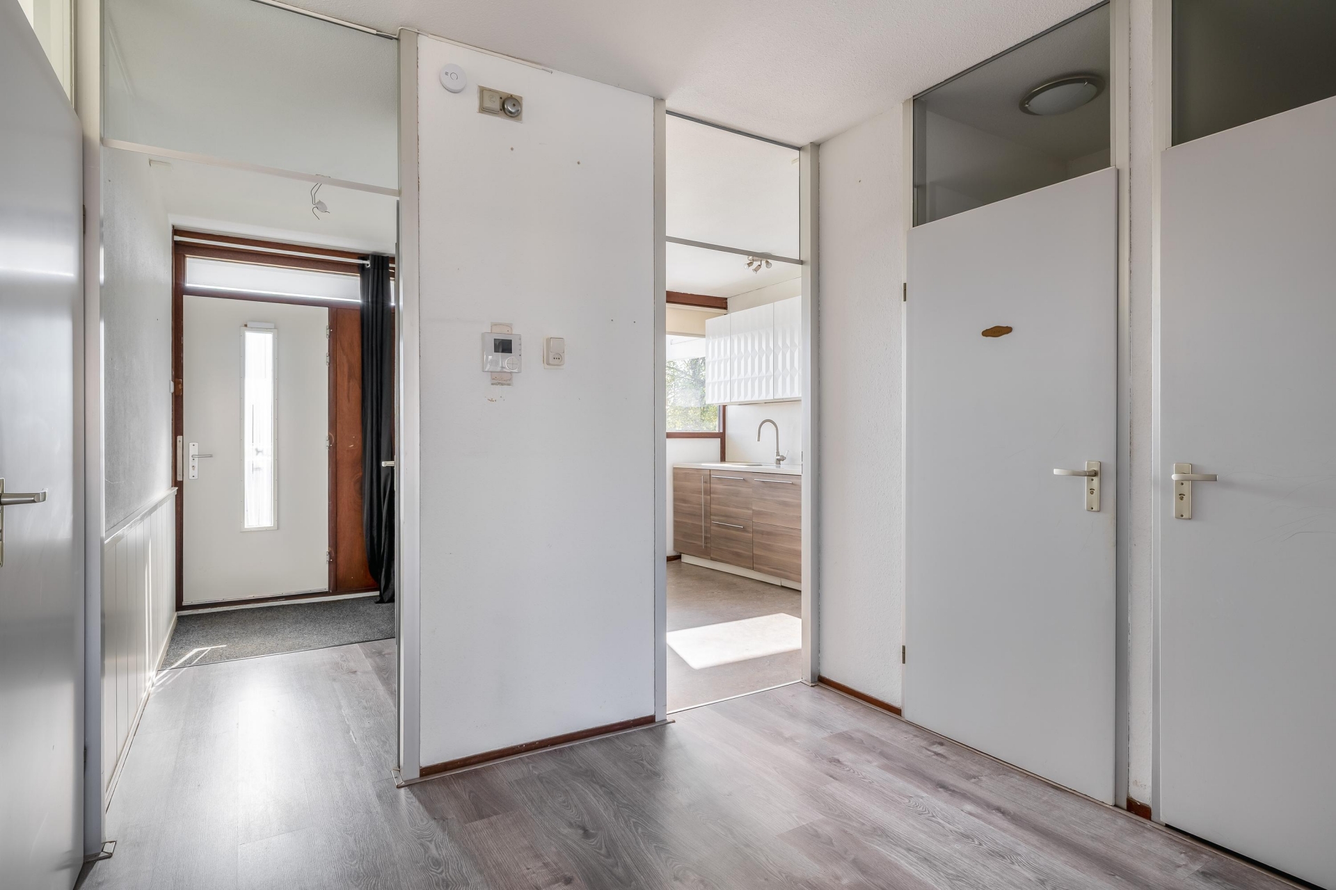 Zodra je de woonkamer binnenstapt valt direct de hoeveelheid licht op. De grote raampartijen zorgen voor een prettige, open sfeer en een vrij uitzicht over de omgeving. Hier richt je eenvoudig een ruime zit- en eethoek in, waarbij er genoeg plek is voor zowel ontspannen avonden als gezellig bezoek.