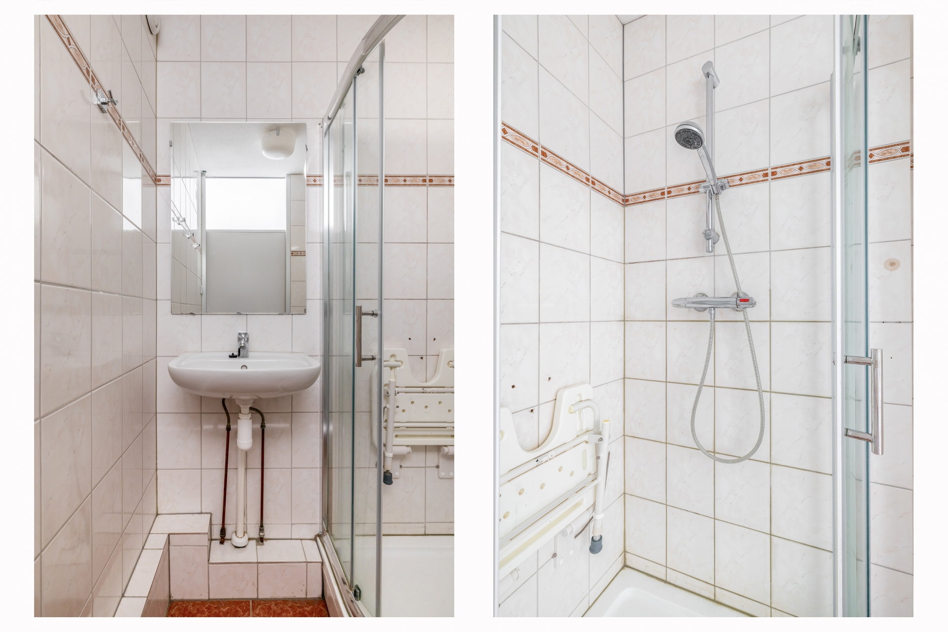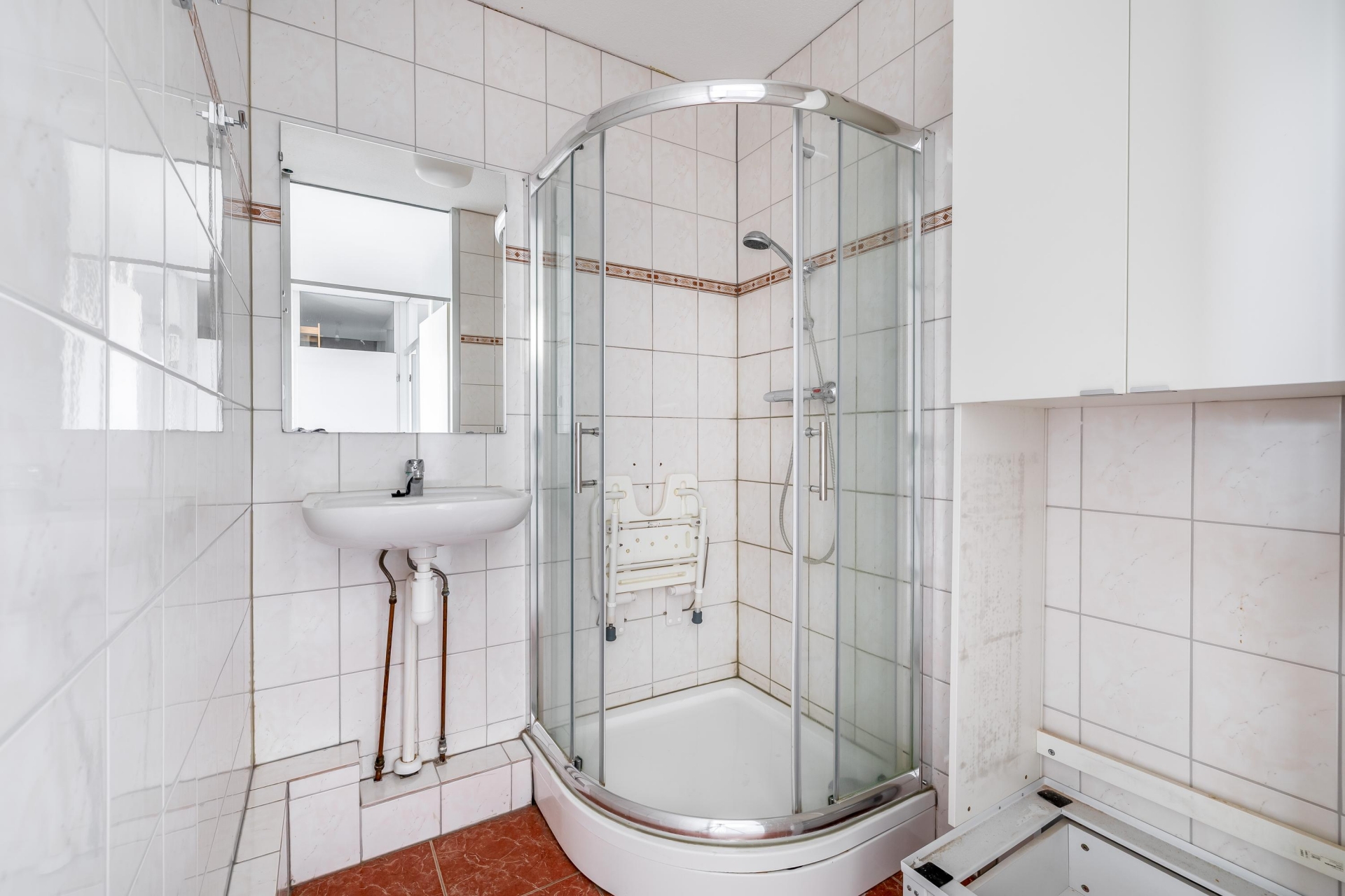 De badkamer is functioneel ingericht met een douche en wastafel. Alles wat je nodig hebt is aanwezig en ook hier geldt: netjes en praktisch, met mogelijkheden om het naar wens te moderniseren.