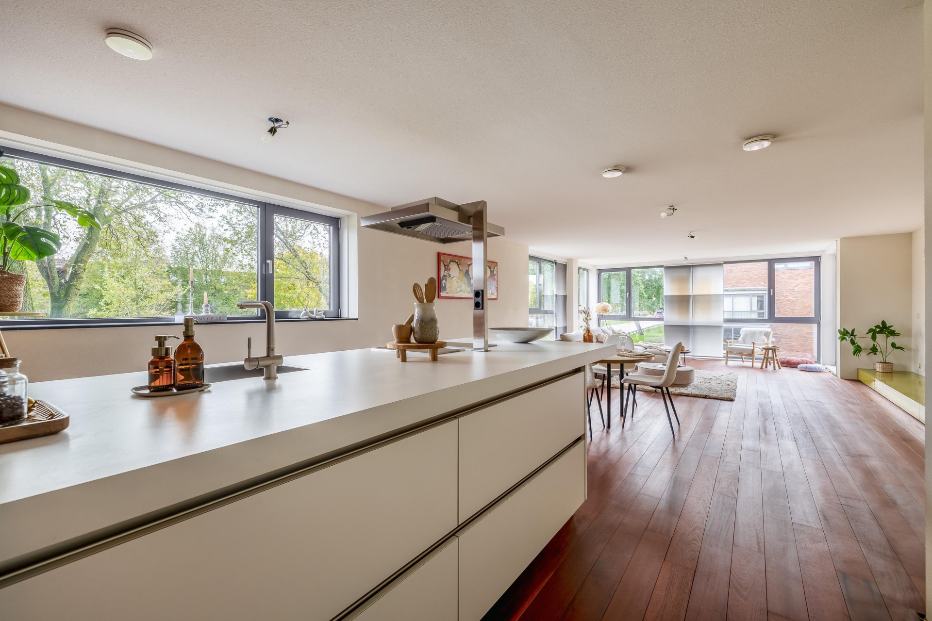Zodra je binnenkomt, valt de hoogwaardige afwerking direct op. De hardhouten vloer loopt als een warme basis door het gehele appartement. De binnendeuren (slechts 2) zijn taats gescharnierd en voorzien van verzonken grepen, een stijlvol detail dat zorgt voor een strakke en luxe uitstraling. De ruime living biedt volop mogelijkheden voor een gezellige zit- en eethoek en wordt van nature royaal verlicht door de vele ramen aan meerdere zijden. Hier ervaar je echt het loftgevoel: open, licht en ruim.