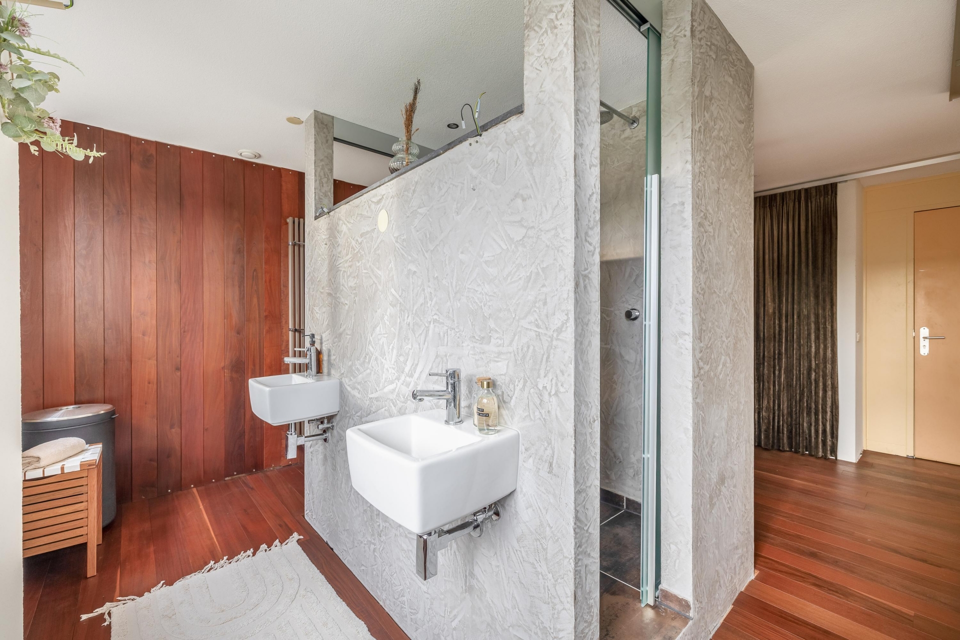 Ook in de badkamer zie je dat er is gekozen voor kwaliteit en sfeer. De dubbele douche is praktisch én luxe, en de wanden zijn strak afgewerkt met betonciré: stoer, onderhoudsvriendelijk en helemaal van nu. De ruimte voelt aan als een persoonlijke spa: minimalistisch, functioneel en stijlvol ingericht. Alles is tot in de puntjes verzorgd.