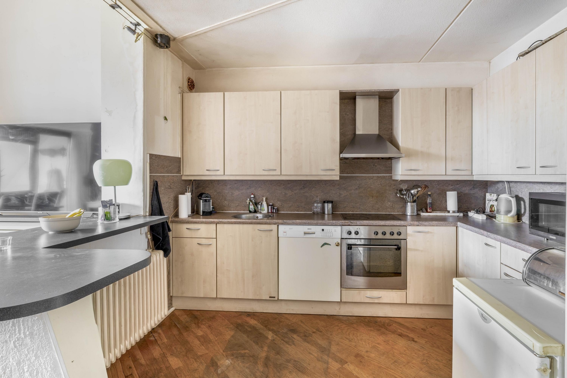 Een verdieping hoger is de woonkamer met hoog plafond en grote raampartijen te vinden. De keuken is functioneel opgezet in een hoekopstelling met veel kastruimte en inbouwapparatuur. De bar tussen keuken en woonkamer maakt het extra gezellig: ideaal voor een snel ontbijt of een drankje met vrienden. De ruimte is voorzien van een houten vloer en een neutrale afwerking die je eenvoudig naar je eigen smaak kunt stylen. Ook een openhaard ontbreekt niet: een sfeervolle toevoeging die voor extra warmte zorgt in de wintermaanden.