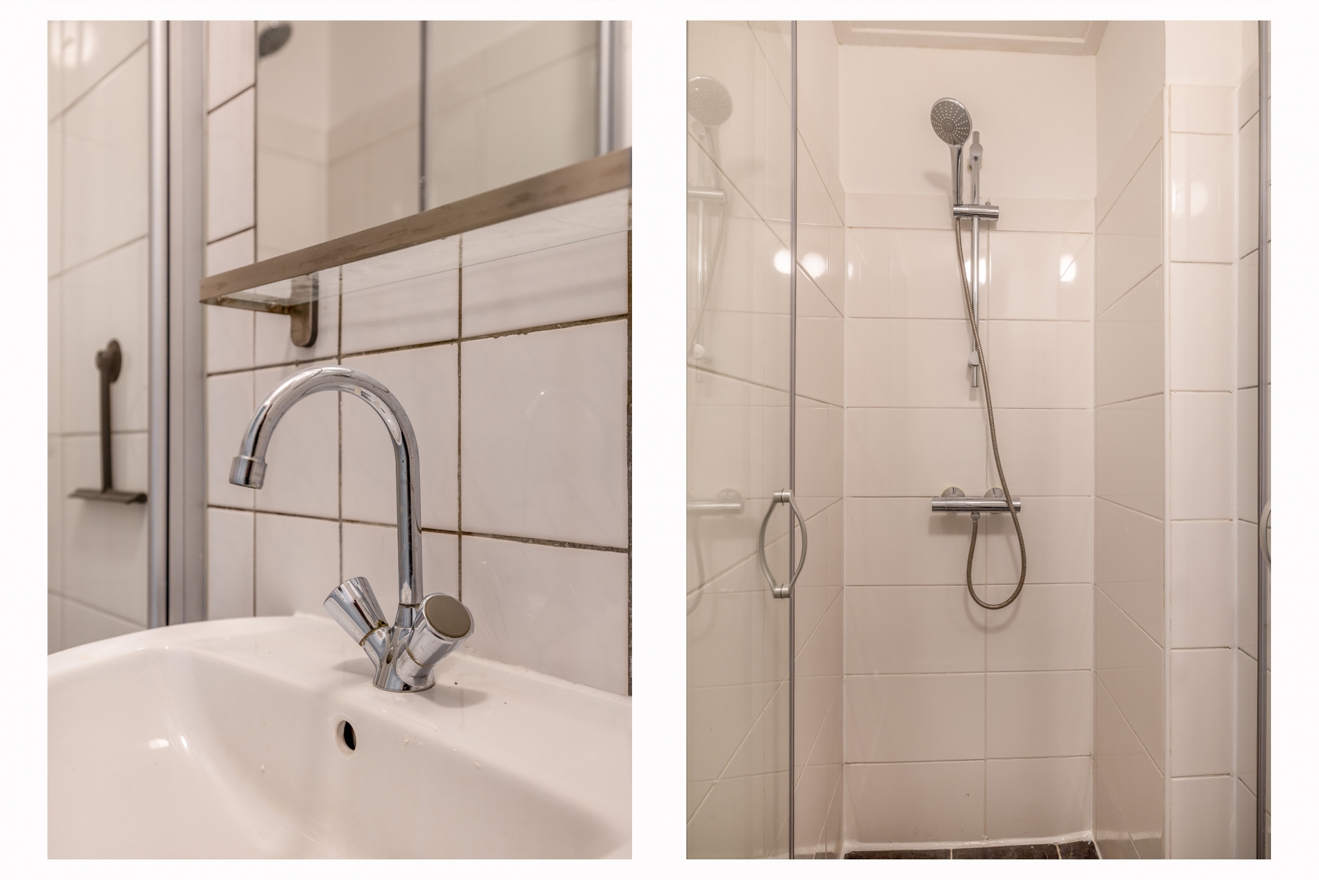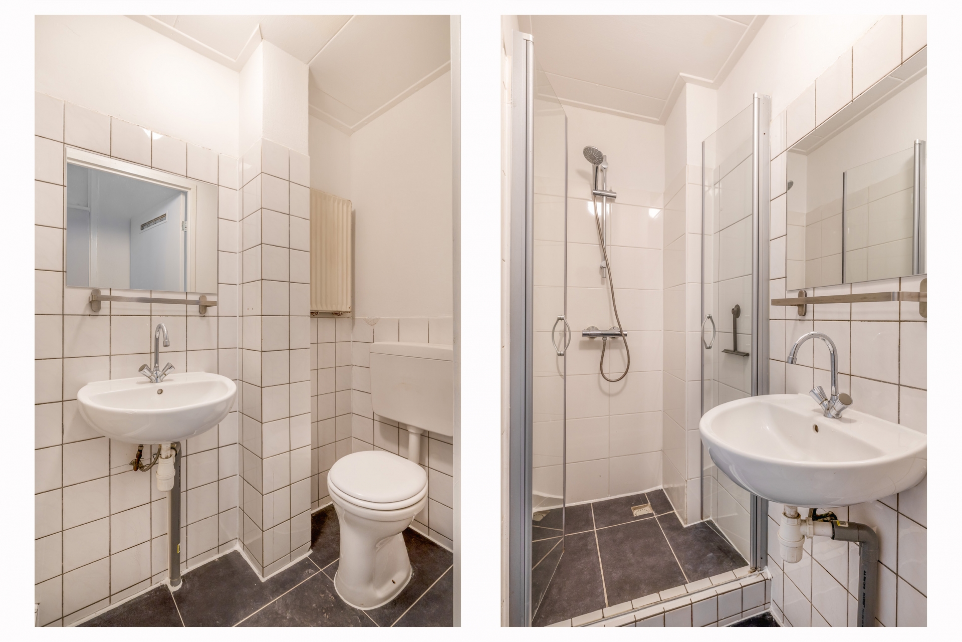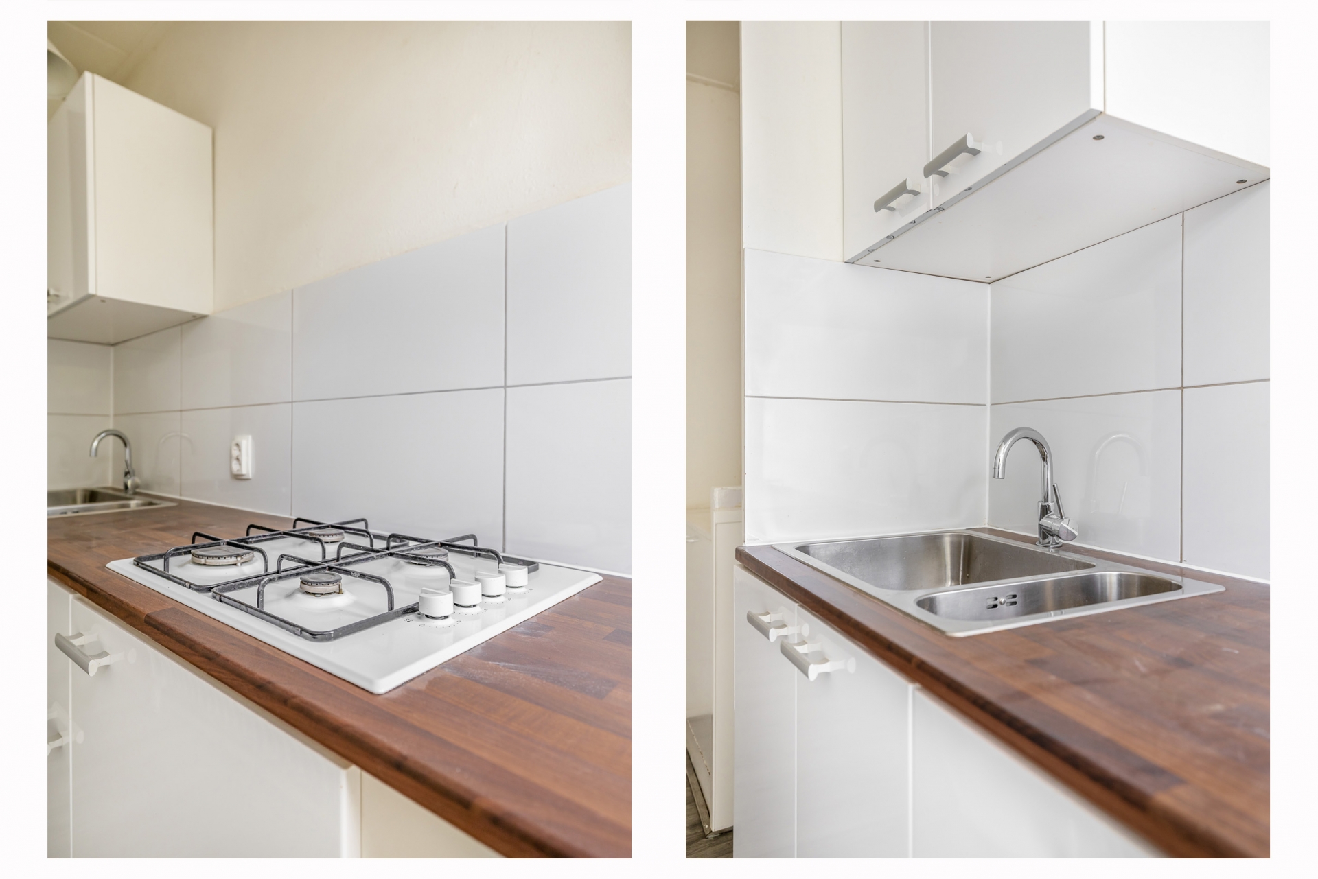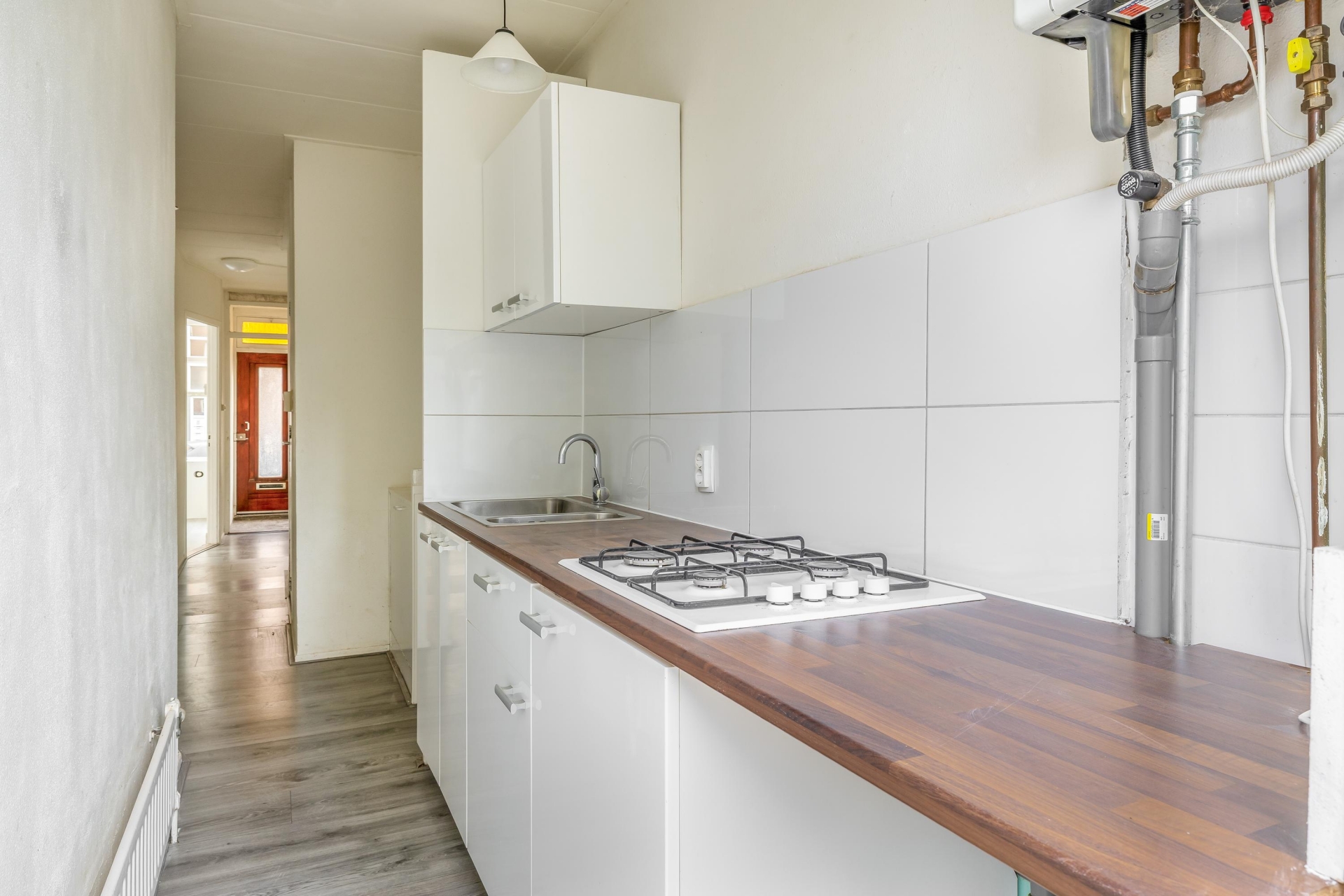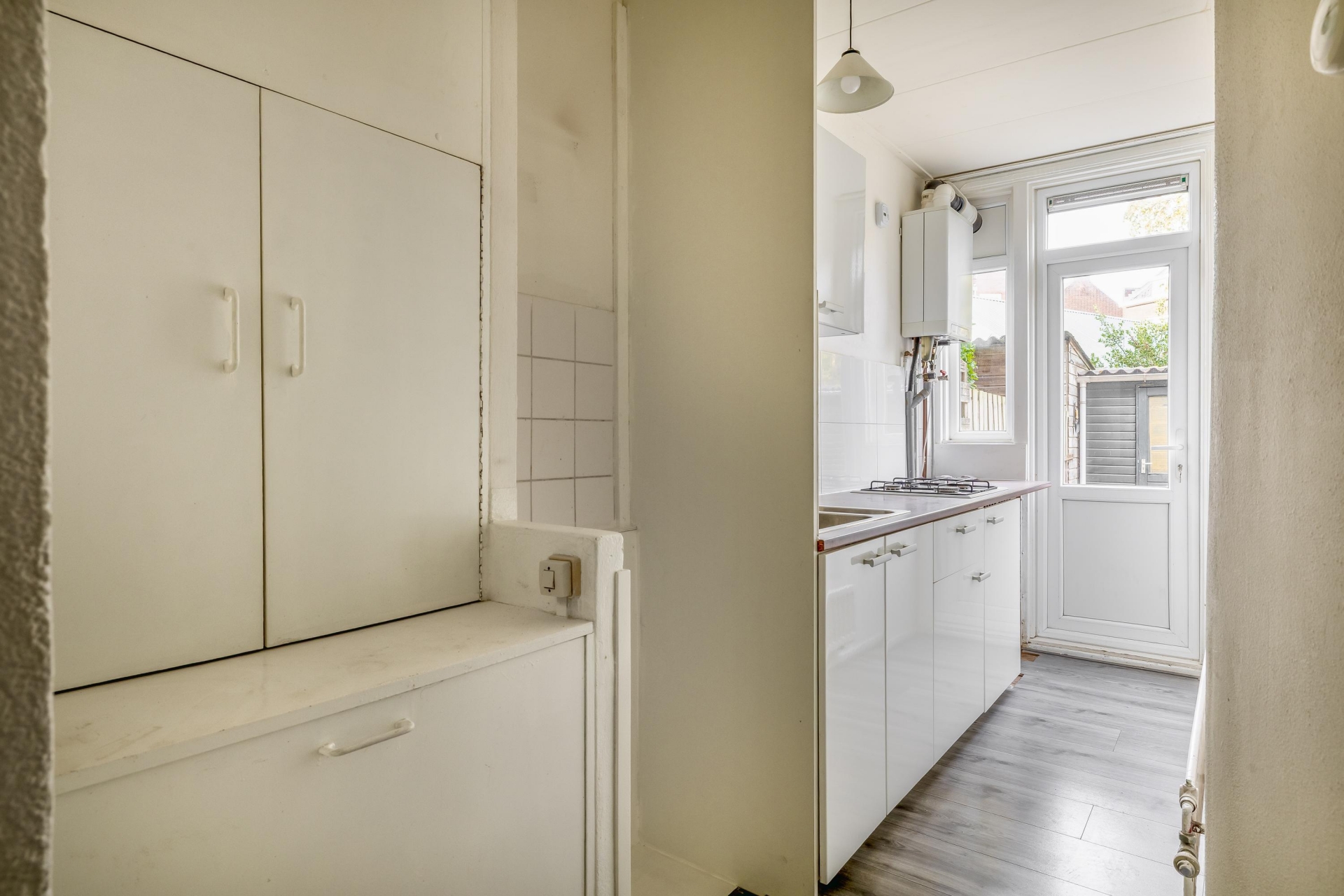 De keuken bevindt zich aan de achterzijde en biedt toegang tot de tuin. Hoewel eenvoudig, is de ruimte functioneel opgezet en biedt het genoeg potentie om een open keuken te realiseren. Direct grenzend aan de keuken ligt de badkamer. Ook hier geldt: netjes, maar eenvoudig, en klaar om naar eigen wens te vernieuwen of uit te breiden.