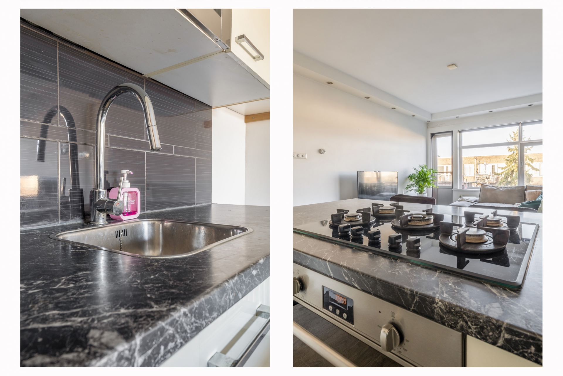 De open keuken sluit naadloos aan op het woongedeelte en is uitgevoerd in een neutrale kleurstelling met een zwart werkblad. Er is gekozen voor een praktische indeling met voldoende werkruimte en kastruimte. Verder beschik je over een 5-pits gaskookplaat, ingebouwde magnetron én oven, koel-vriescombinatie (2024) en vaatwasser. De bar met zitgedeelte maakt het af: ideaal voor een kop koffie in de ochtend of een drankje met bezoek.