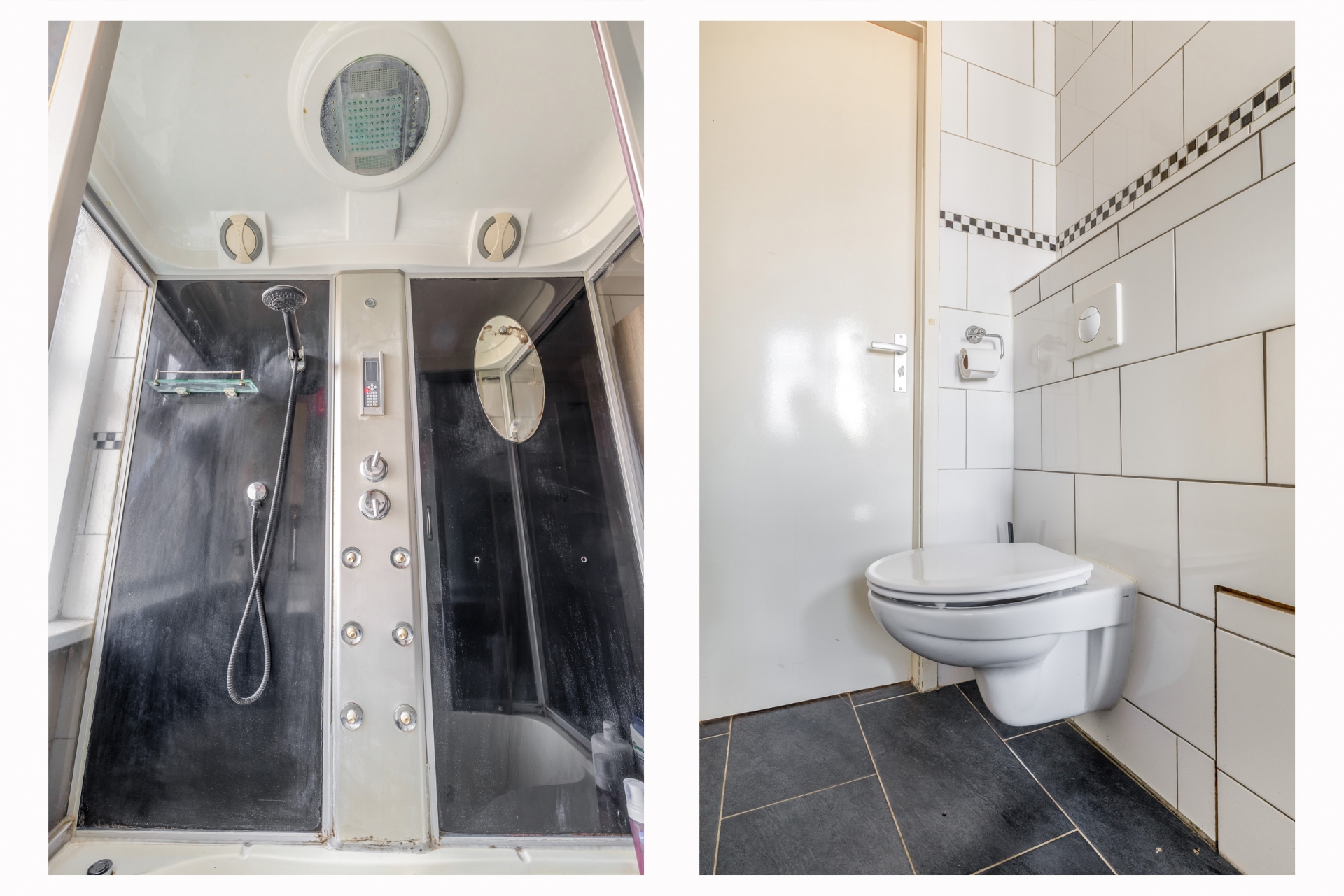 De badkamer is verrassend ruim en netjes uitgevoerd. Er is gekozen voor een moderne afwerking met lichte betegeling, een douchecel, wastafelmeubel, toilet en aansluitingen voor wasmachine en opstelplaats voor de CV-ketel.