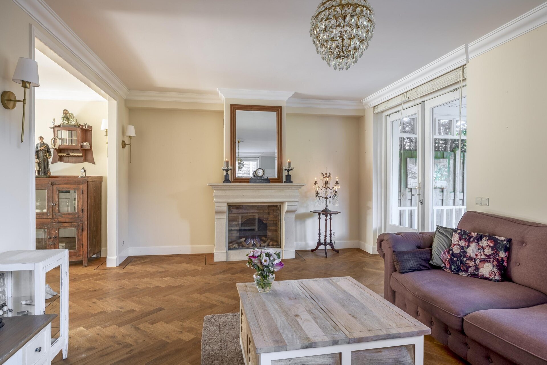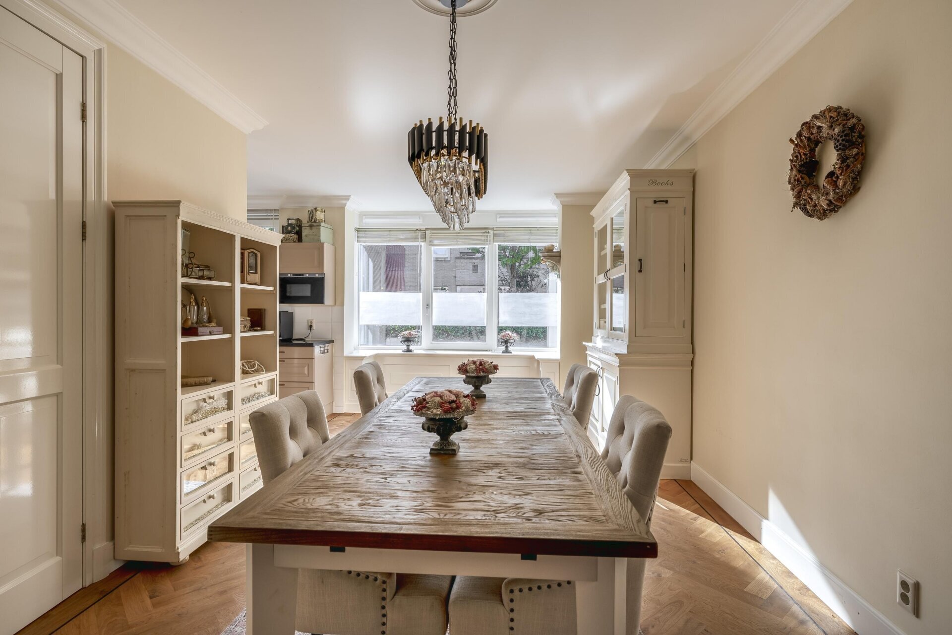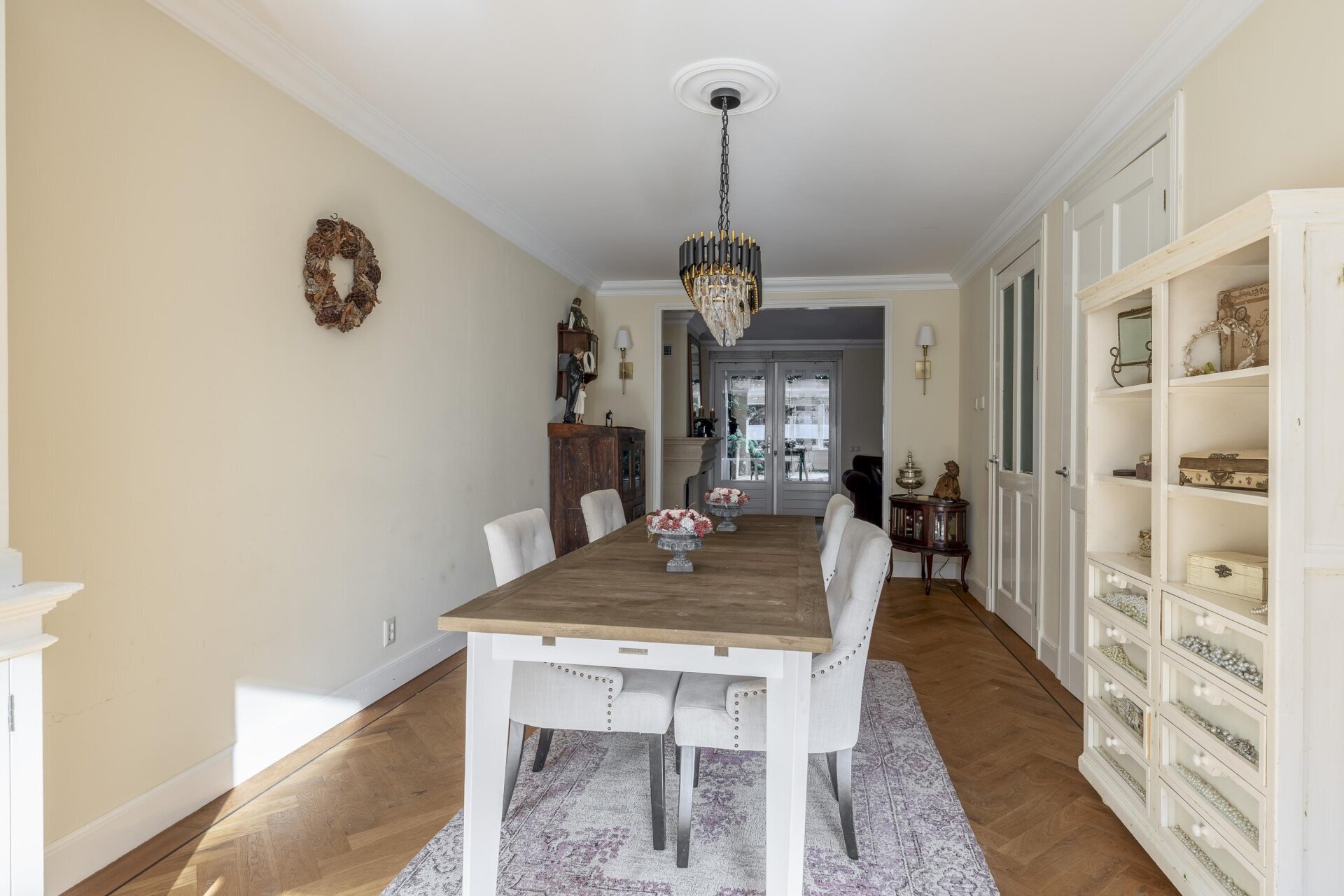 Zodra je de woonkamer binnenstapt, valt het warme karakter meteen op. De klassieke houten parketvloer en de stijlvolle afwerking zorgen voor een prettige, rustige basis. Grote ramen aan meerdere zijden van de woning geven veel lichtinval en contact met buiten, terwijl de indeling ruimte biedt voor een riante zithoek én een grote eettafel. De sfeer? Die voelt als een mix tussen landelijk en luxe, perfect voor wie houdt van een huis met karakter én comfort.
