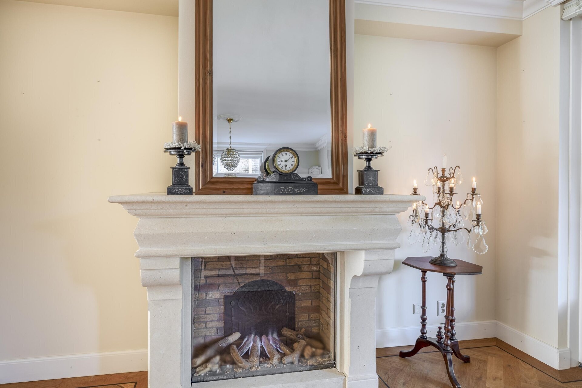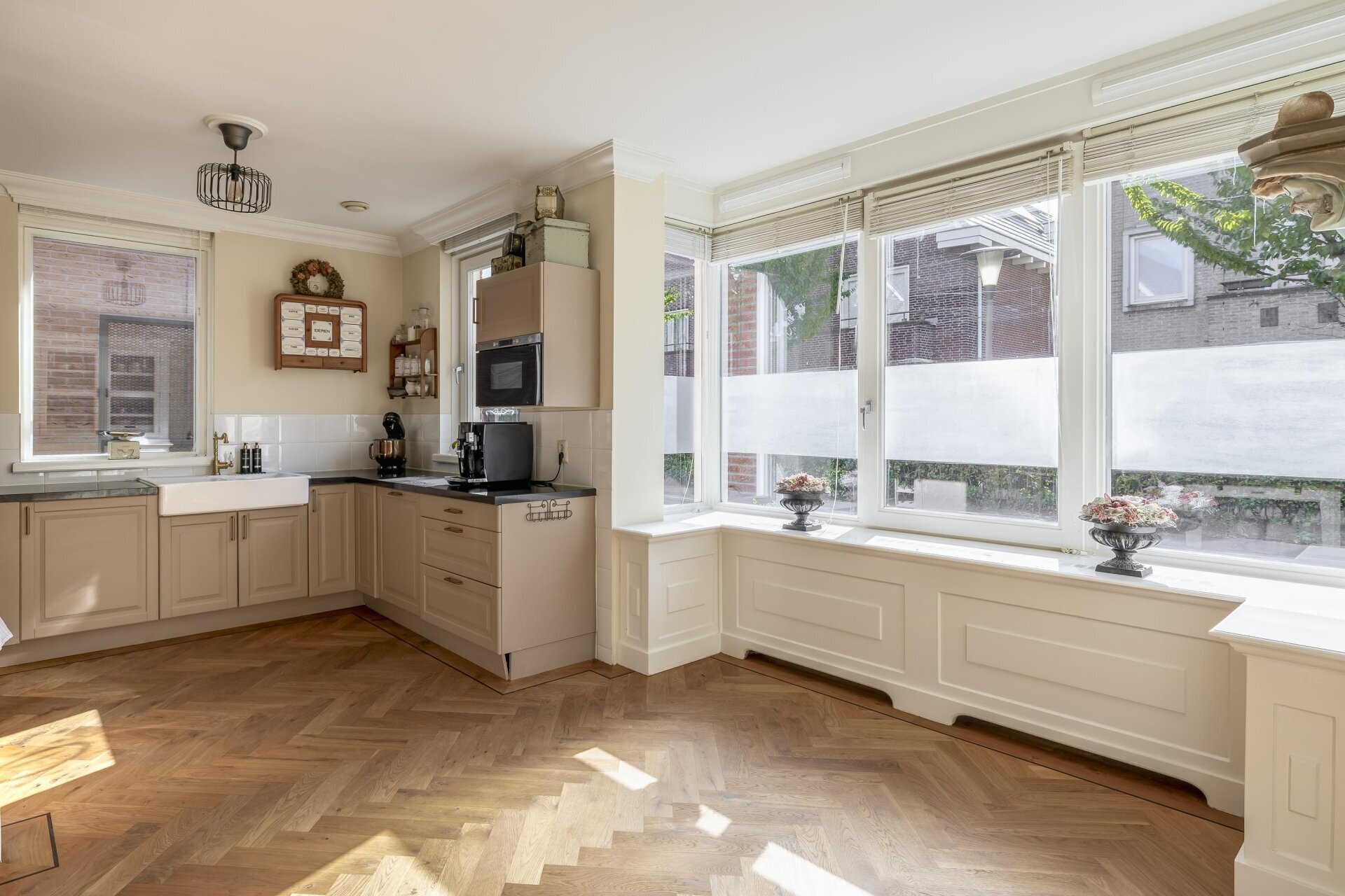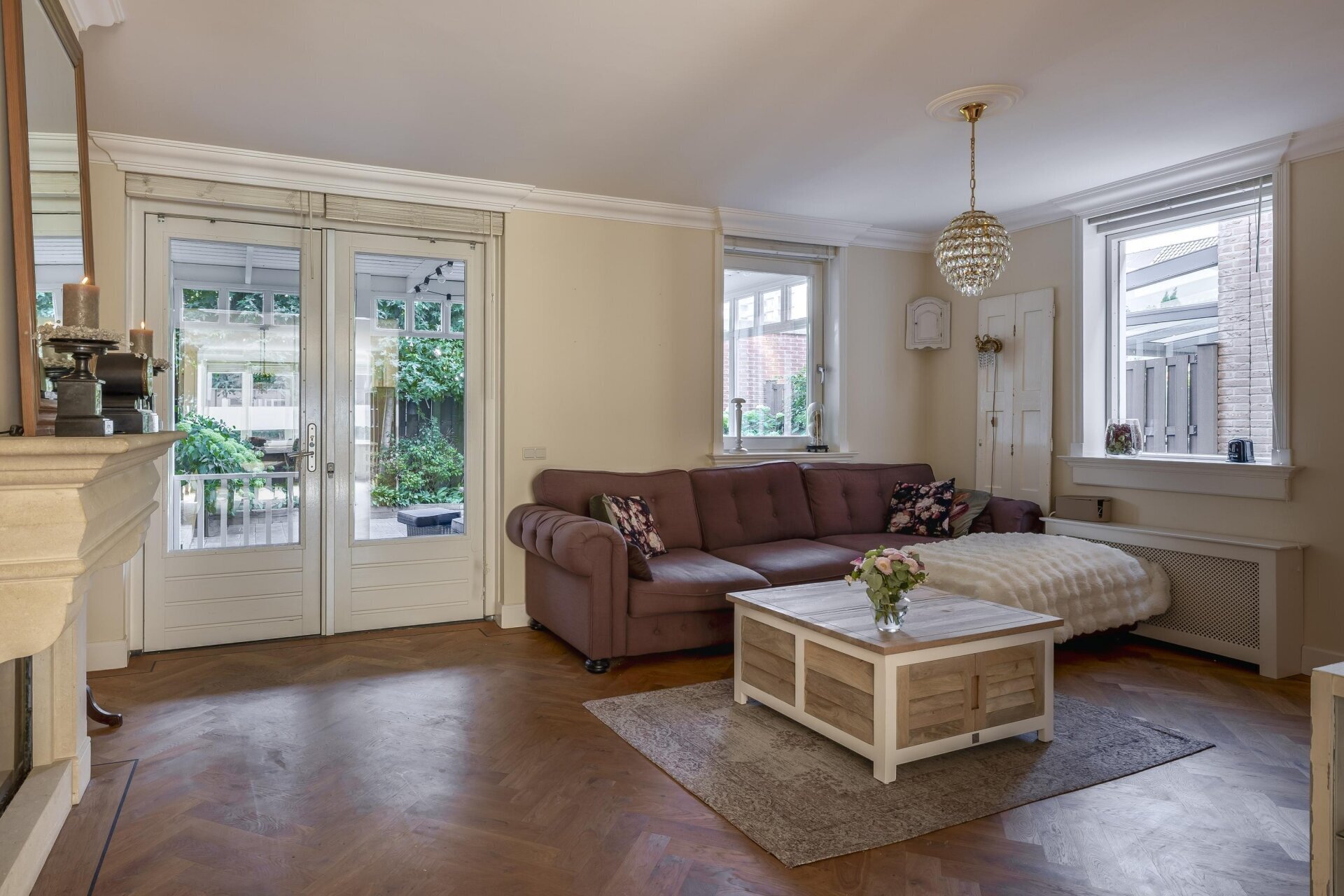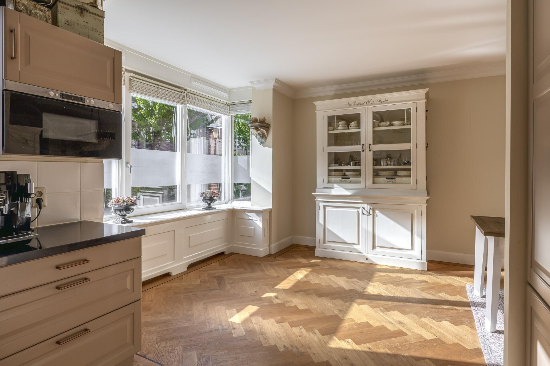 Zodra je de woonkamer binnenstapt, valt het warme karakter meteen op. De klassieke houten parketvloer en de stijlvolle afwerking zorgen voor een prettige, rustige basis. Grote ramen aan meerdere zijden van de woning geven veel lichtinval en contact met buiten, terwijl de indeling ruimte biedt voor een riante zithoek én een grote eettafel. De sfeer? Die voelt als een mix tussen landelijk en luxe, perfect voor wie houdt van een huis met karakter én comfort.