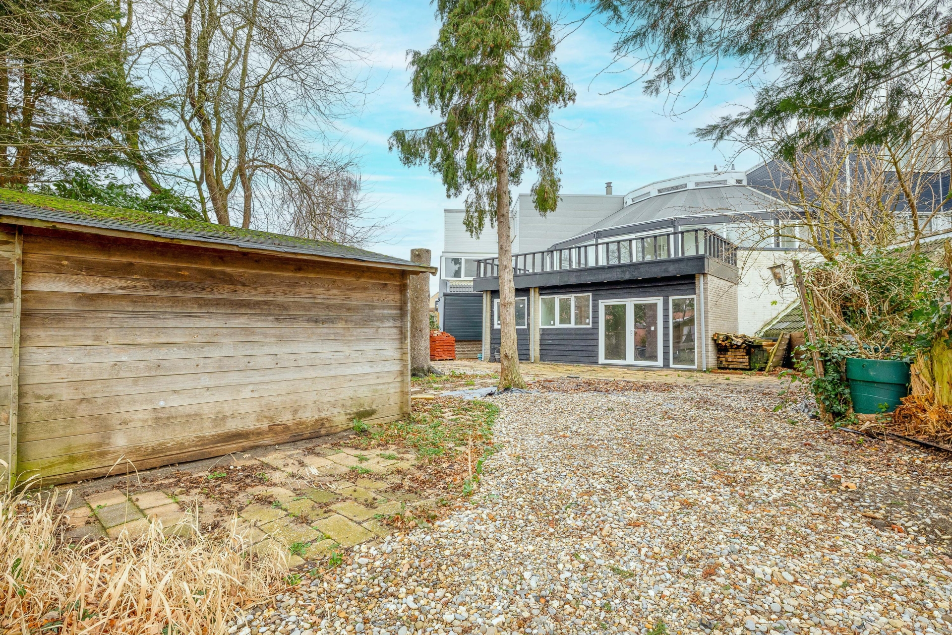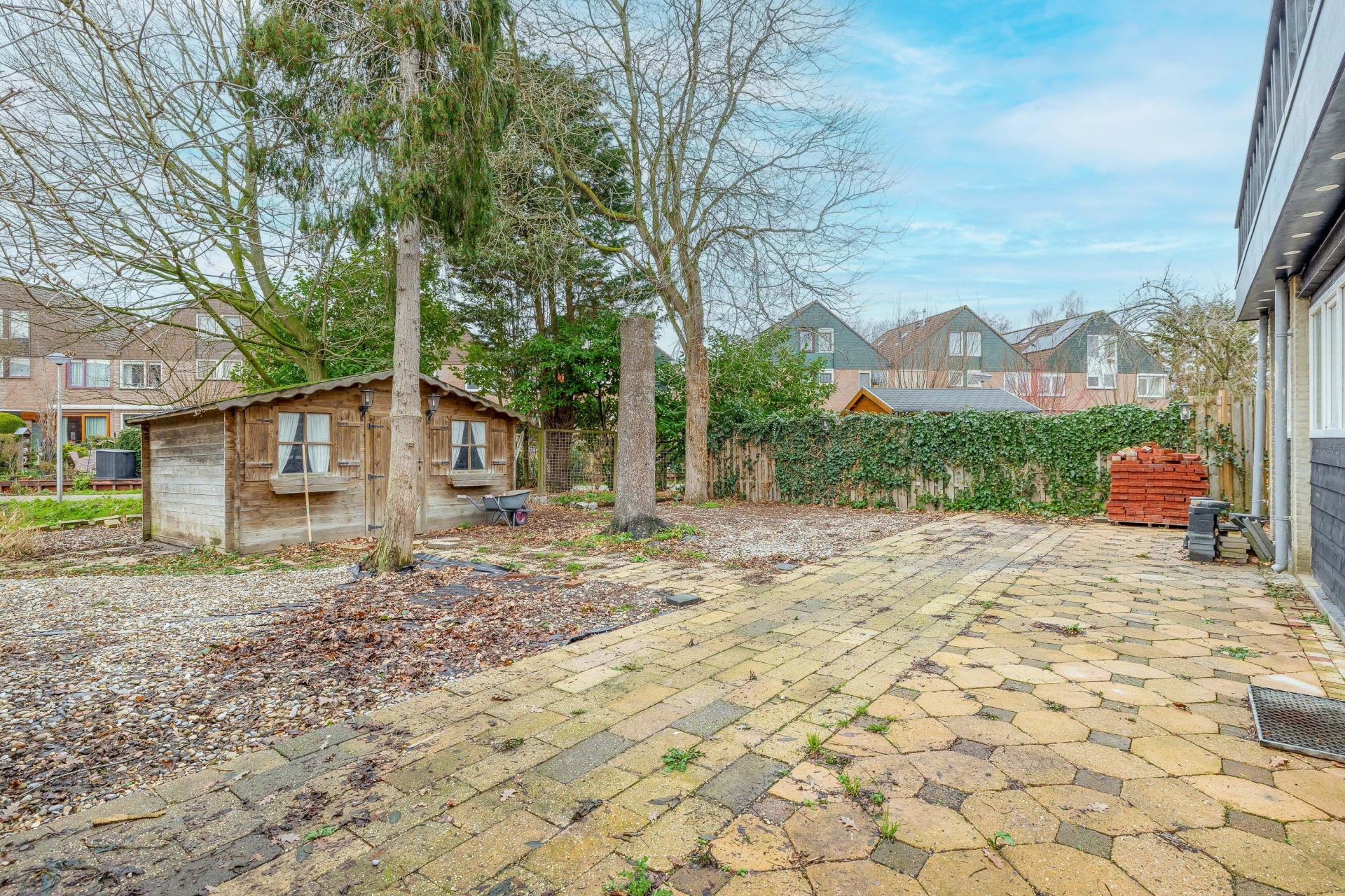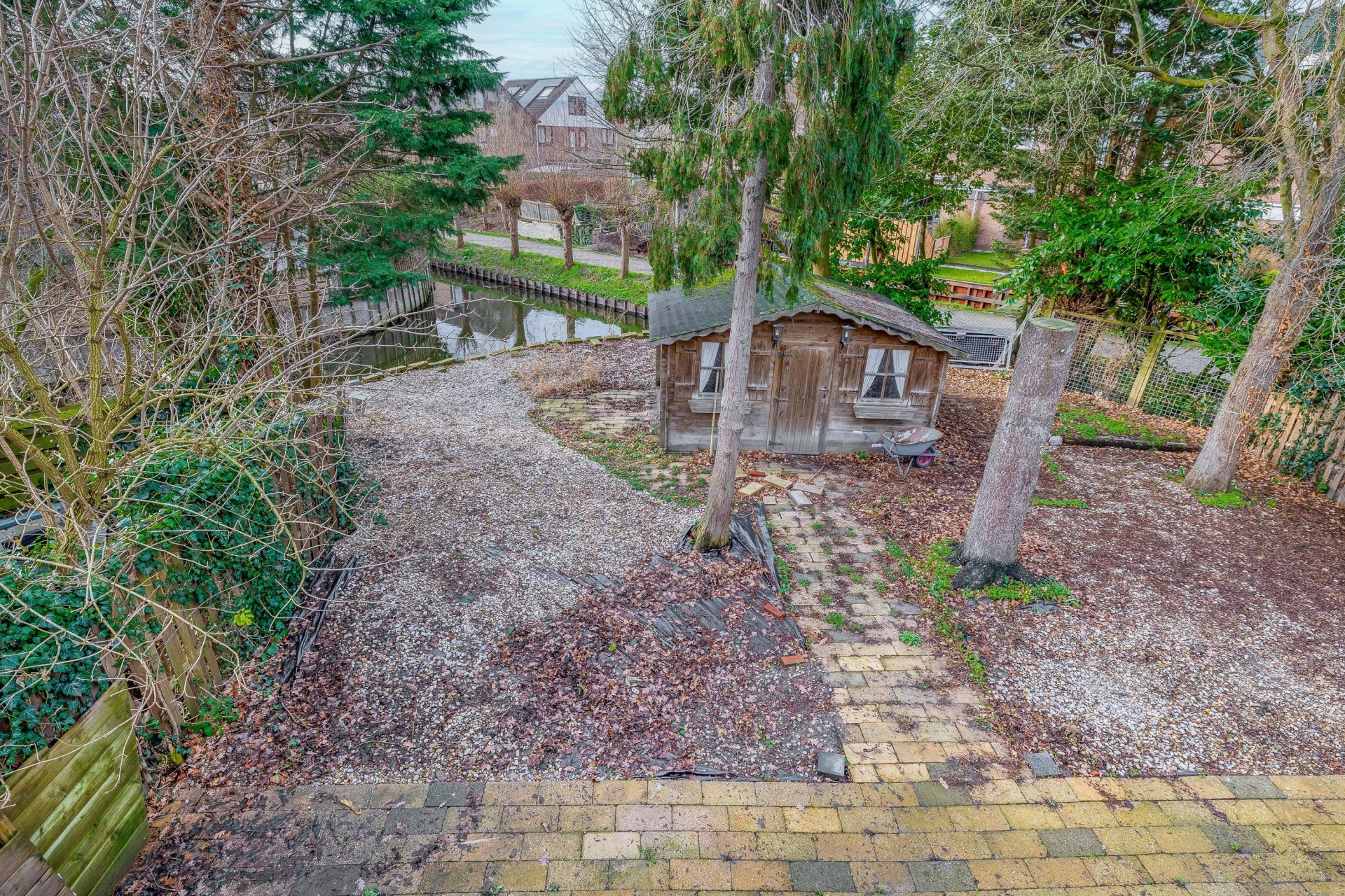 De achtertuin van maar liefst 105 m² ligt op het westen en grenst direct aan een brede waterpartij. Hier geniet je de hele middag en avond van de zon én van rust. De ligging aan het water zorgt voor een groene, vrije beleving zonder directe inkijk van achterburen. Ideaal voor tuinliefhebbers, spelende kinderen of zomerse barbecues. Achterin de tuin staat een vrijstaande houten berging (14 m²) met elektra – handig voor opslag of als kleine werkplek.