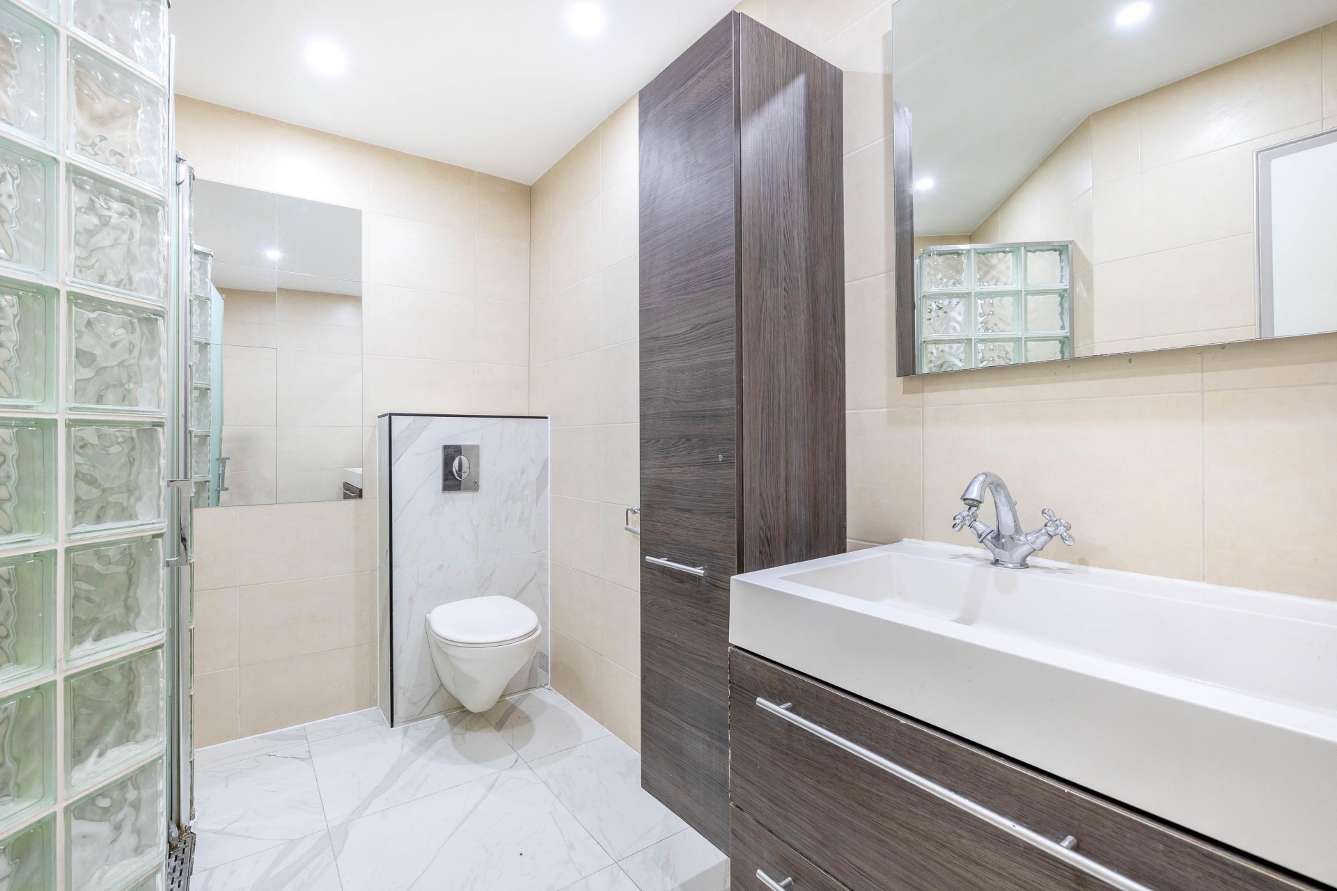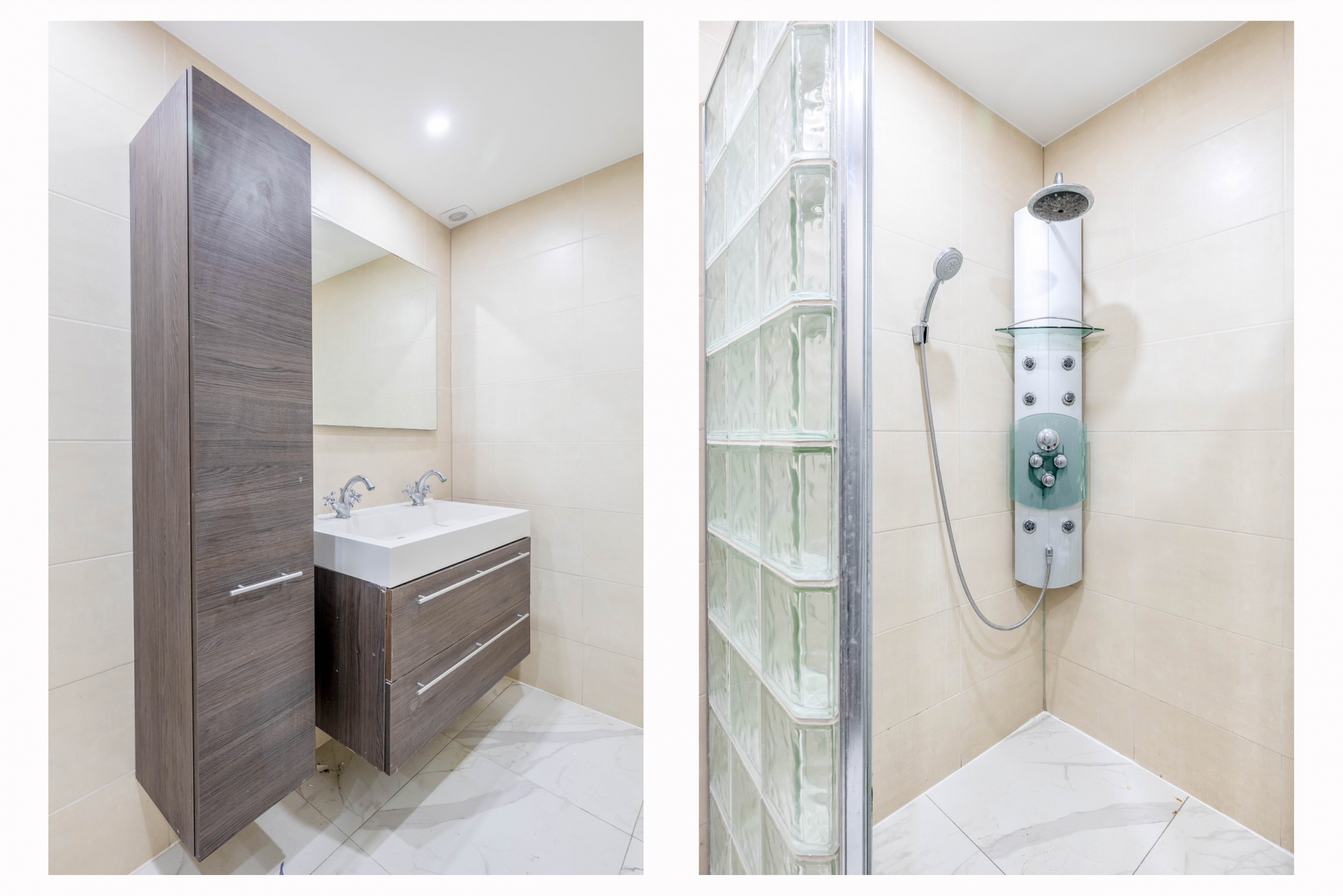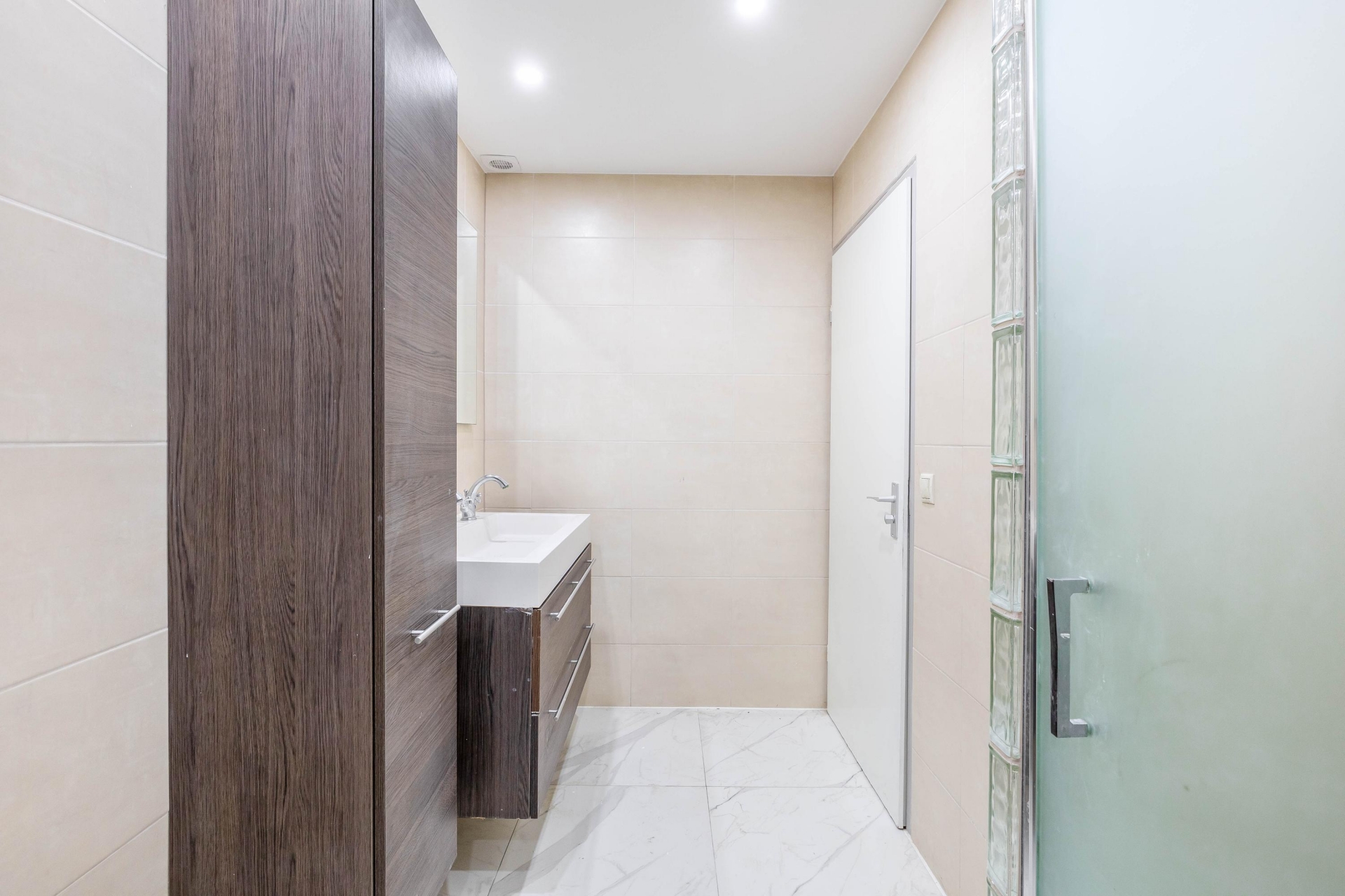 De badkamer is keurig afgewerkt en voorzien van een ruime inloopdouche met glazen bouwstenen, een strak wastafelmeubel en tweede toilet. Ook is er een aparte toiletruimte in de hal. Alles fris, neutraal afgewerkt en direct te gebruiken.