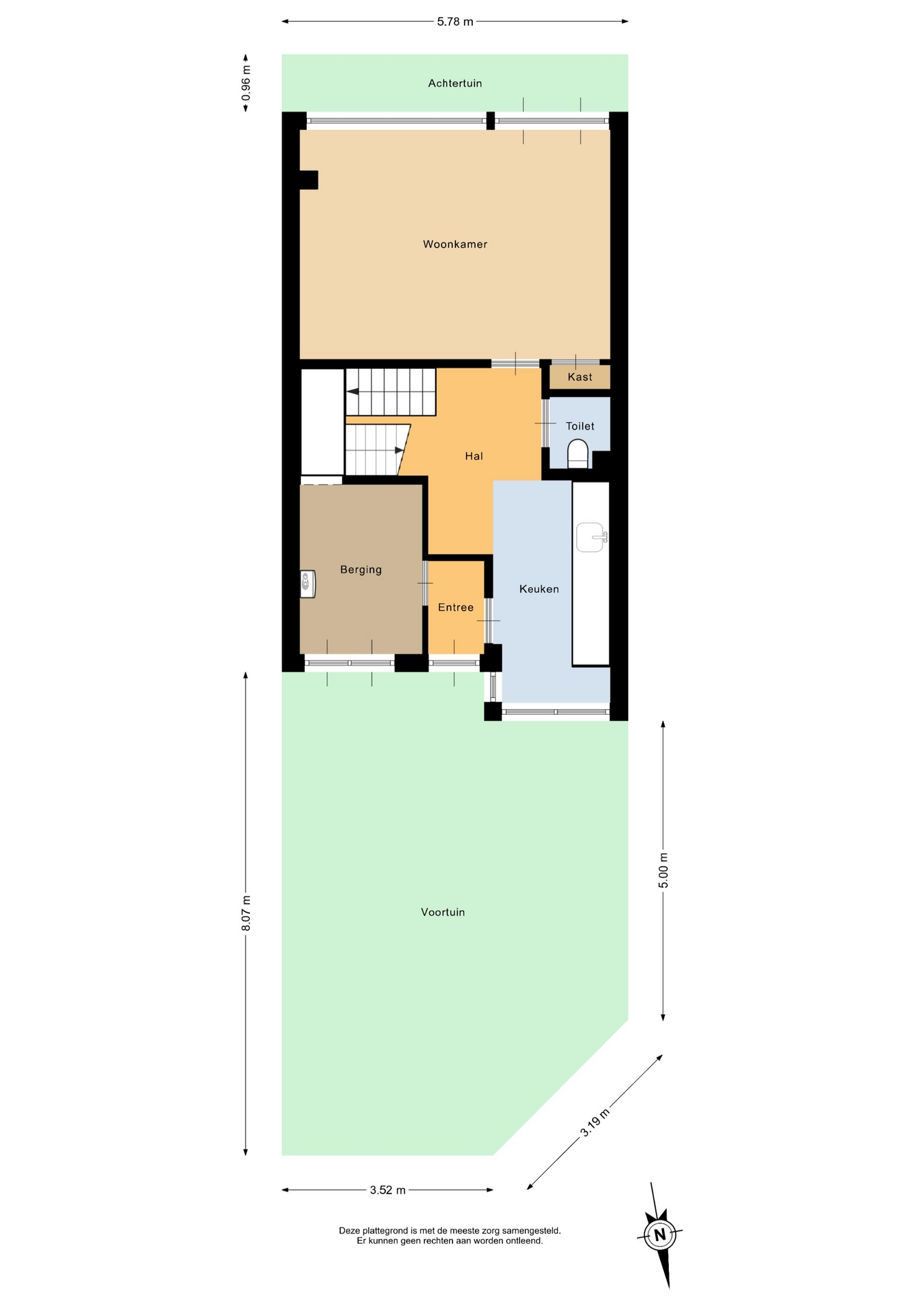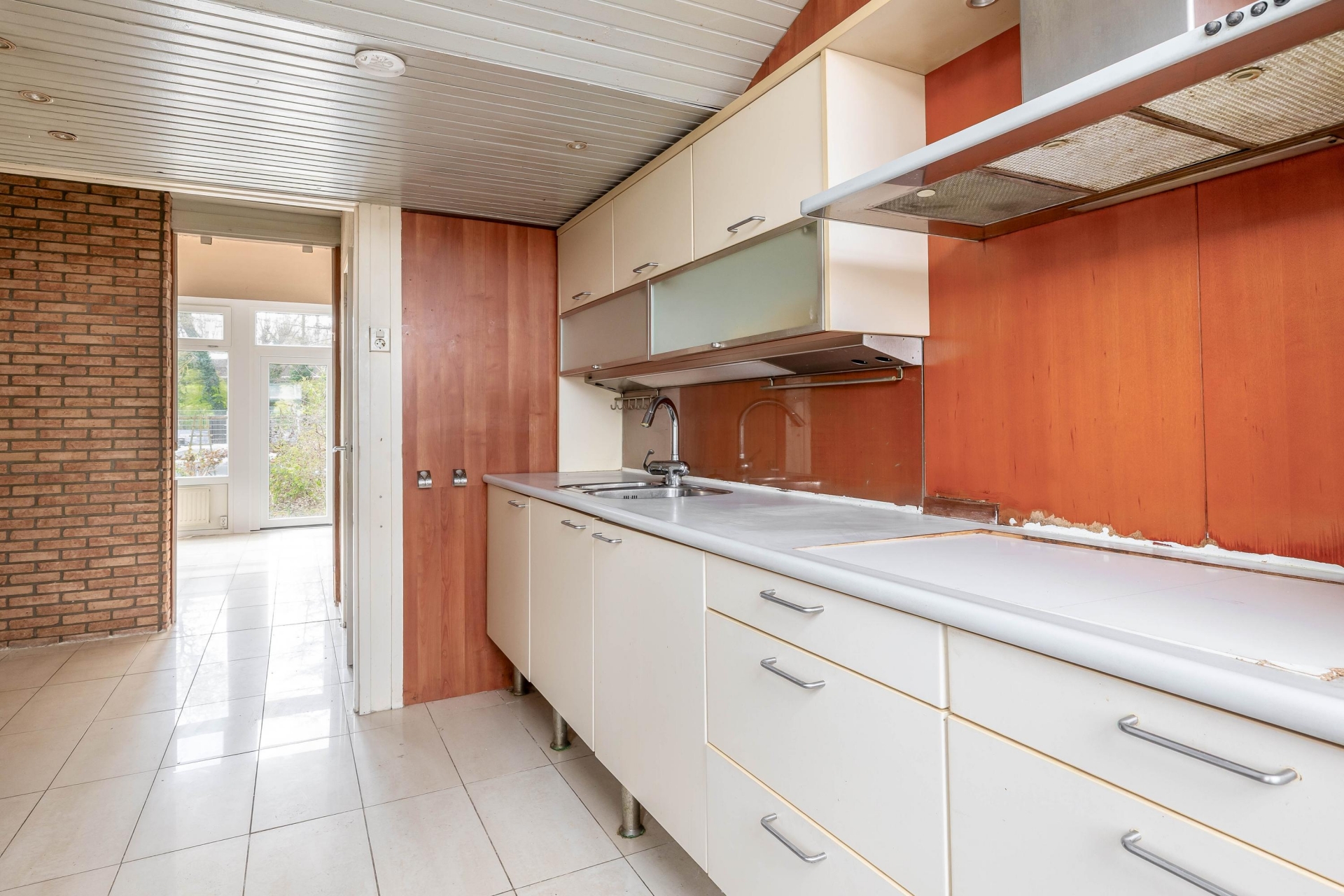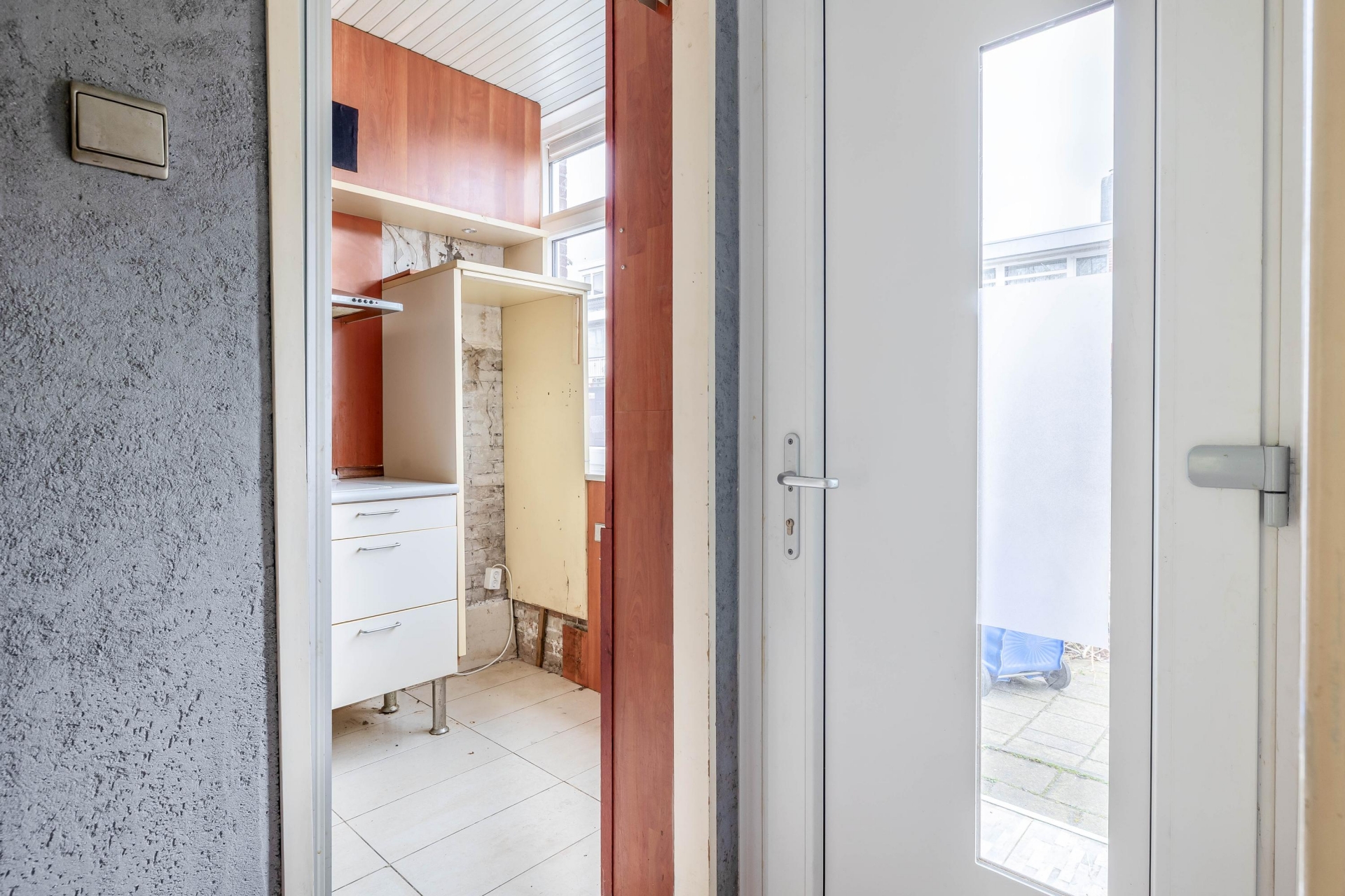 Bij binnenkomst kom je via de entree in de hal met toegang tot het toilet, de trapopgang en de verschillende vertrekken op de begane grond. De woonkamer ligt aan de achterzijde van het huis en valt direct op door de grote raampartij. Hierdoor komt er veel daglicht naar binnen en heb je een prettige verbinding met de tuin. De ruimte is goed in te delen met een zit- en eetgedeelte en biedt volop mogelijkheden om hier een moderne leefruimte van te maken. Vanuit de woonkamer stap je zo de achtertuin in, wat het geheel extra aantrekkelijk maakt. Aan de voorzijde van het huis bevindt zich de keuken.