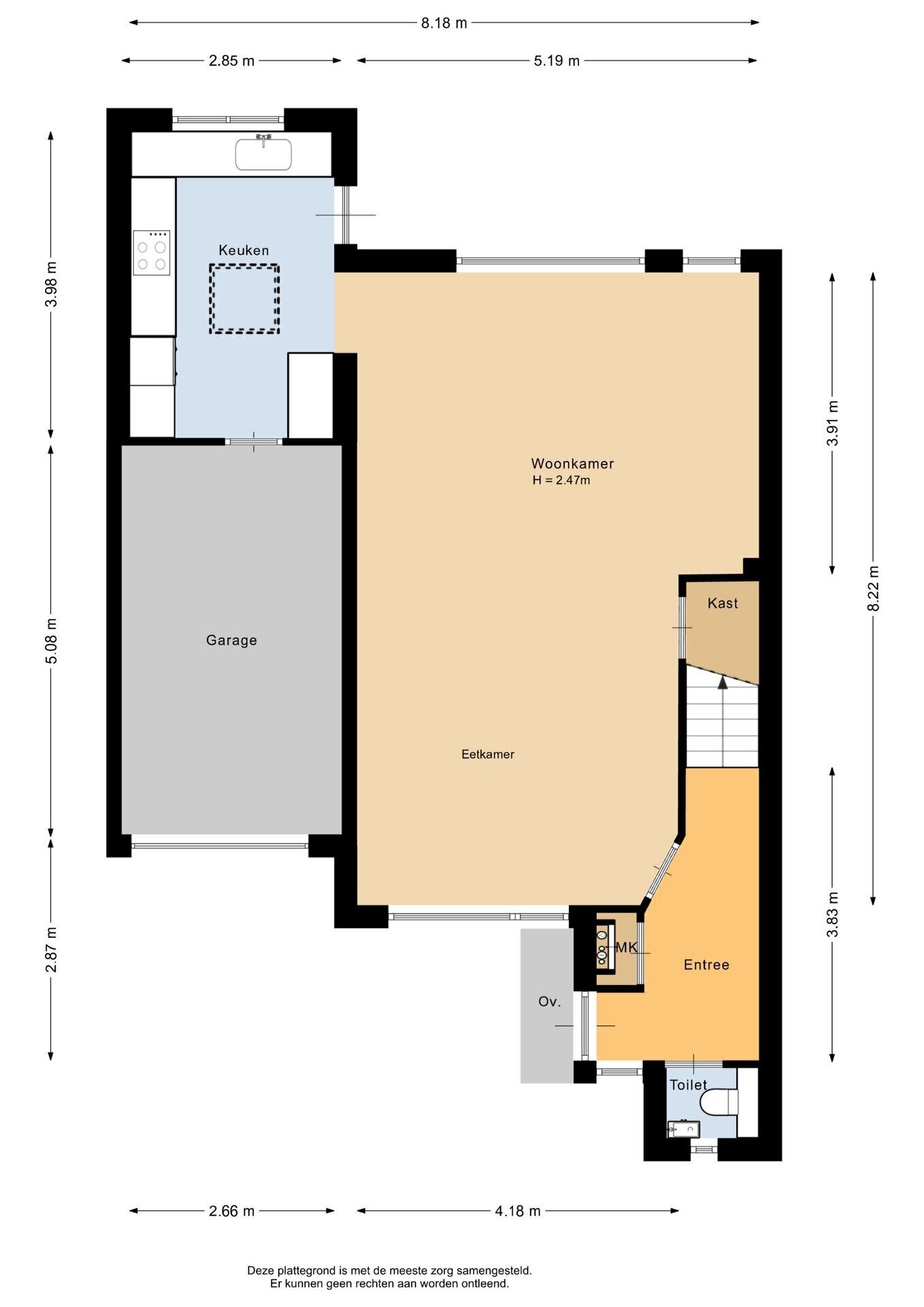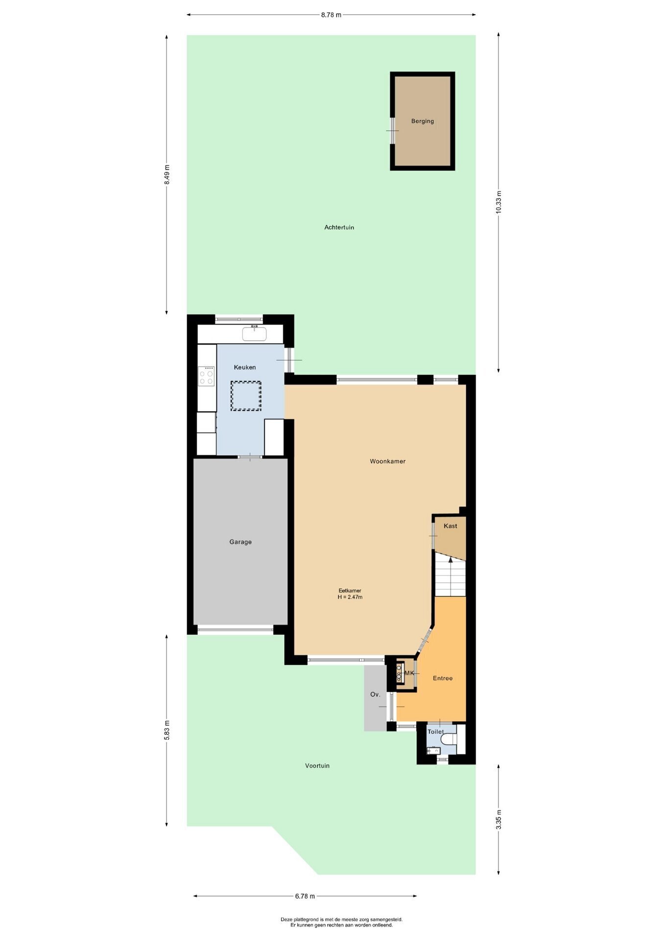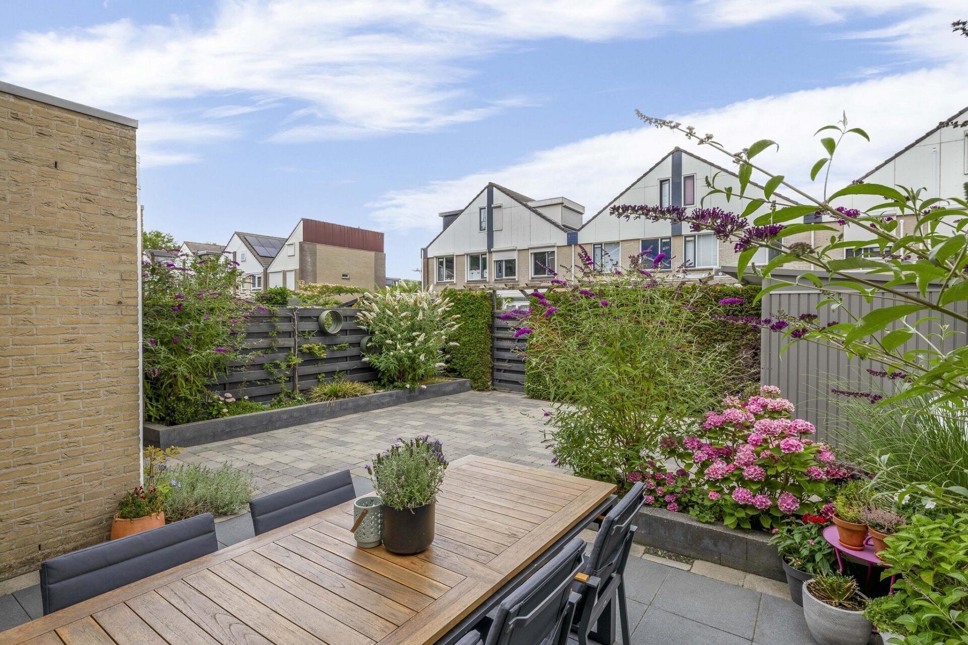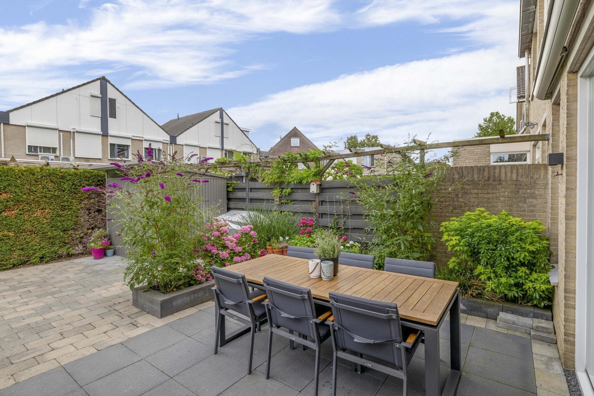 De achtertuin ligt op het noordoosten, maar door de diepte van ruim 10 meter geniet je hier het grootste deel van de dag van de zon. De tuin is netjes aangelegd met sierbestrating, vaste beplanting, een zonnescherm en voldoende ruimte voor een loungeset of trampoline. Achterin staat een metalen berging voor je fietsen of tuingereedschap. Aan de zijkant van het huis vind je de aangebouwde garage met geïsoleerde vloer en dak – ideaal voor opslag, als werkruimte of voor een motor of auto. En parkeren? Dat doe je gewoon op je eigen oprit!