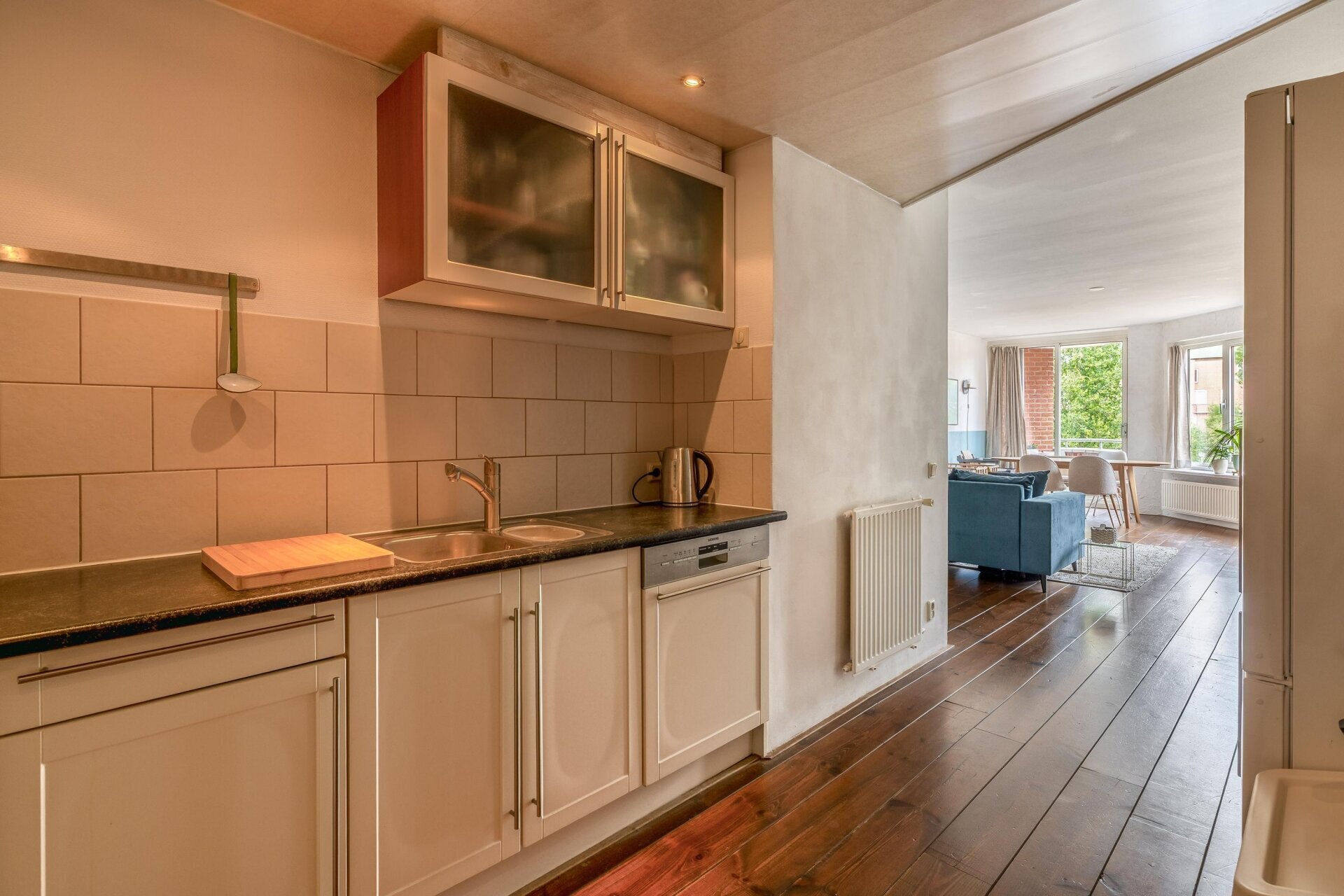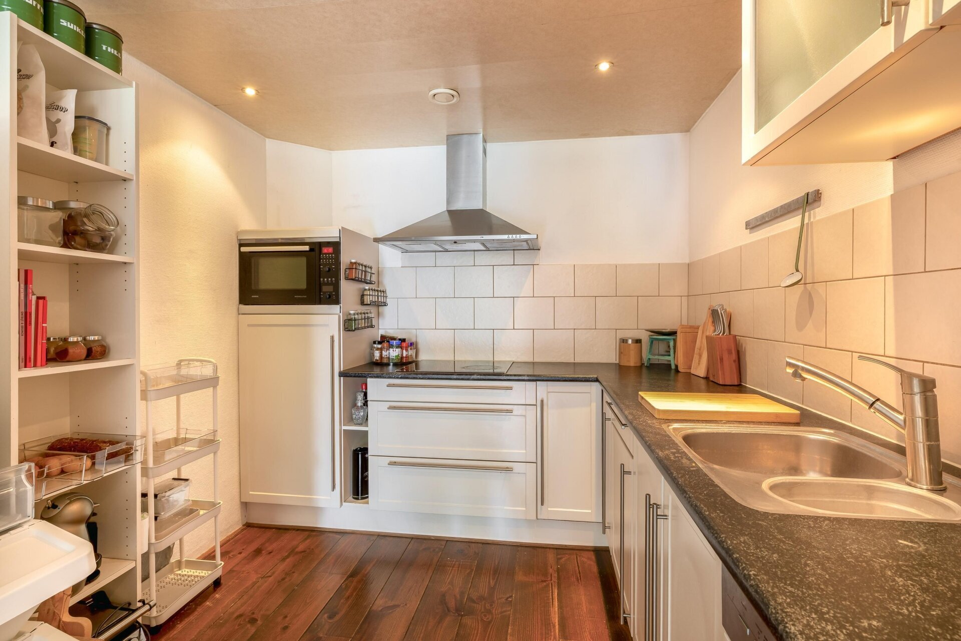 De keuken is praktisch en netjes afgewerkt, met voldoende kastruimte, ingebouwde apparatuur en een stijlvolle uitstraling dankzij de combinatie van lichte fronten en een donker werkblad. De vloer loopt mooi door vanuit de woonkamer en geeft een gevoel van eenheid aan het geheel.