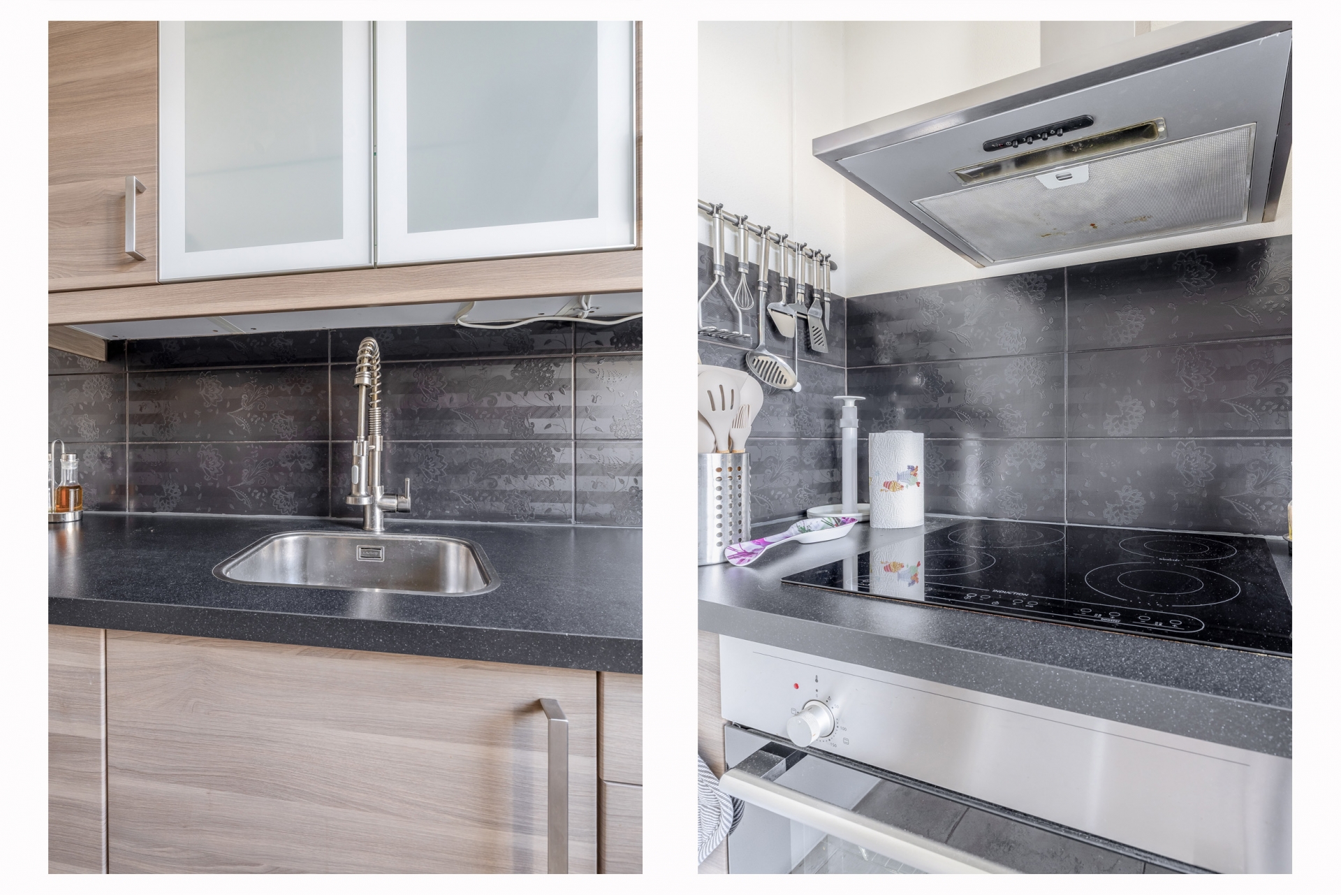 Aansluitend bevindt zich de nette, moderne keuken. Deze is slim ingedeeld met voldoende opbergruimte, een strak werkblad, stijlvolle achterwand en alle benodigde apparatuur. Dankzij het raam in de keuken kook je hier met natuurlijk licht en ventilatie.