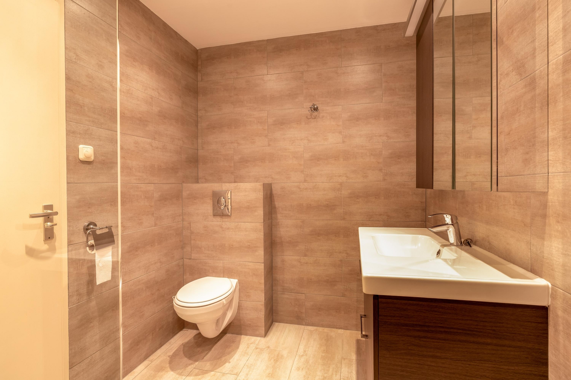 De badkamer is modern afgewerkt, voorzien van een ruime inloopdouche met glazen wand, strak wastafelmeubel met spiegelkasten en een toilet. De wasmachine en droger passen keurig in de hoek, netjes weggewerkt. Alles is hier tot in de puntjes verzorgd instapklaar dus.