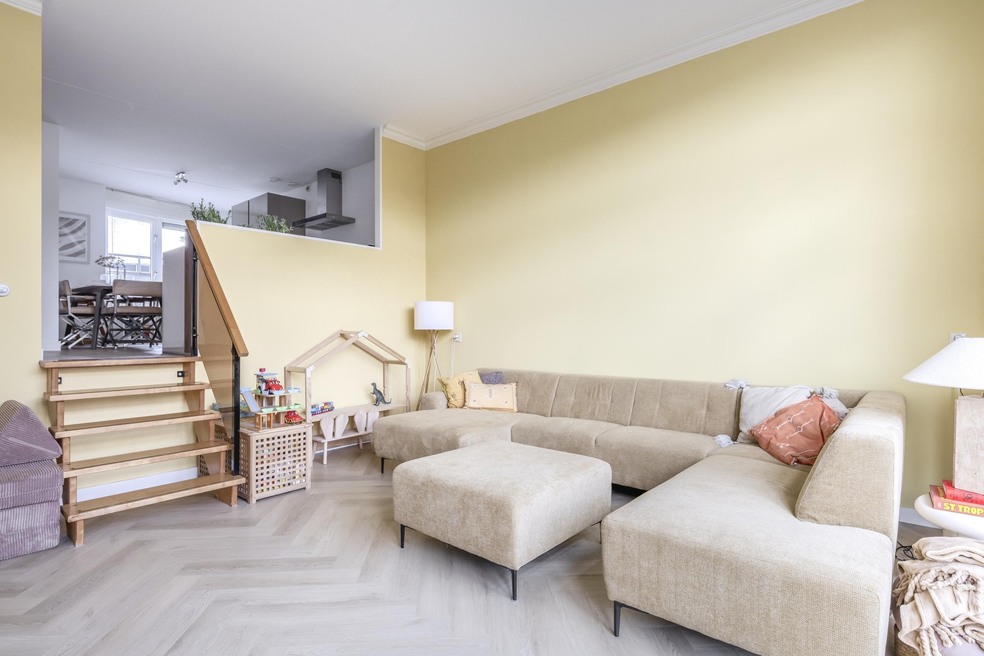 Wat meteen opvalt zodra je binnenkomt, is de unieke indeling. De woonkamer ligt verdiept ten opzichte van de keuken, waardoor je niet alleen extra hoogte ervaart, maar ook een fantastisch zicht naar buiten hebt. De grote raampartijen laten het daglicht rijkelijk binnenstromen, en de openslaande deuren verbinden binnen moeiteloos met buiten. De woonkamer voelt warm en uitnodigend aan en biedt voldoende plek voor een royale zithoek.