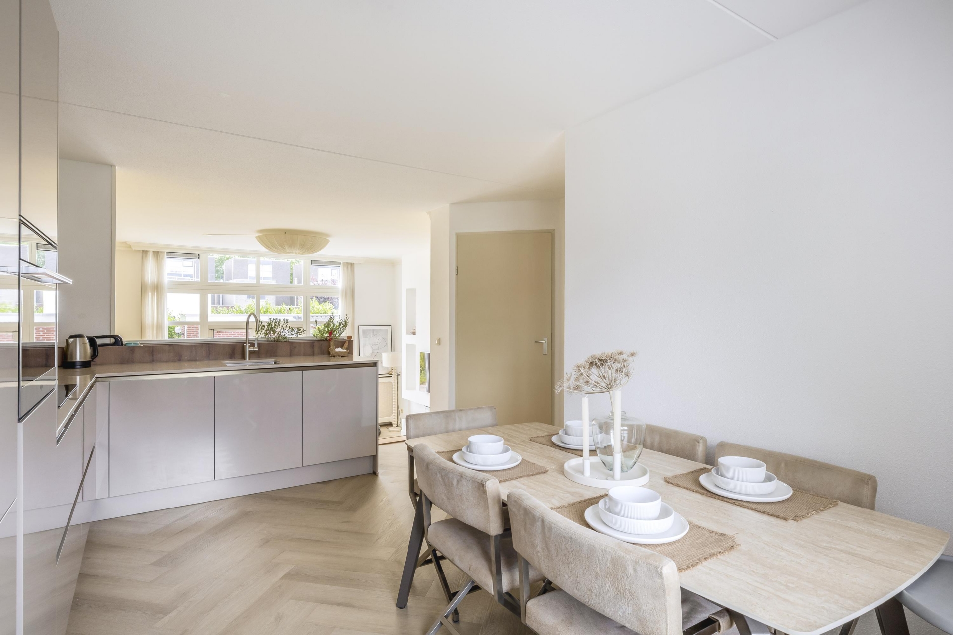 De woonkeuken is op een verhoogd niveau geplaatst en vernieuwd in 2024. Deze is strak, modern en van alle gemakken voorzien: inbouwapparatuur, veel werkruimte en plek voor een eethoek. Perfect voor wie graag kookt en gasten ontvangt. De lichte kleurstelling en de nette afwerking maken het plaatje compleet.