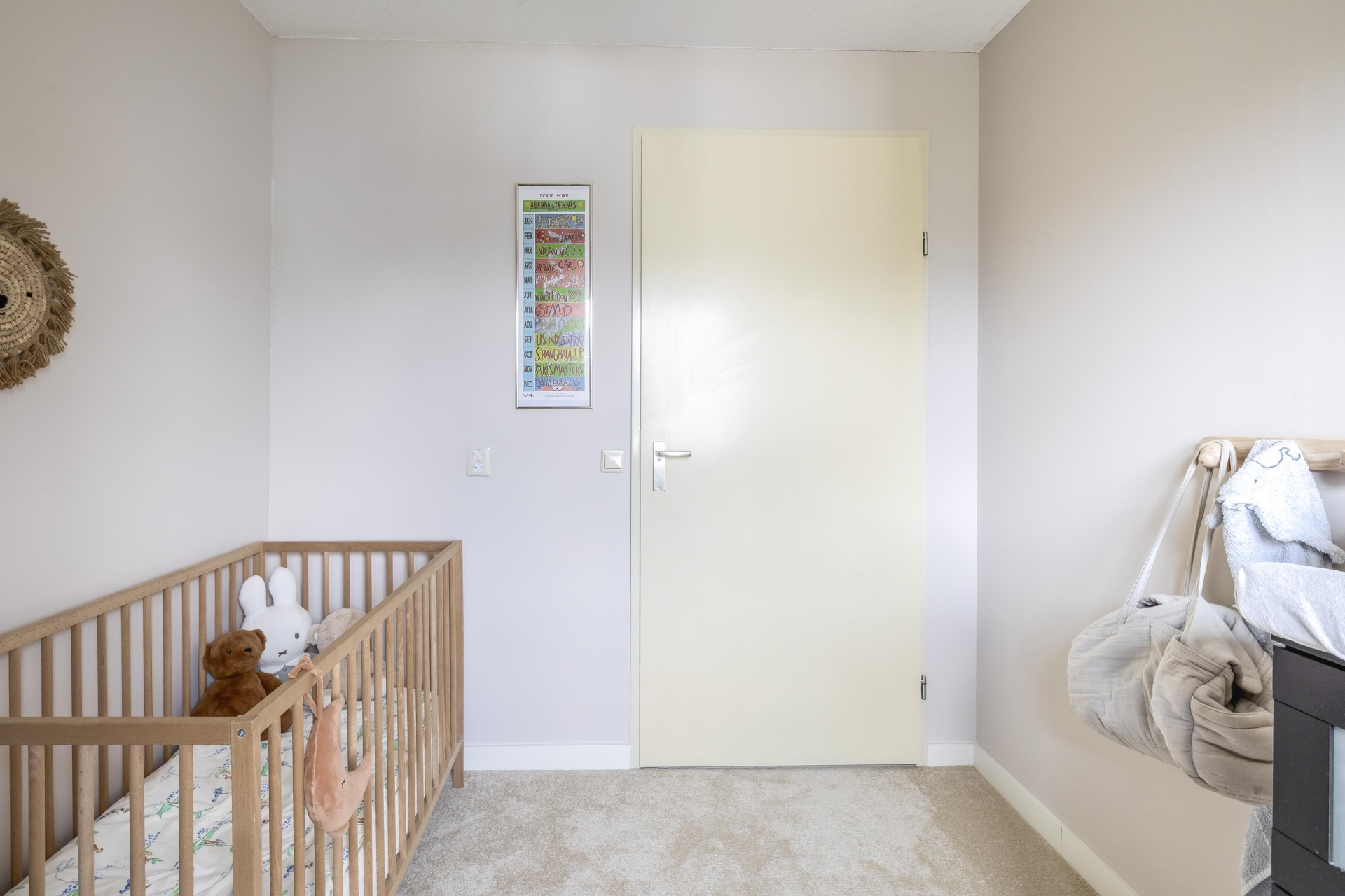 Op de bovenste verdieping vind je drie slaapkamers, waarvan de grootste aan de voorzijde ligt. Deze kamer biedt uitzicht op het water en de buurt – een fijne plek om ’s ochtends rustig wakker te worden. De twee andere kamers zijn ideaal als kinderkamer, werkkamer of logeerkamer. Alle slaapkamers zijn netjes afgewerkt met een gestoffeerde vloer en lichte wanden.