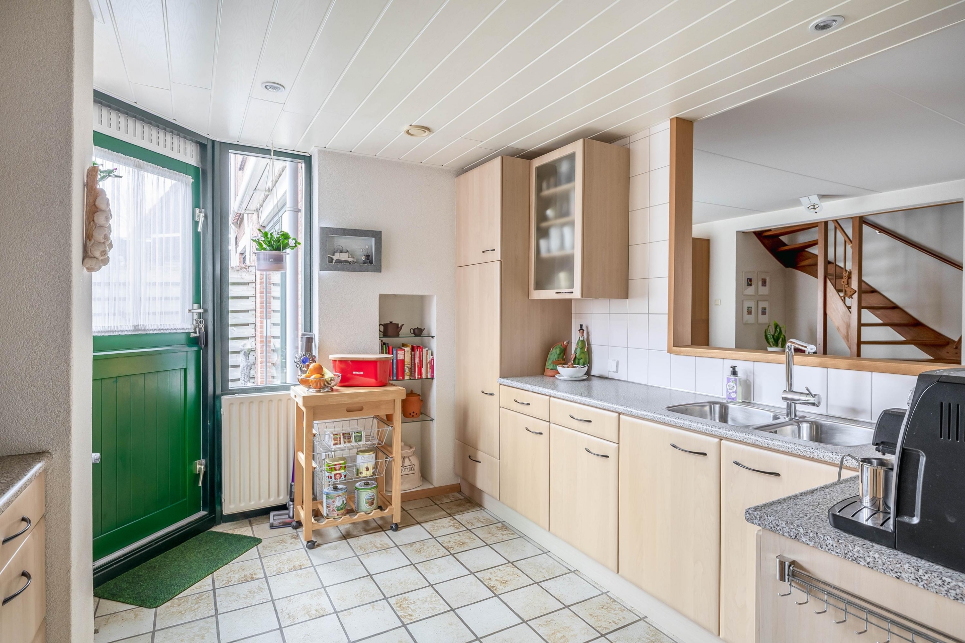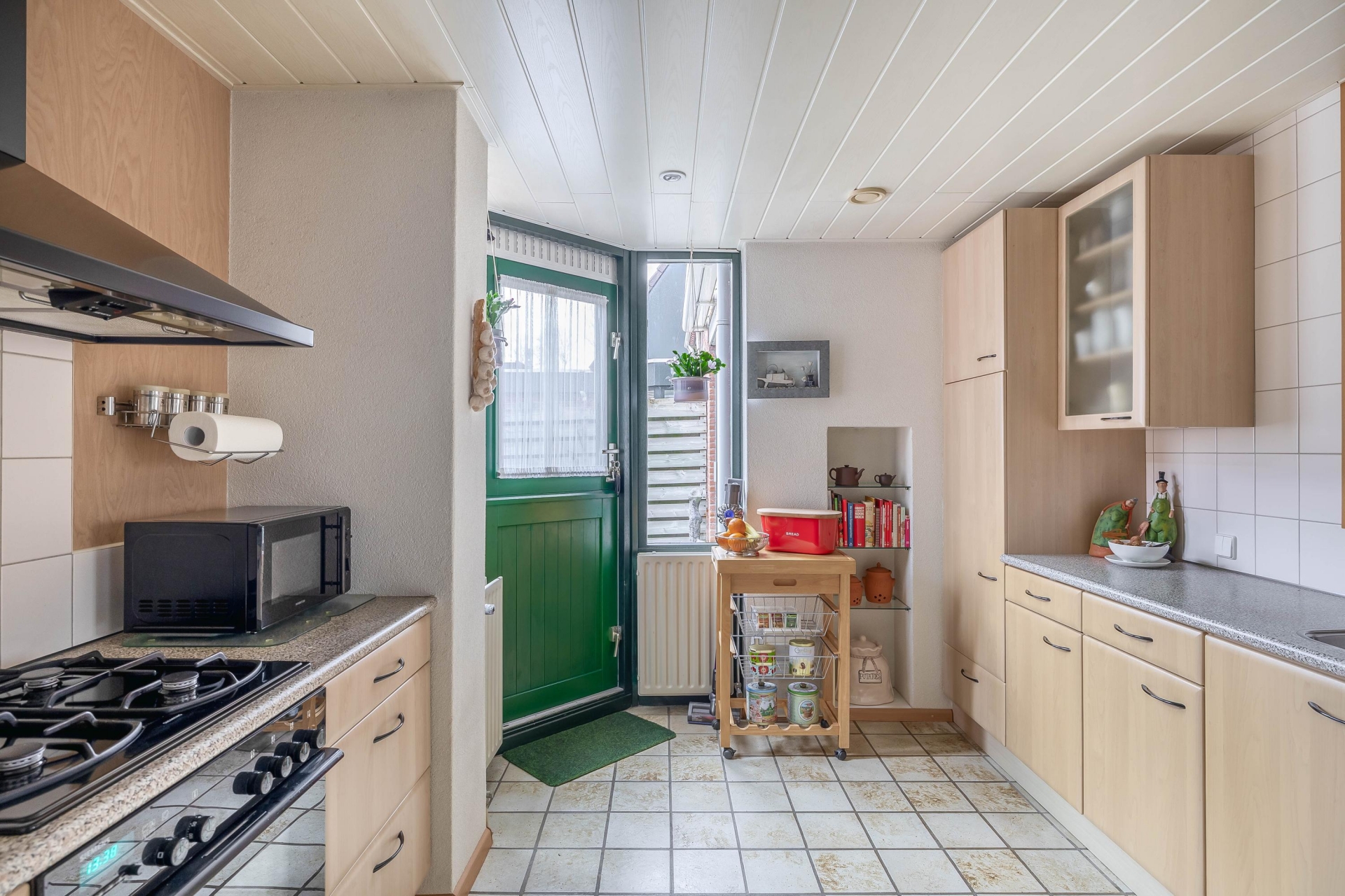 De halfopen keuken sluit aan op de leefruimte en is praktisch ingericht met voldoende werk- en bergruimte. Vanuit de keuken heb je zicht op de tuin en stap je zo naar buiten. Aangrenzend vind je de aangebouwde stenen berging met elektra, ideaal voor fietsen, gereedschap of extra opslag.