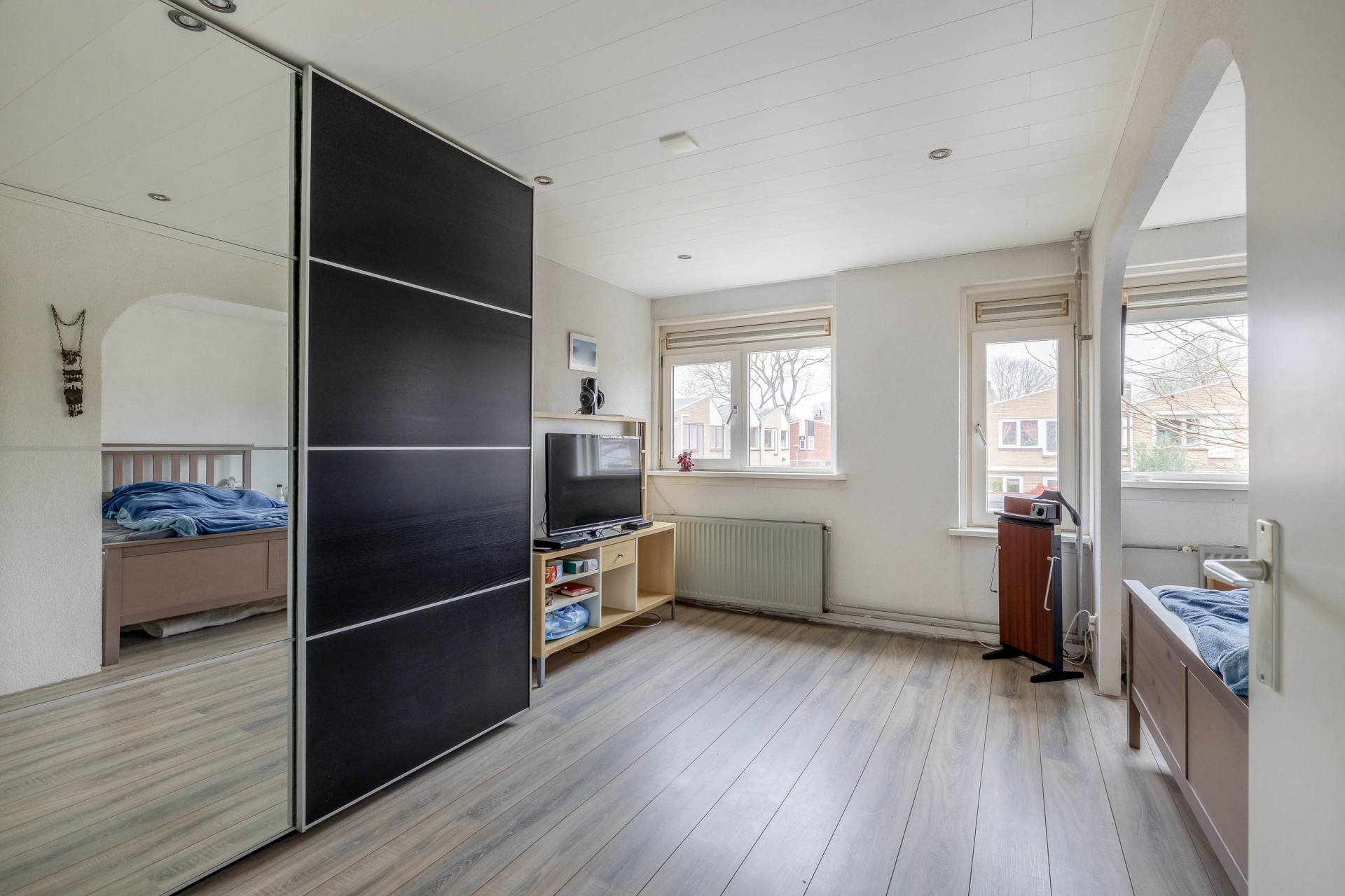 Op de eerste verdieping zijn drie slaapkamers aanwezig, verdeeld over de voor- en achterzijde van het huis. De grootste kamer ligt aan de achterzijde en biedt volop ruimte voor een tweepersoonsbed en een grote kledingkast. Oorspronkelijk waren dit twee aparte kamers; deze zijn samengevoegd tot één royale hoofdslaapkamer, maar kunnen indien gewenst eenvoudig weer worden gesplitst om een extra slaapkamer te creëren. De overige twee kamers zijn ideaal als kinderkamer, werkkamer of logeerkamer. De badkamer is slim ingericht met een douchecabine, wastafelmeubel, toilet én de opstelling voor wasmachine en droger. Alles praktisch bij elkaar.