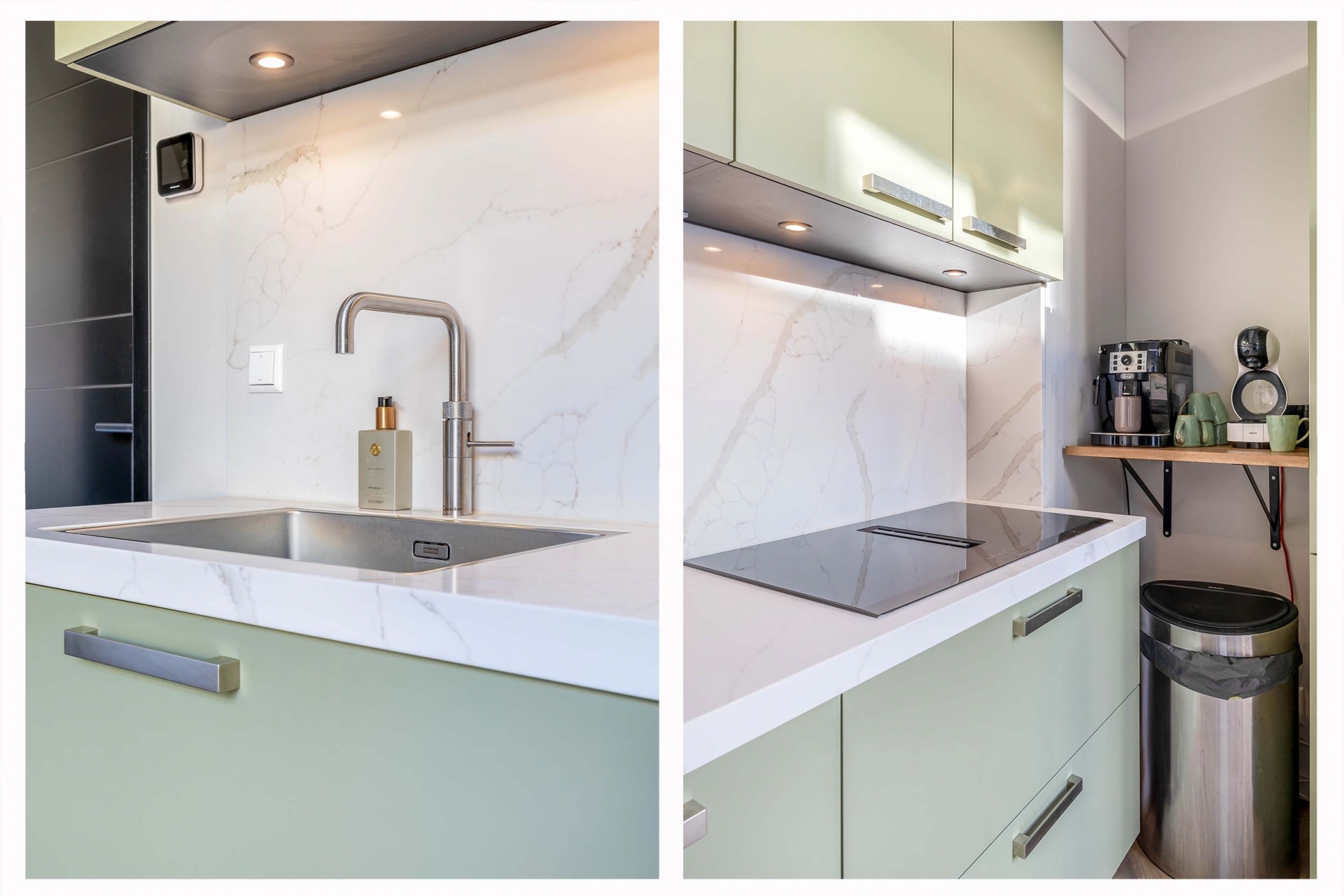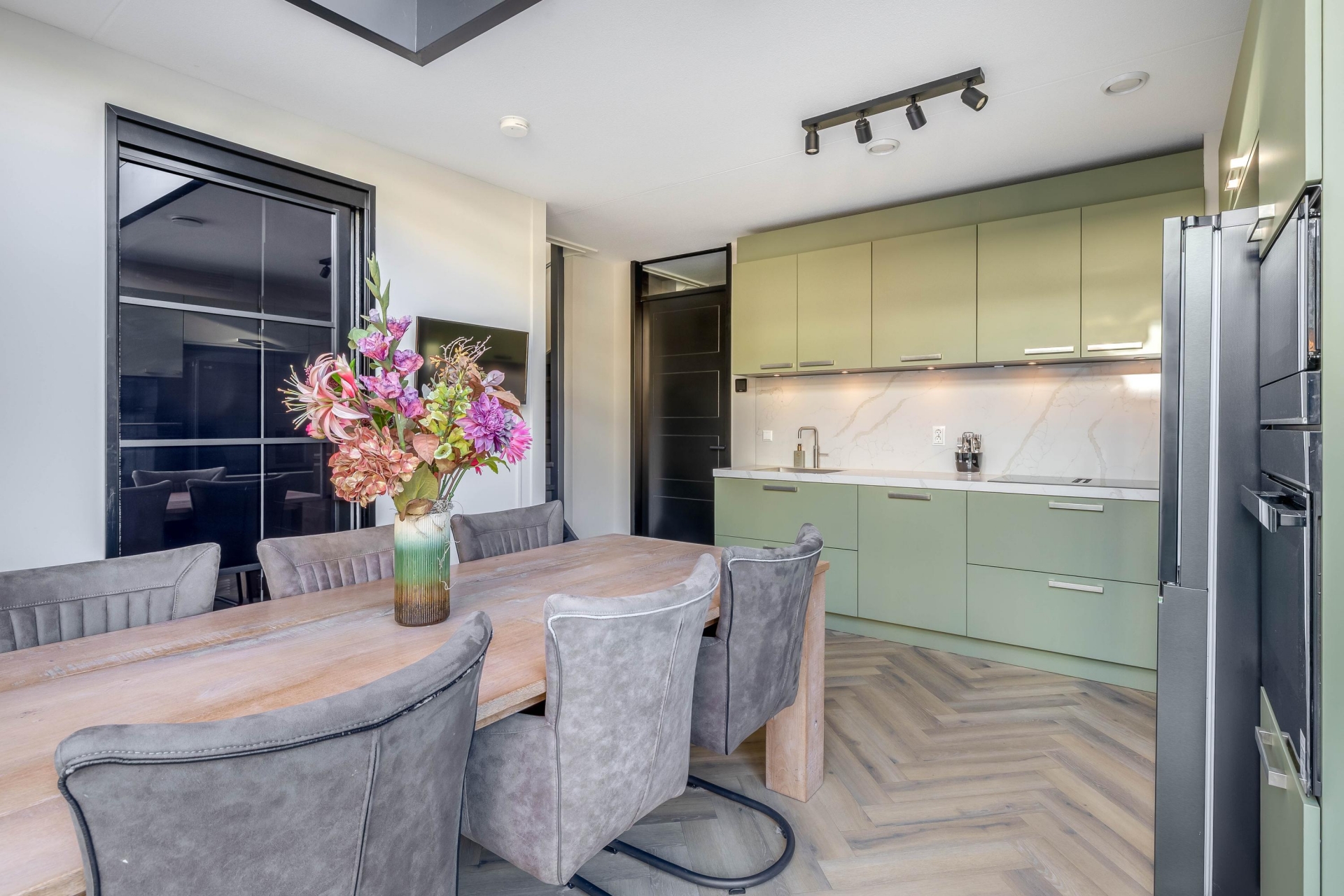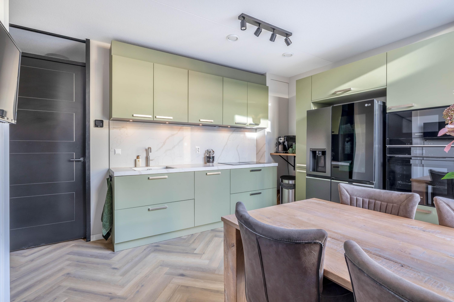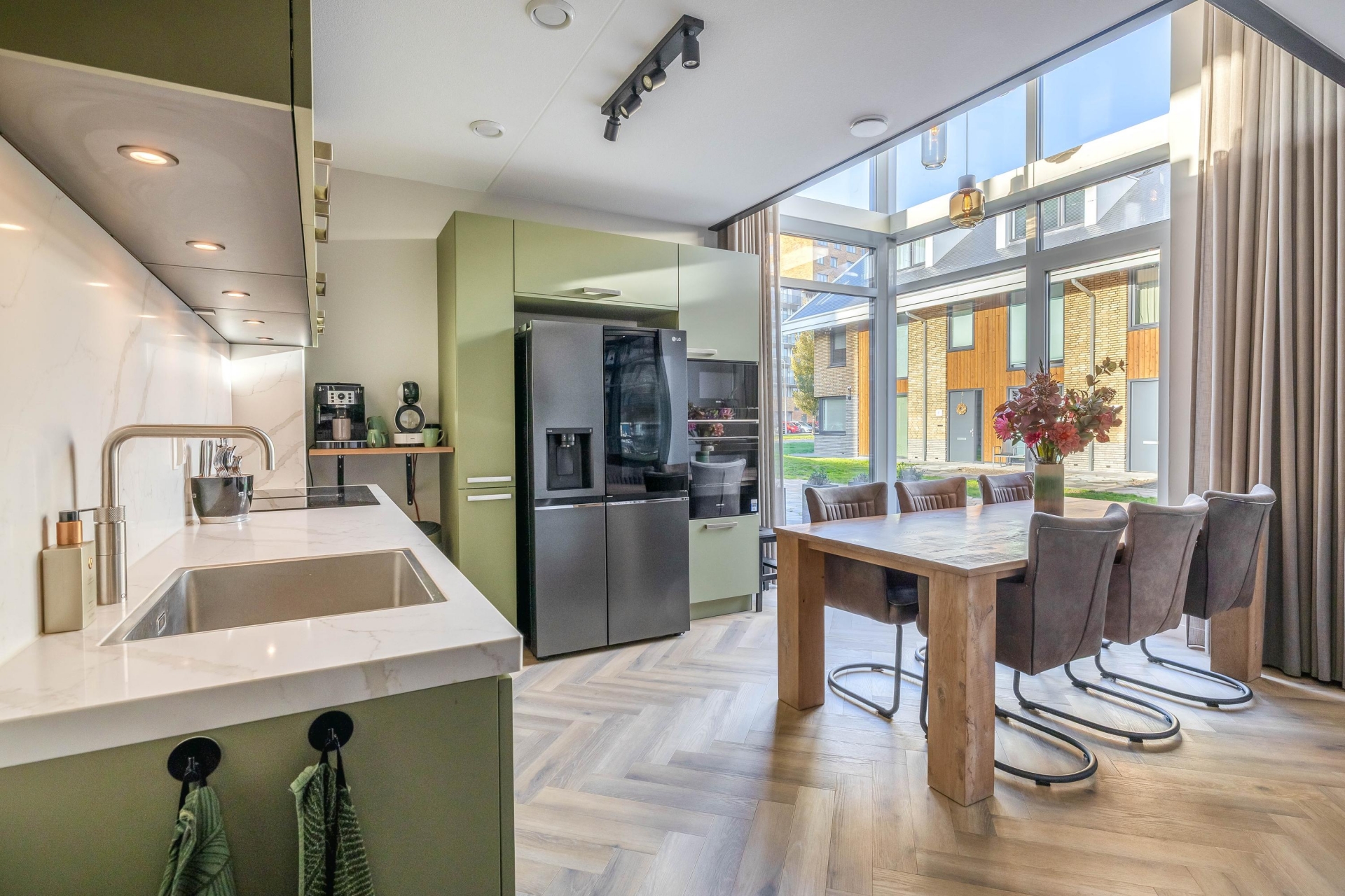 De keuken heeft een rustige, matte groene kleur in combinatie met marmeren tegels en is volledig uitgerust met hoogwaardige inbouwapparatuur. Zo beschikt de keuken onder andere over een Quooker-kraan, vaatwasser, inductiekookplaat met geïntegreerde afzuiging, Amerikaanse koelkast, oven en combimagnetron. Vanuit de keuken bereik je de bijkeuken, ideaal voor extra opbergruimte voor keukenspullen. Aangrenzend bevinden zich de inpandige berging en de toegang tot de privéparkeerplaats, welke is voorzien van een elektrische laadpaal.