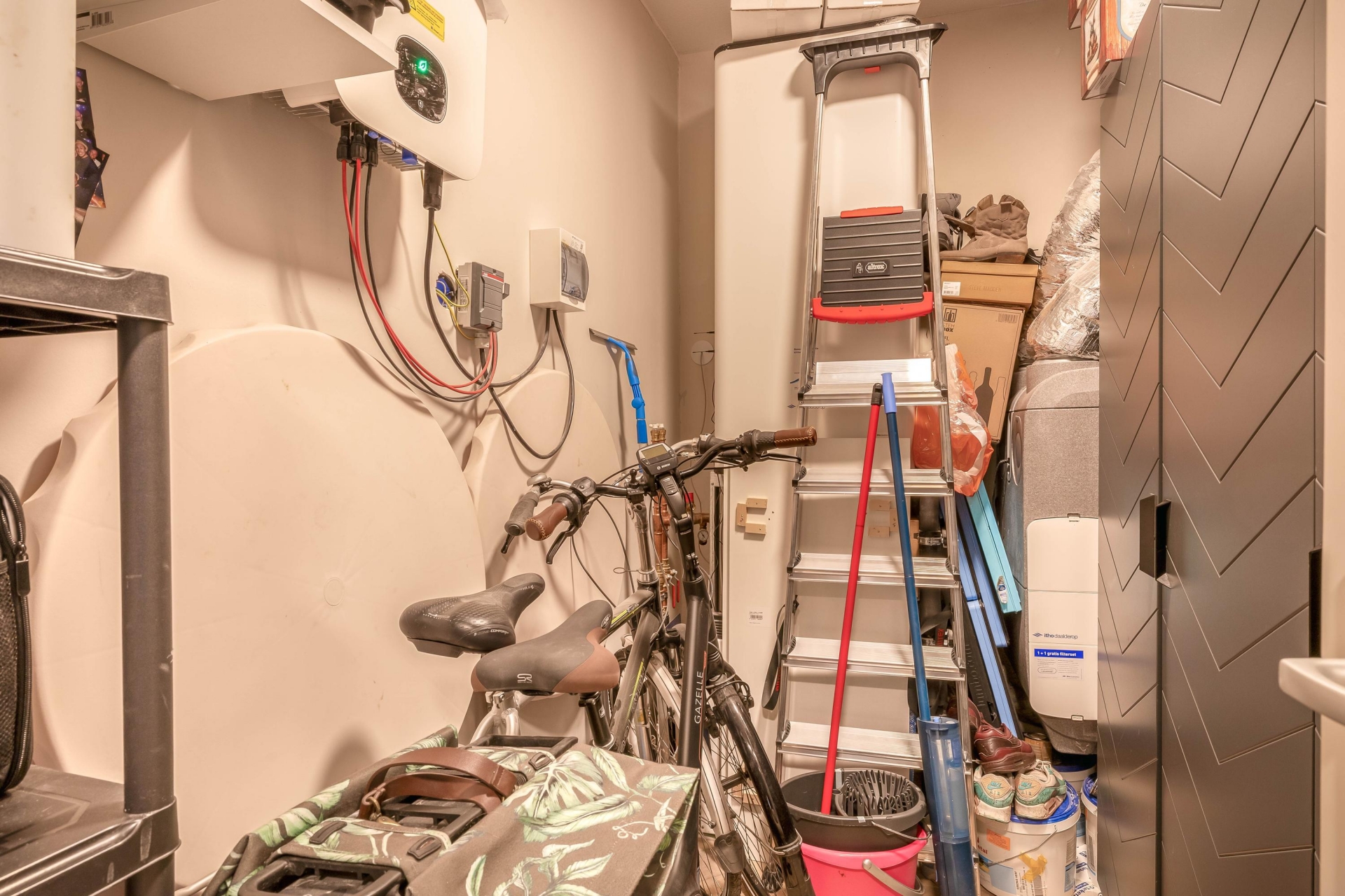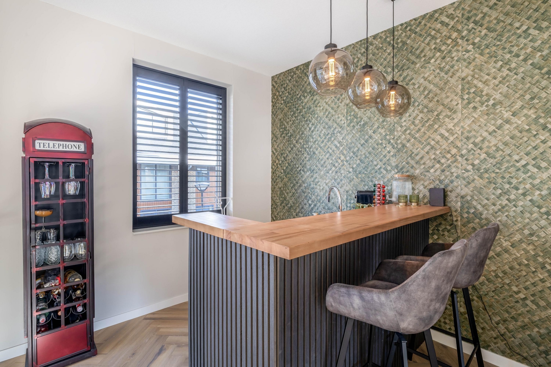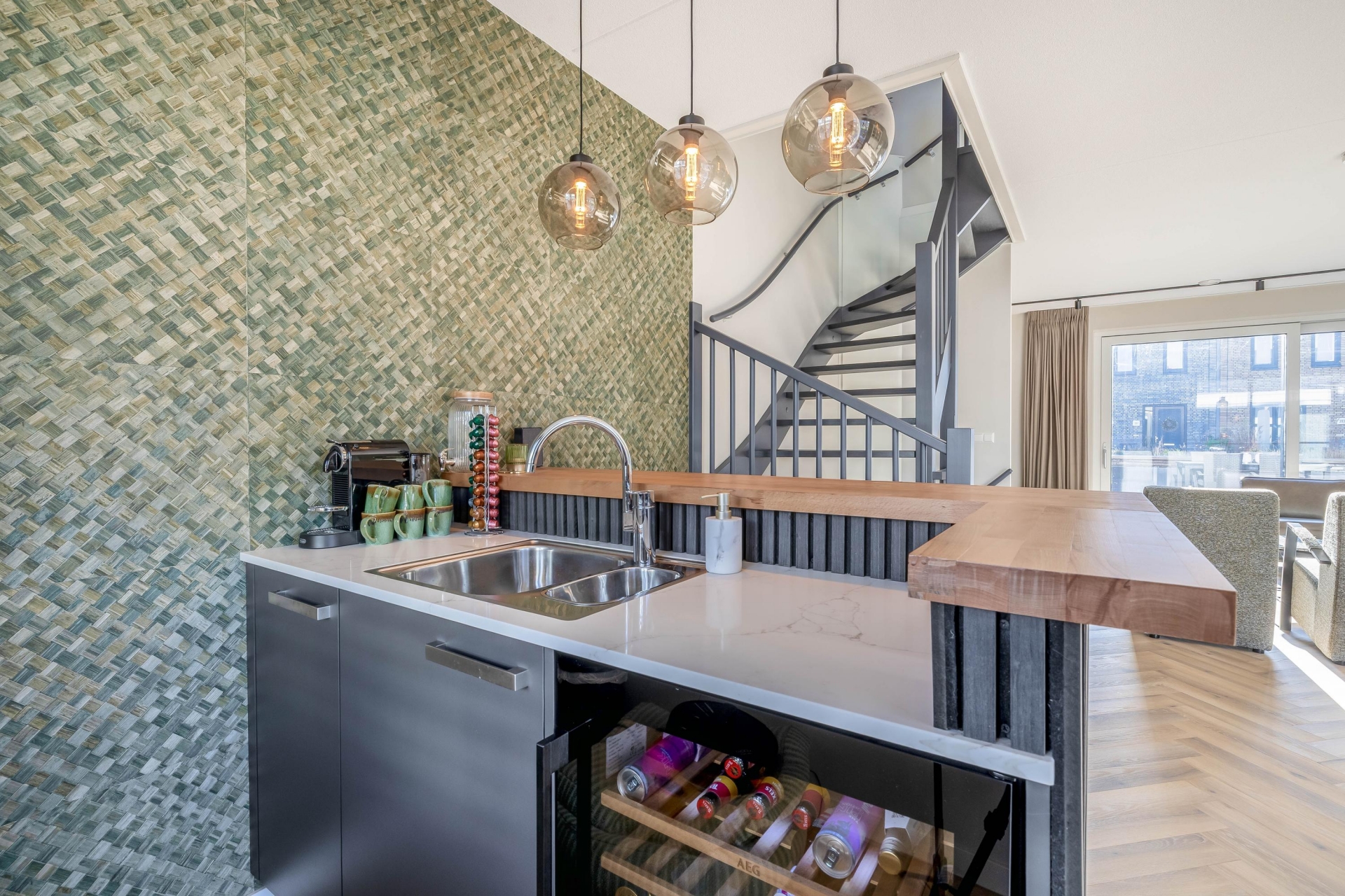 De keuken heeft een rustige, matte groene kleur in combinatie met marmeren tegels en is volledig uitgerust met hoogwaardige inbouwapparatuur. Zo beschikt de keuken onder andere over een Quooker-kraan, vaatwasser, inductiekookplaat met geïntegreerde afzuiging, Amerikaanse koelkast, oven en combimagnetron. Vanuit de keuken bereik je de bijkeuken, ideaal voor extra opbergruimte voor keukenspullen. Aangrenzend bevinden zich de inpandige berging en de toegang tot de privéparkeerplaats, welke is voorzien van een elektrische laadpaal.
