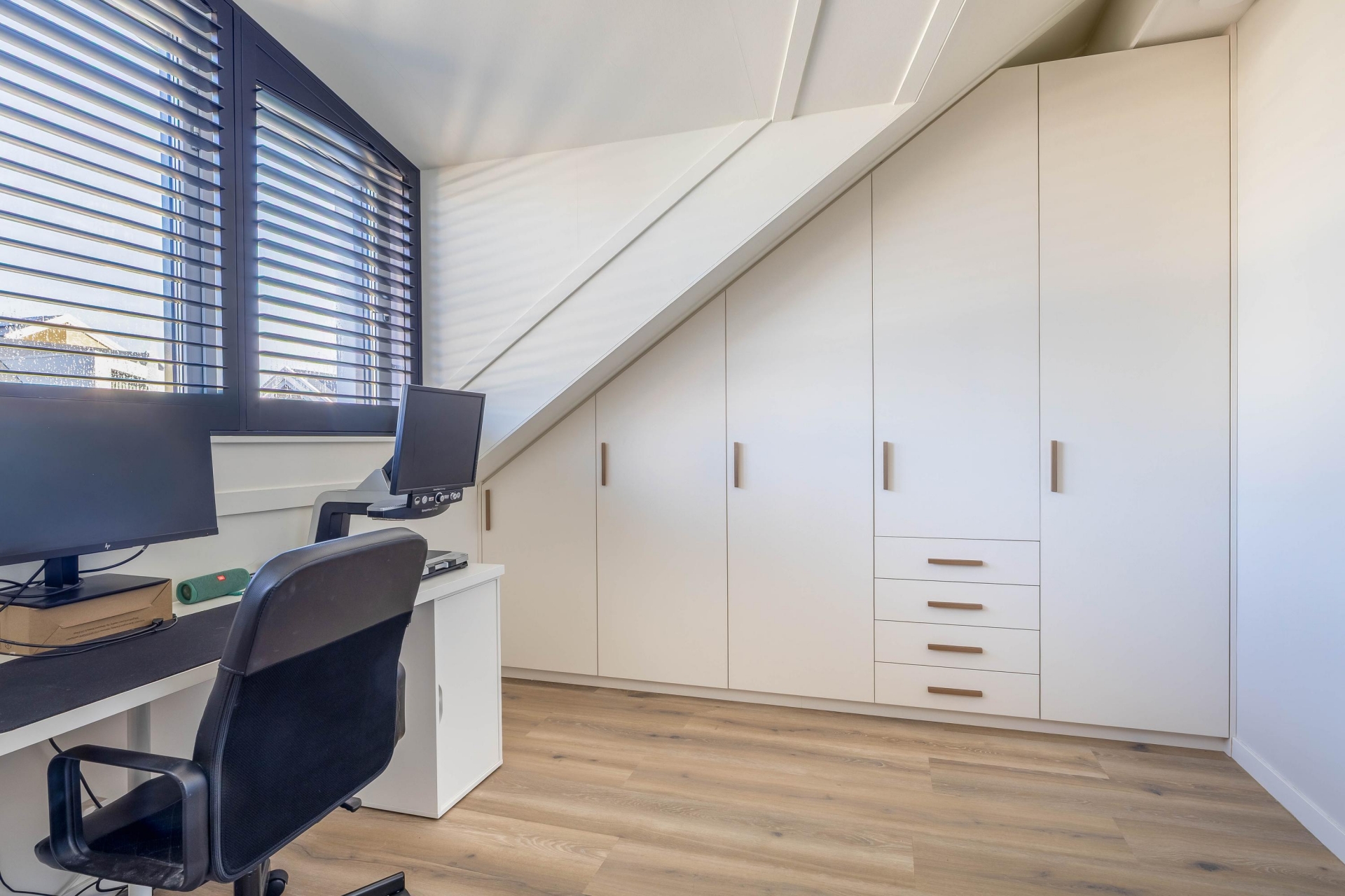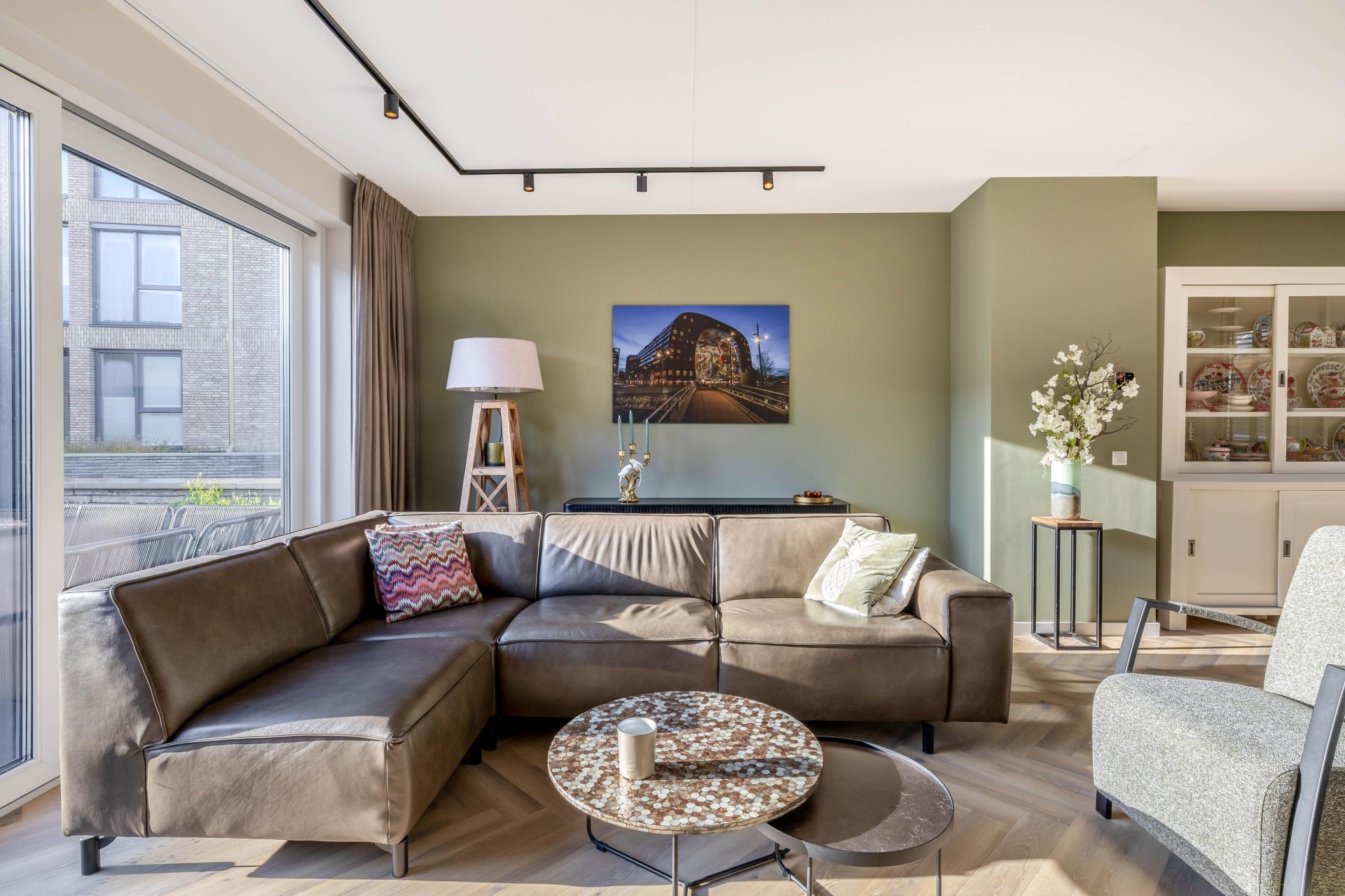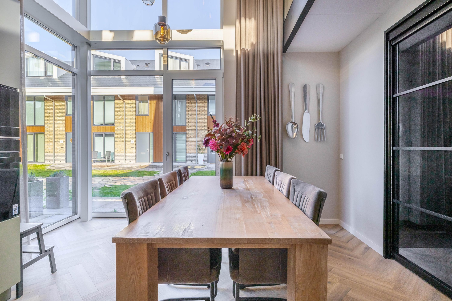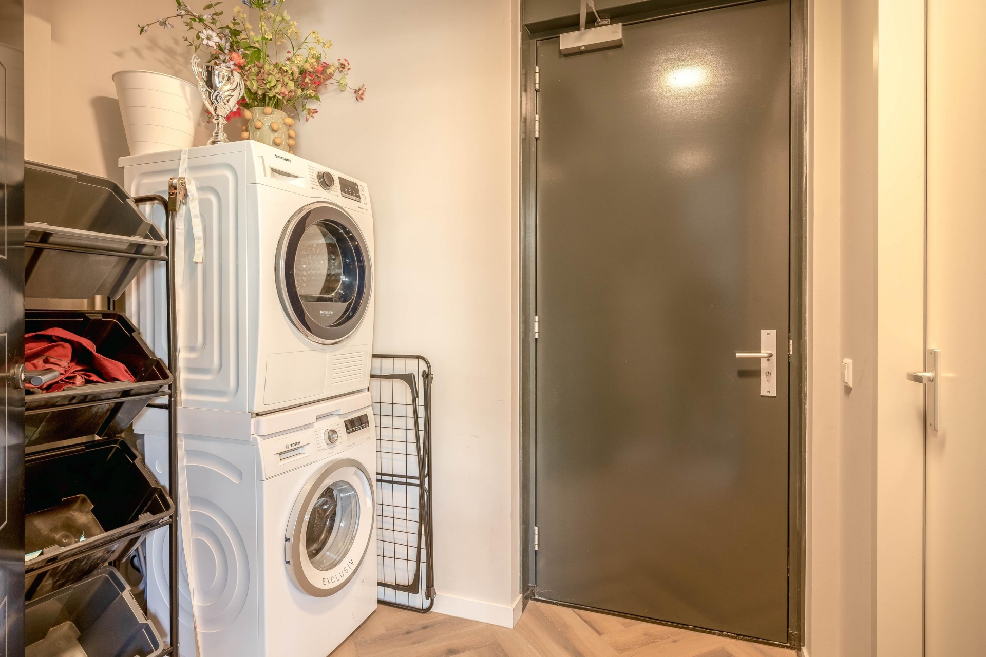 De keuken heeft een rustige, matte groene kleur in combinatie met marmeren tegels en is volledig uitgerust met hoogwaardige inbouwapparatuur. Zo beschikt de keuken onder andere over een Quooker-kraan, vaatwasser, inductiekookplaat met geïntegreerde afzuiging, Amerikaanse koelkast, oven en combimagnetron. Vanuit de keuken bereik je de bijkeuken, ideaal voor extra opbergruimte voor keukenspullen. Aangrenzend bevinden zich de inpandige berging en de toegang tot de privéparkeerplaats, welke is voorzien van een elektrische laadpaal.