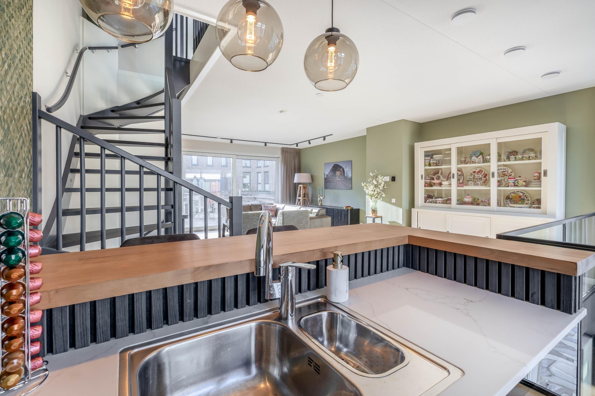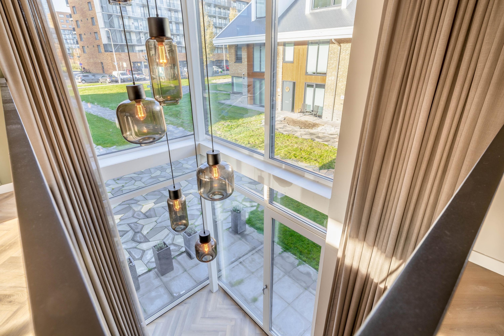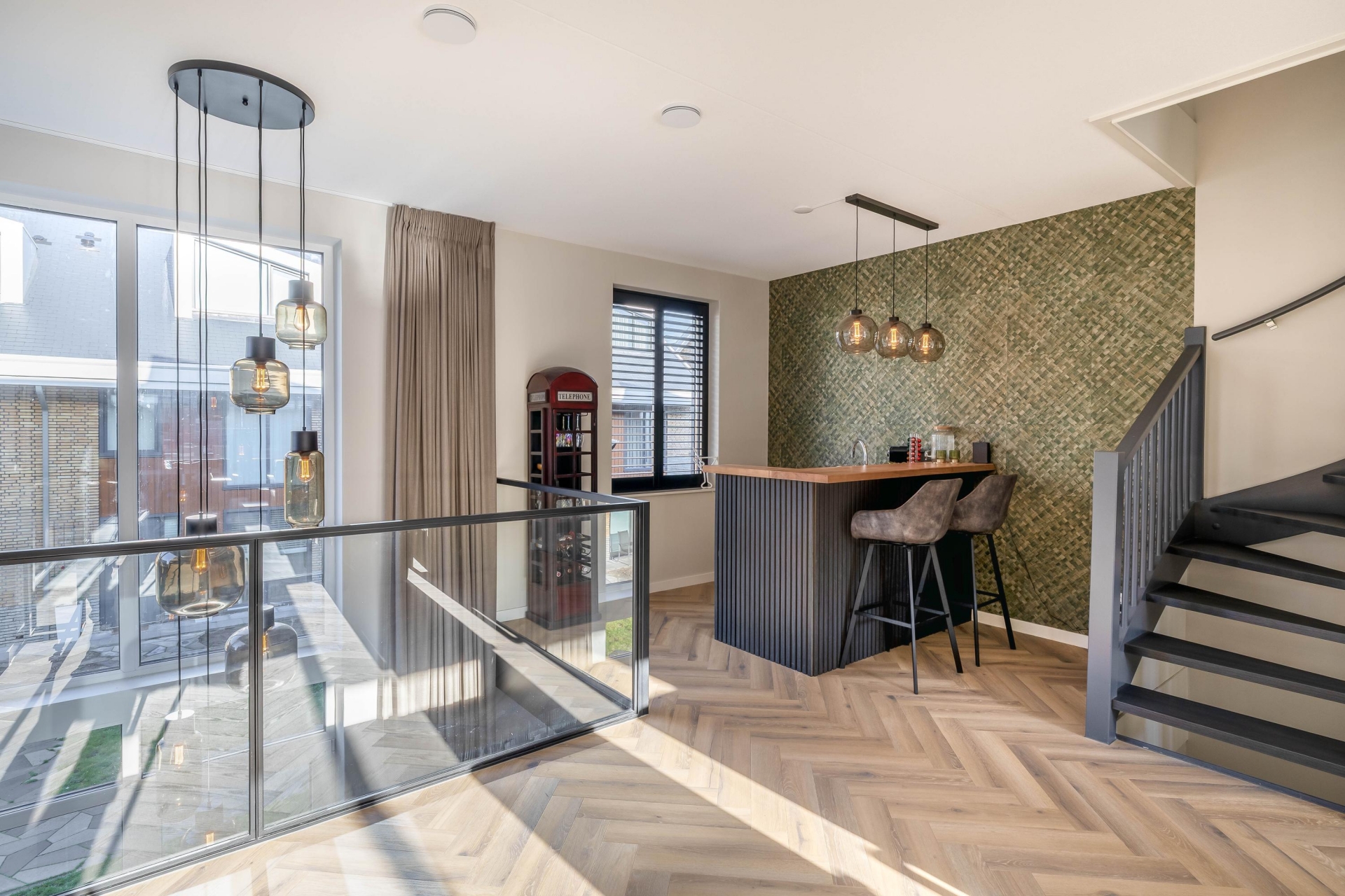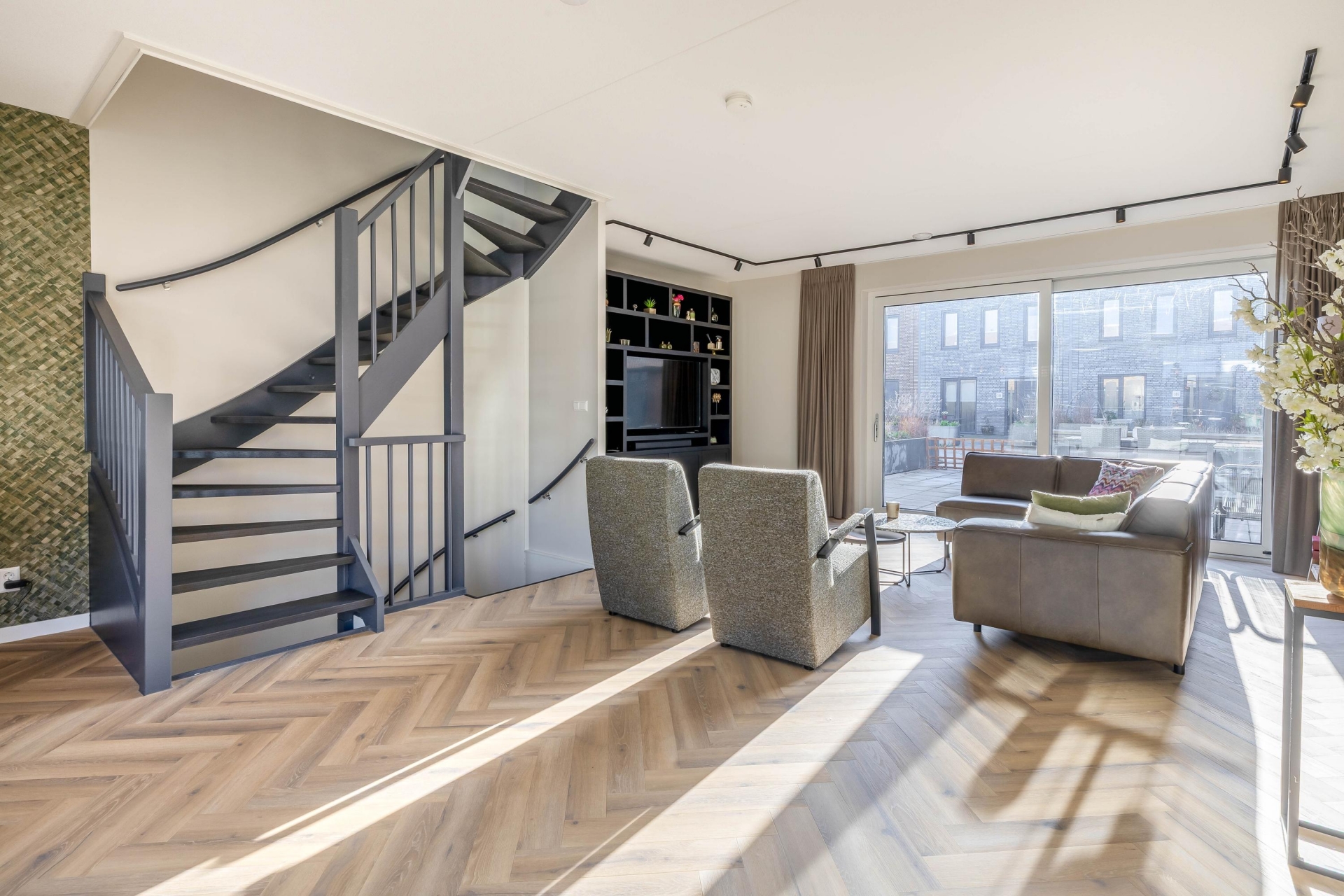 Via de trap in de keuken bereik je de woonkamer op de eerste verdieping. Aan beide zijden van de woning zorgen grote raampartijen voor een prachtig lichte en open leefruimte. De vide geeft extra ruimtelijkheid en verbindt de keuken op een natuurlijke manier met de woonkamer.