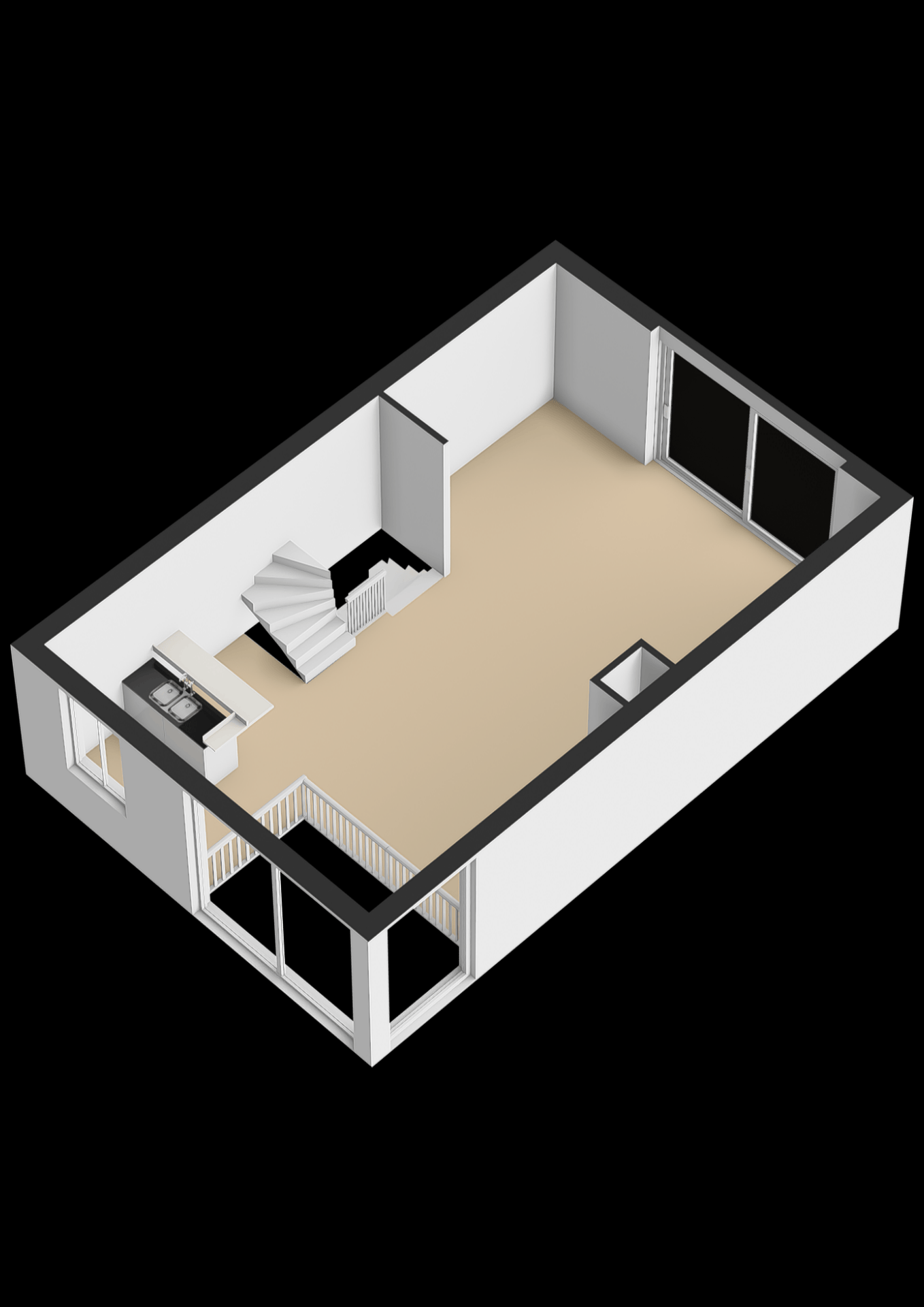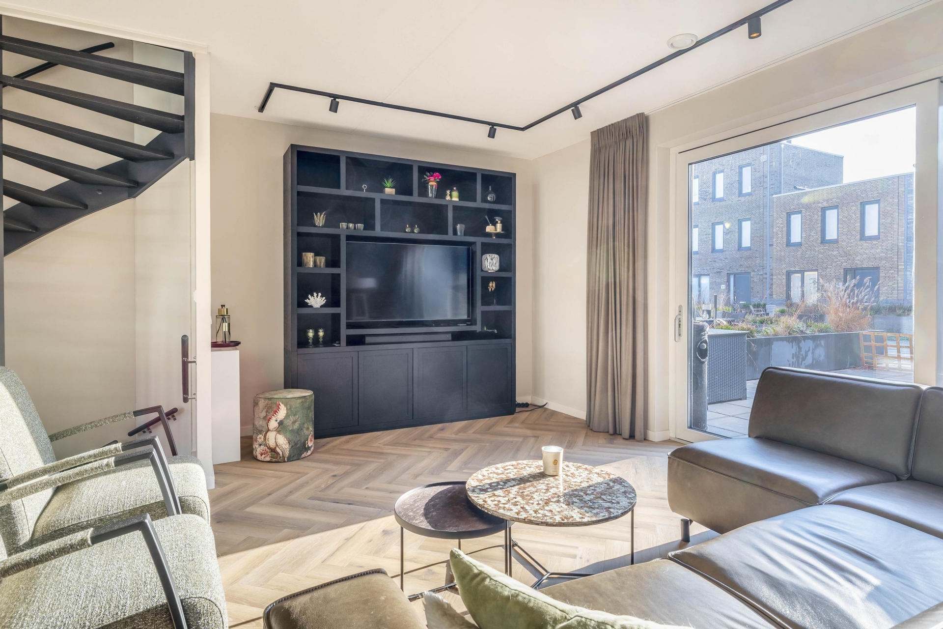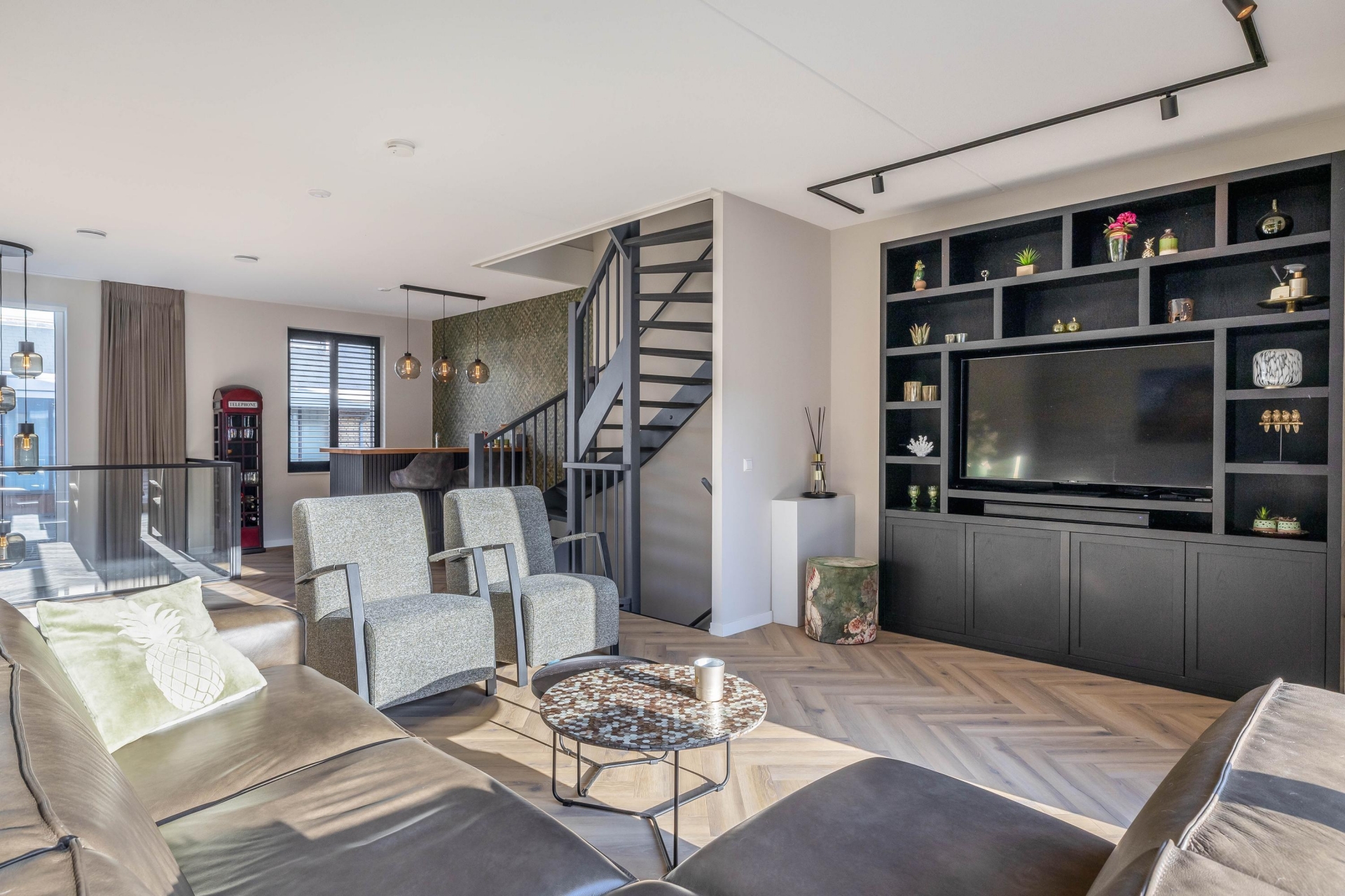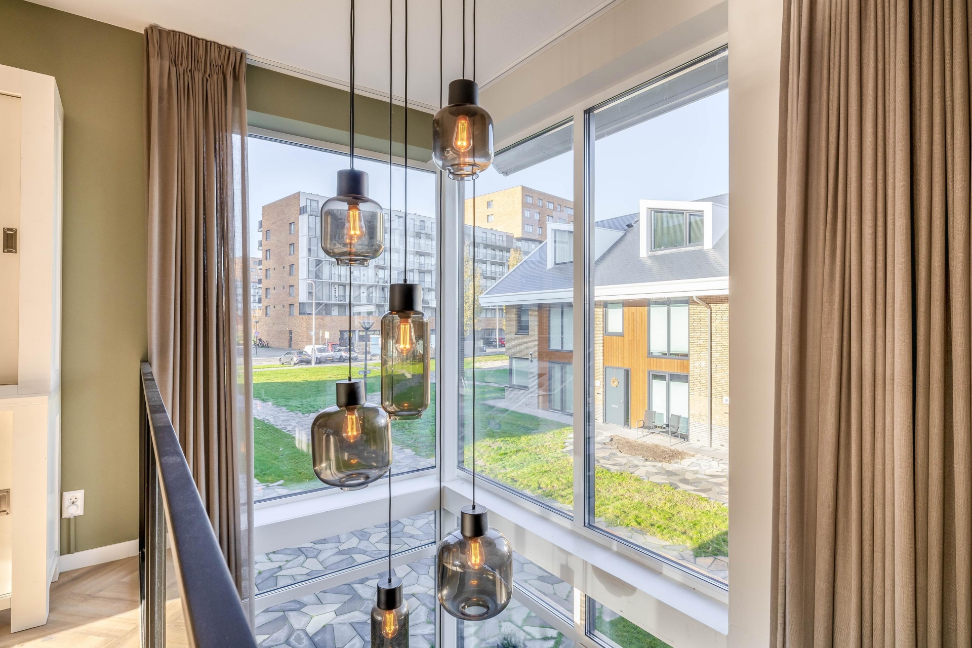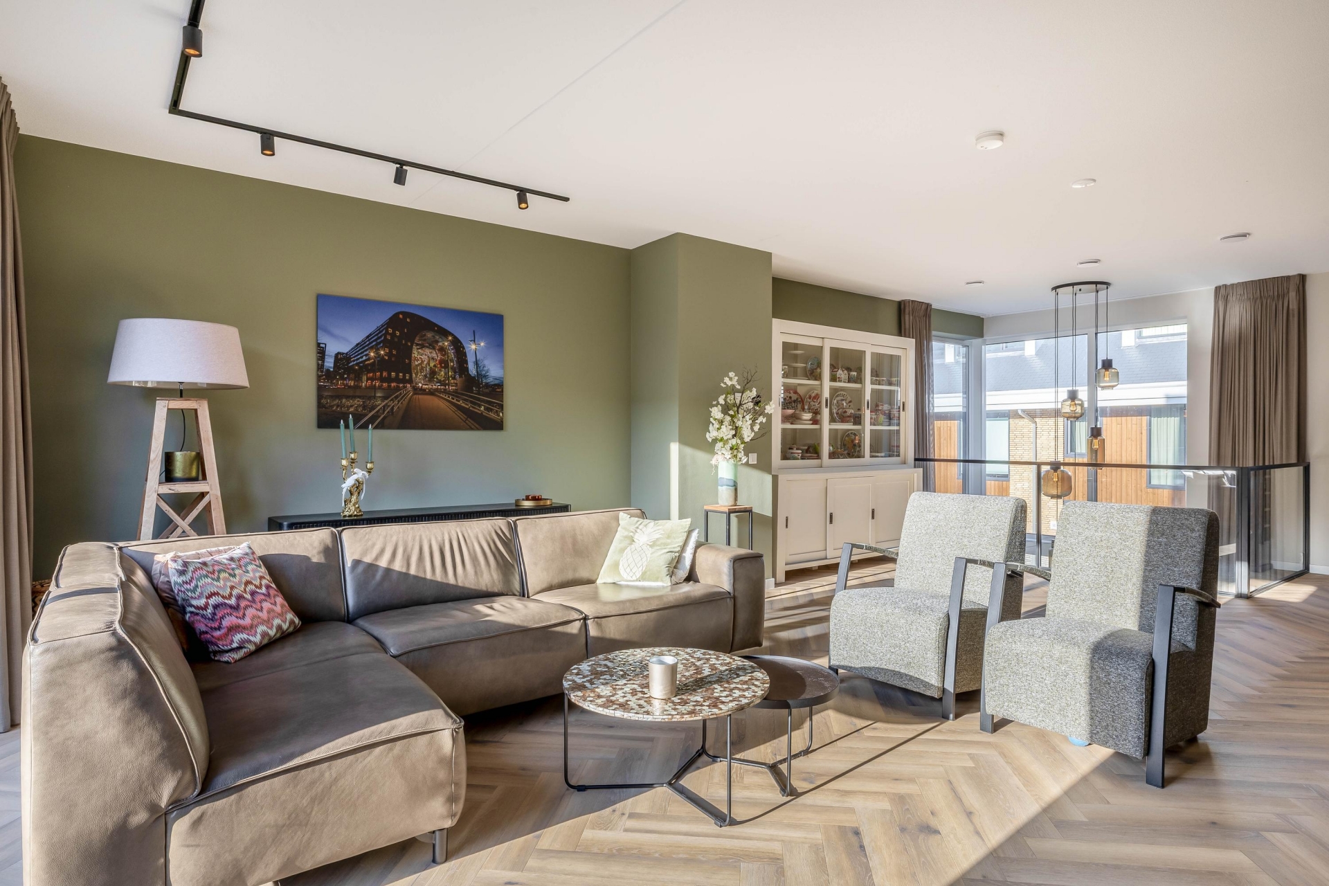 Via de trap in de keuken bereik je de woonkamer op de eerste verdieping. Aan beide zijden van de woning zorgen grote raampartijen voor een prachtig lichte en open leefruimte. De vide geeft extra ruimtelijkheid en verbindt de keuken op een natuurlijke manier met de woonkamer.