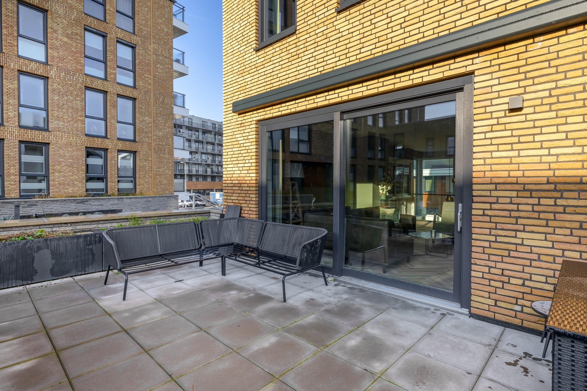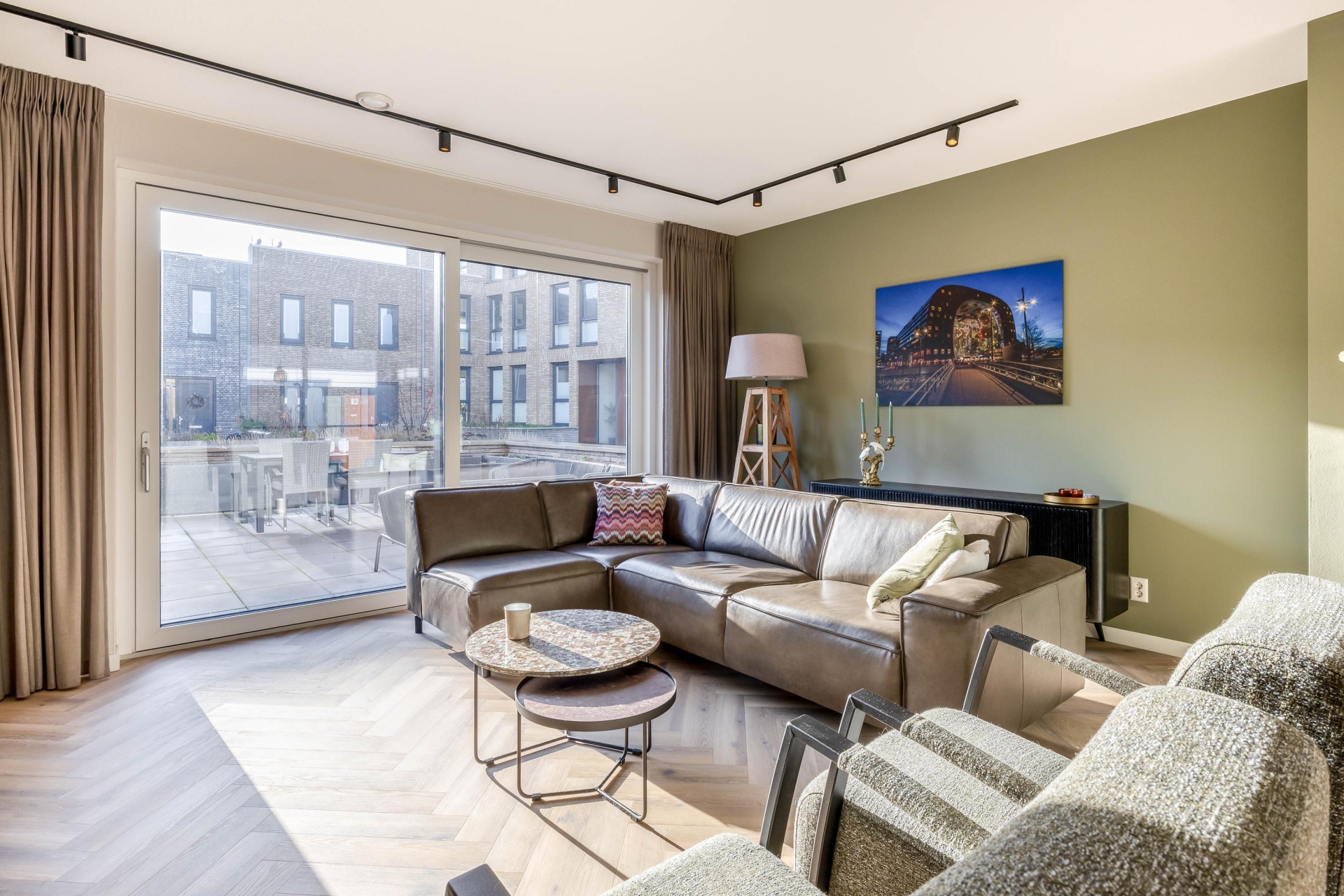 Aan de voorzijde van de woonkamer is een minibar met wijnkoeler geplaatst, ideaal voor een kop koffie, een drankje of iets lekkers. Via de schuifpui krijg je toegang tot de tuin. Deze is gesitueerd op het zuidoosten, beschikt over een ruim zonnescherm en een buitenkraan, en heeft een oppervlakte van circa 40 m².
