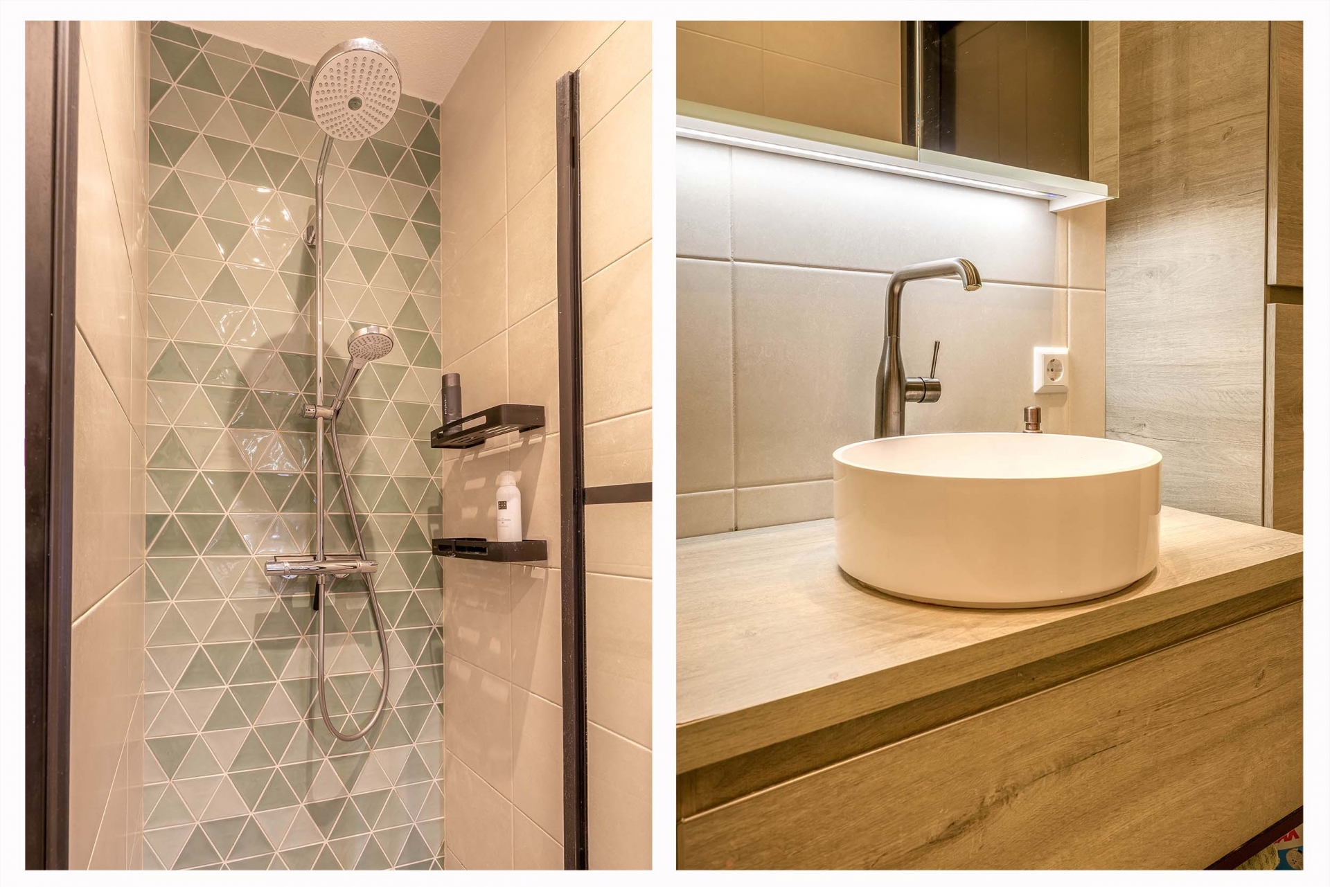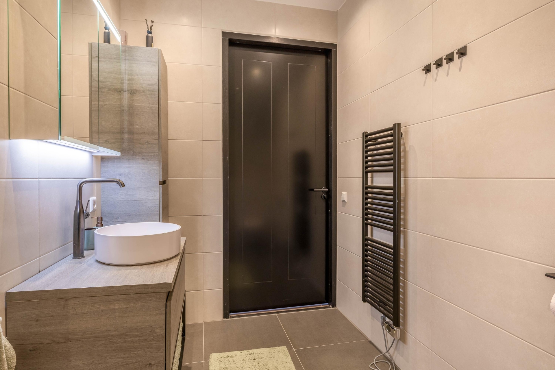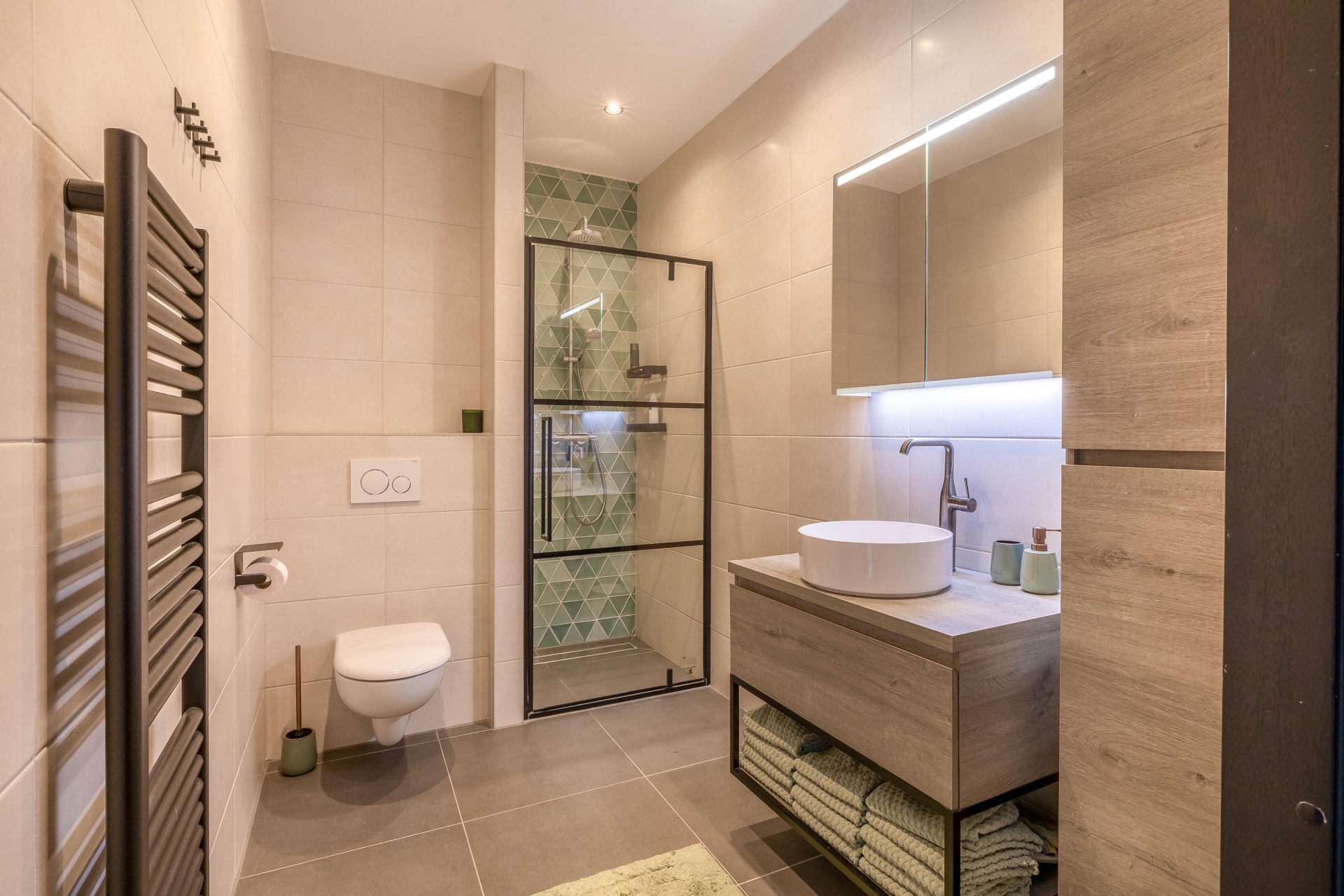 De inpandige badkamer is uitgerust met luxe en hoogwaardige voorzieningen, waaronder een hangend toilet, een strak wastafelmeubel en een ruime inloopdouche.