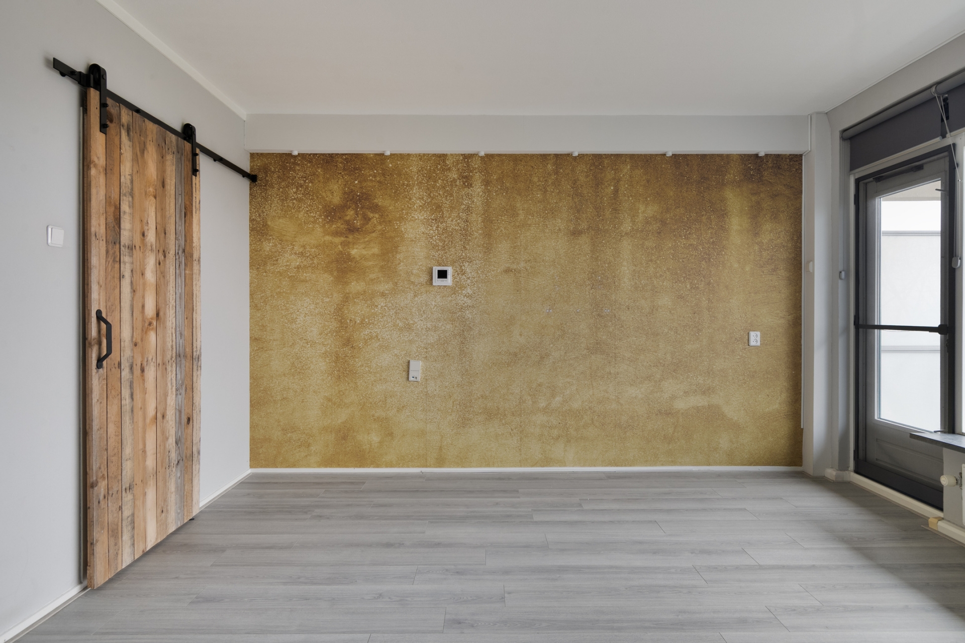 De leefruimte vormt het hart van het huis. Hier is ruimte voor een zitgedeelte, een eettafel én een slaapopstelling, zonder dat het vol aanvoelt. De huidige indeling laat goed zien hoe je de ruimte praktisch kunt gebruiken, met duidelijke zones voor wonen, slapen en ontspannen. De lichte vloer en neutrale afwerking dragen bij aan een rustige uitstraling, waardoor je hier eenvoudig je eigen stijl kunt toevoegen.
