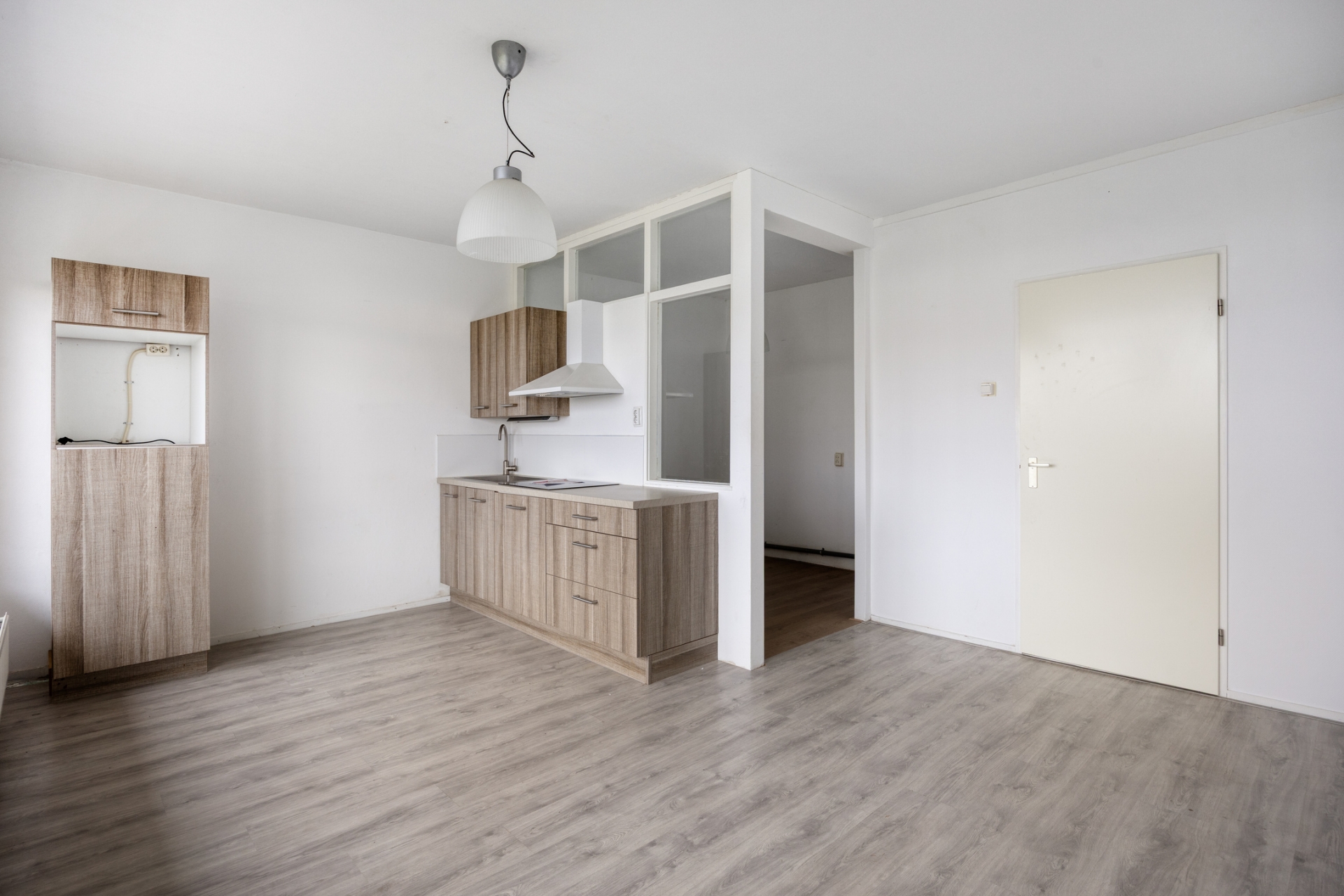 De woonkamer is heerlijk licht dankzij de grote raampartijen en de gunstige ligging op het zuidwesten. Er is voldoende ruimte voor een gezellige zithoek en eethoek, met direct toegang tot het balkon. Hier geniet je in de middag en avond van de zon én het uitzicht over het park met waterpartij. De open keuken is compact en netjes afgewerkt, met voldoende kastruimte.