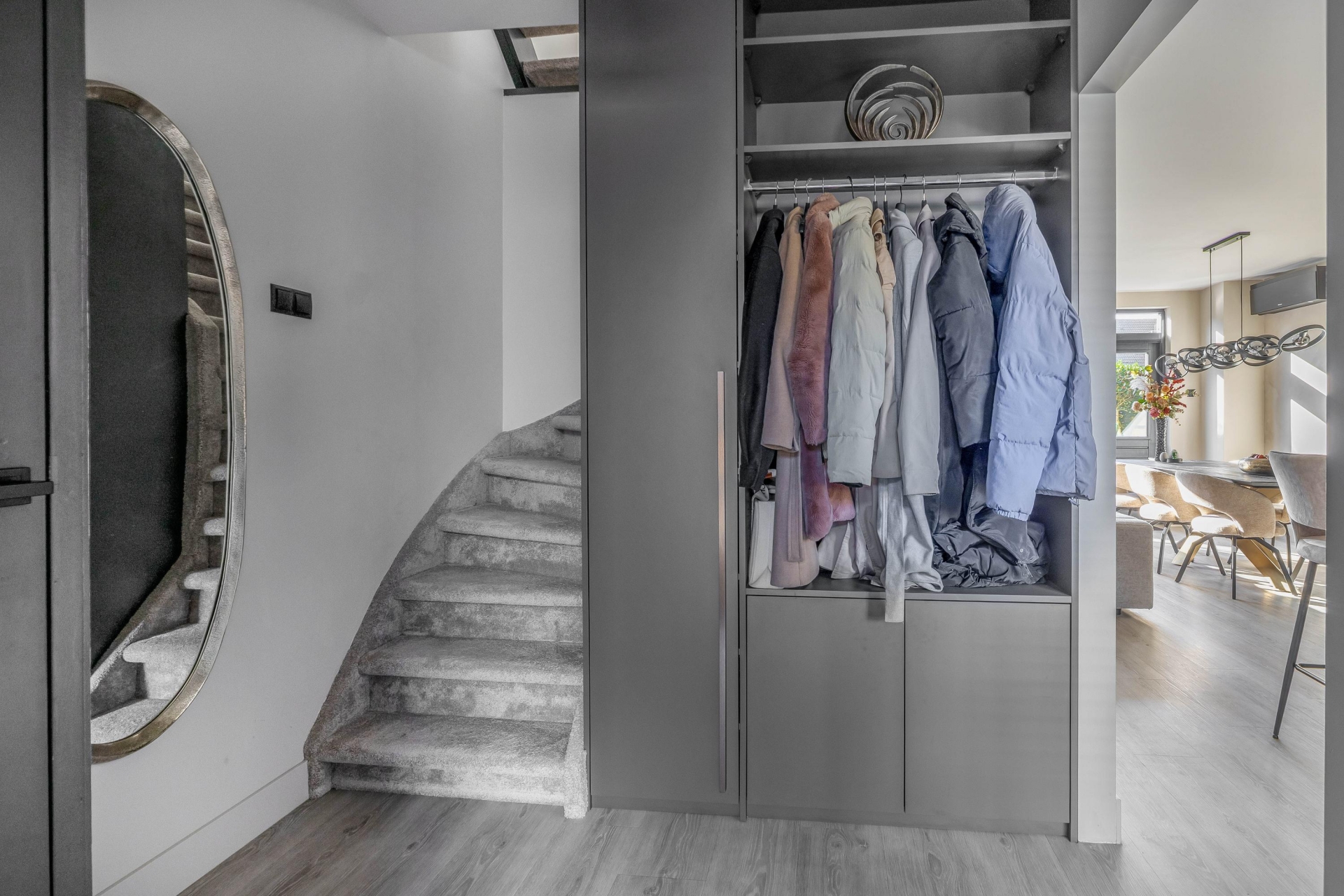 Ook in de hal is een op maat gemaakte garderobekast geplaatst, waardoor je bij binnenkomst direct een nette en georganiseerde indruk krijgt.