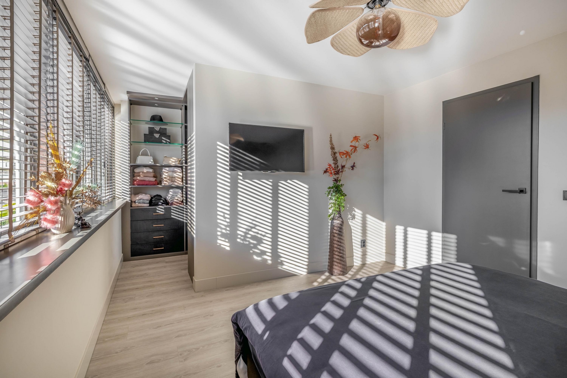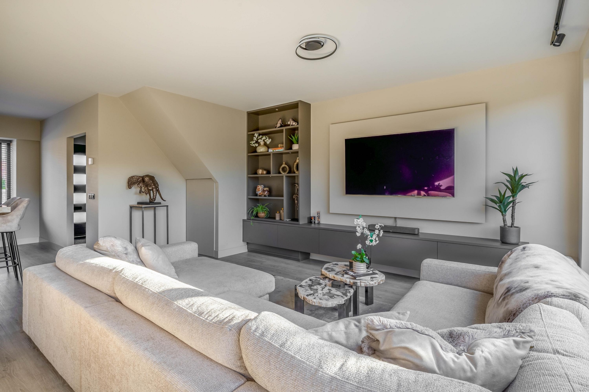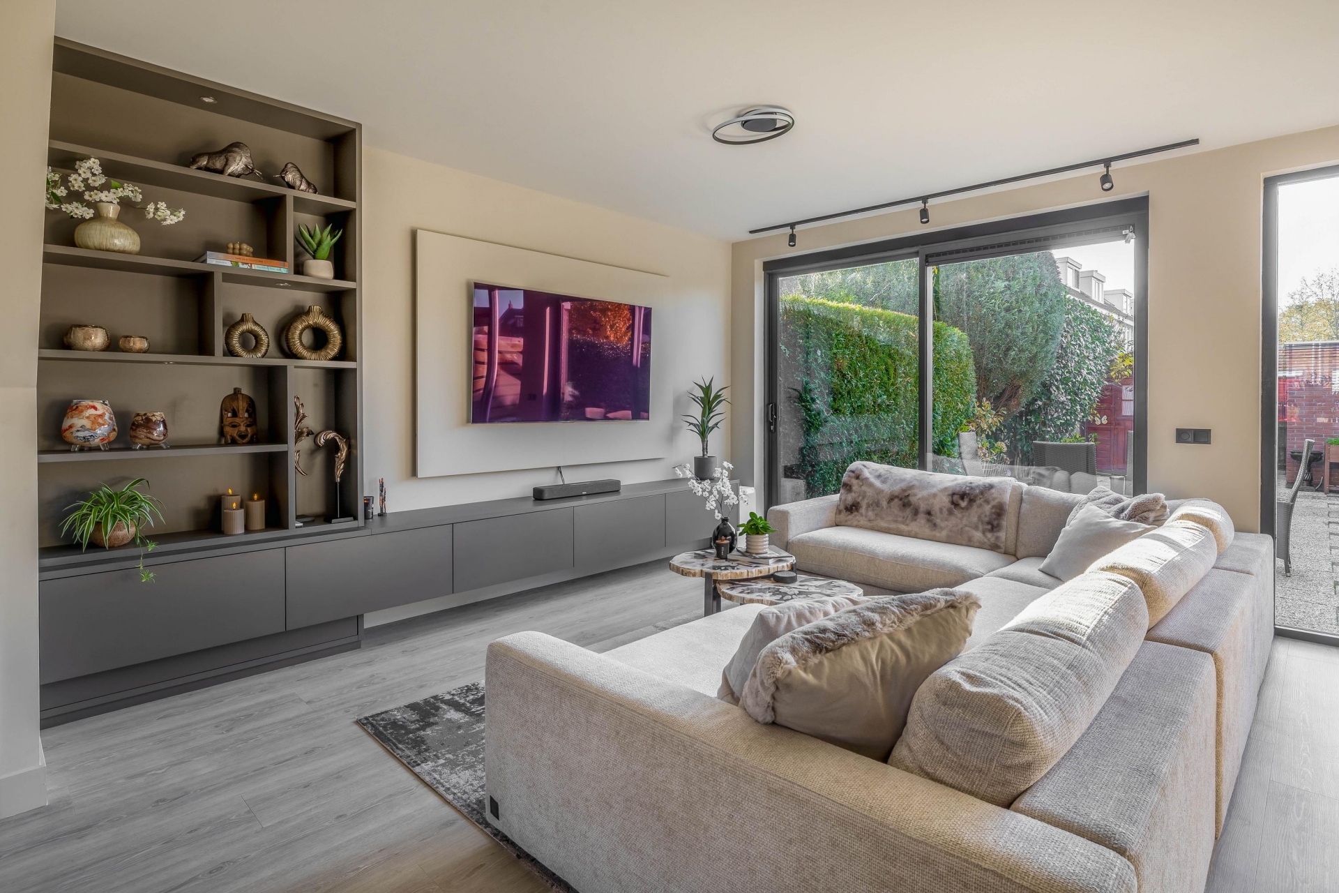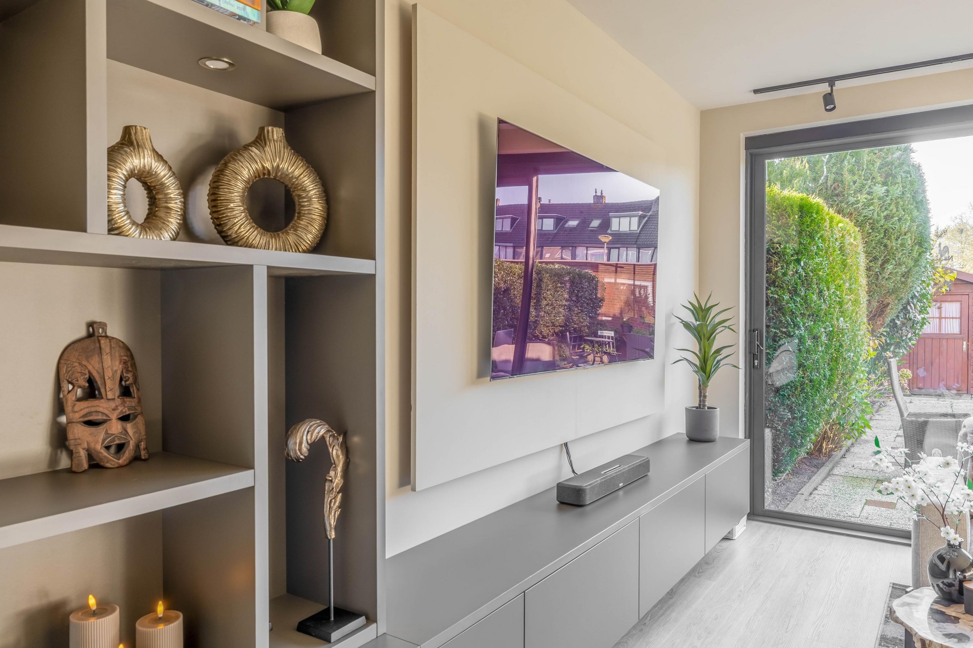 De woonkamer is bovendien voorzien van een op maat gemaakt tv-meubel, uitgevoerd in hoogwaardige materialen, wat zorgt voor een strak en rustig geheel. De gehele begane grond is voorzien van comfortabele vloerverwarming, wat zorgt voor een aangename temperatuur en een strakke, moderne afwerking zonder zichtbare radiatoren.