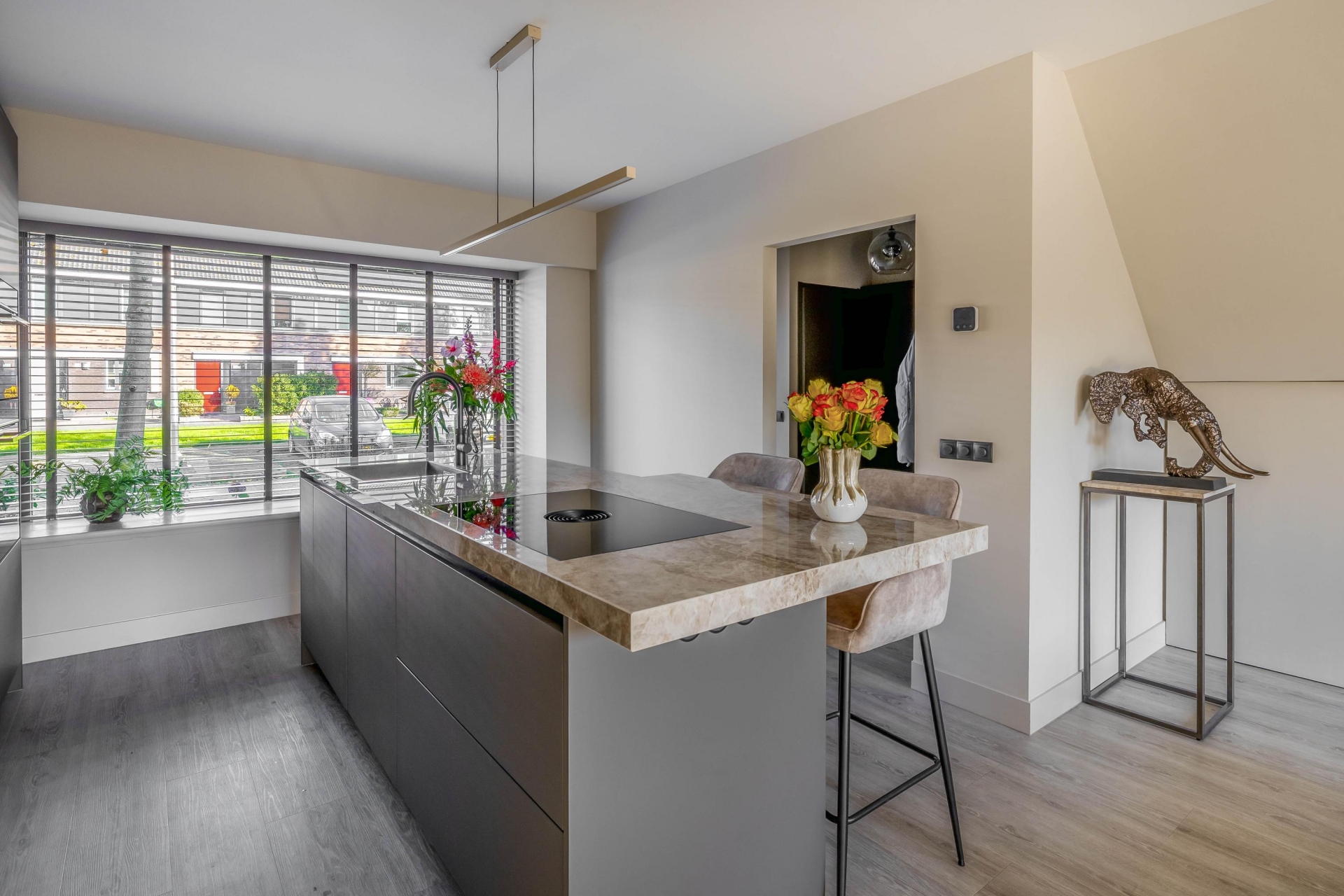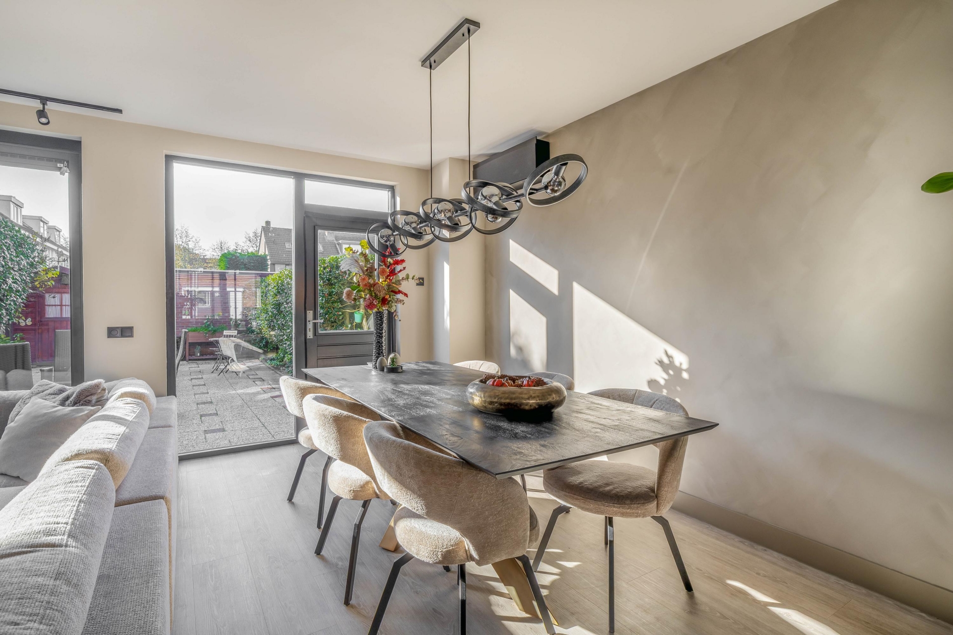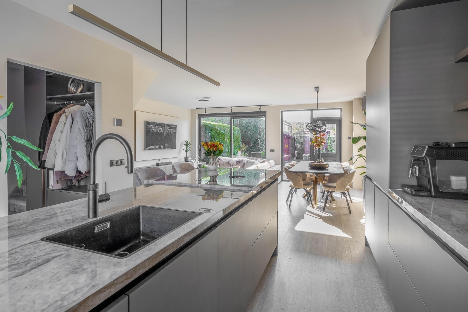 De woonkamer is het kloppend hart van de woning: licht, ruim en met een stijlvolle uitstraling. De luxe woonkeuken aan de voorzijde is een echte eyecatcher. Deze keuken is eind 2024 volledig nieuw geplaatst en uitgerust met moderne inbouwapparatuur, een royaal kookeiland en veel opbergruimte. Hier komen koken en gezelligheid samen. Dankzij de grote raampartijen en de schuifpui aan de achterzijde geniet je de hele dag van natuurlijk licht en een mooie verbinding met de tuin.
