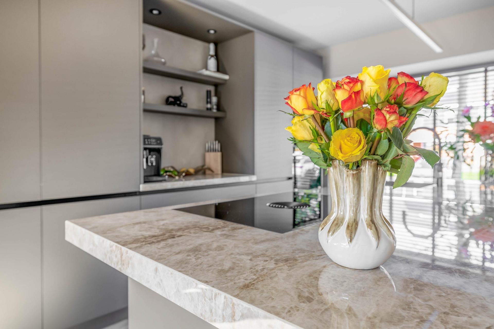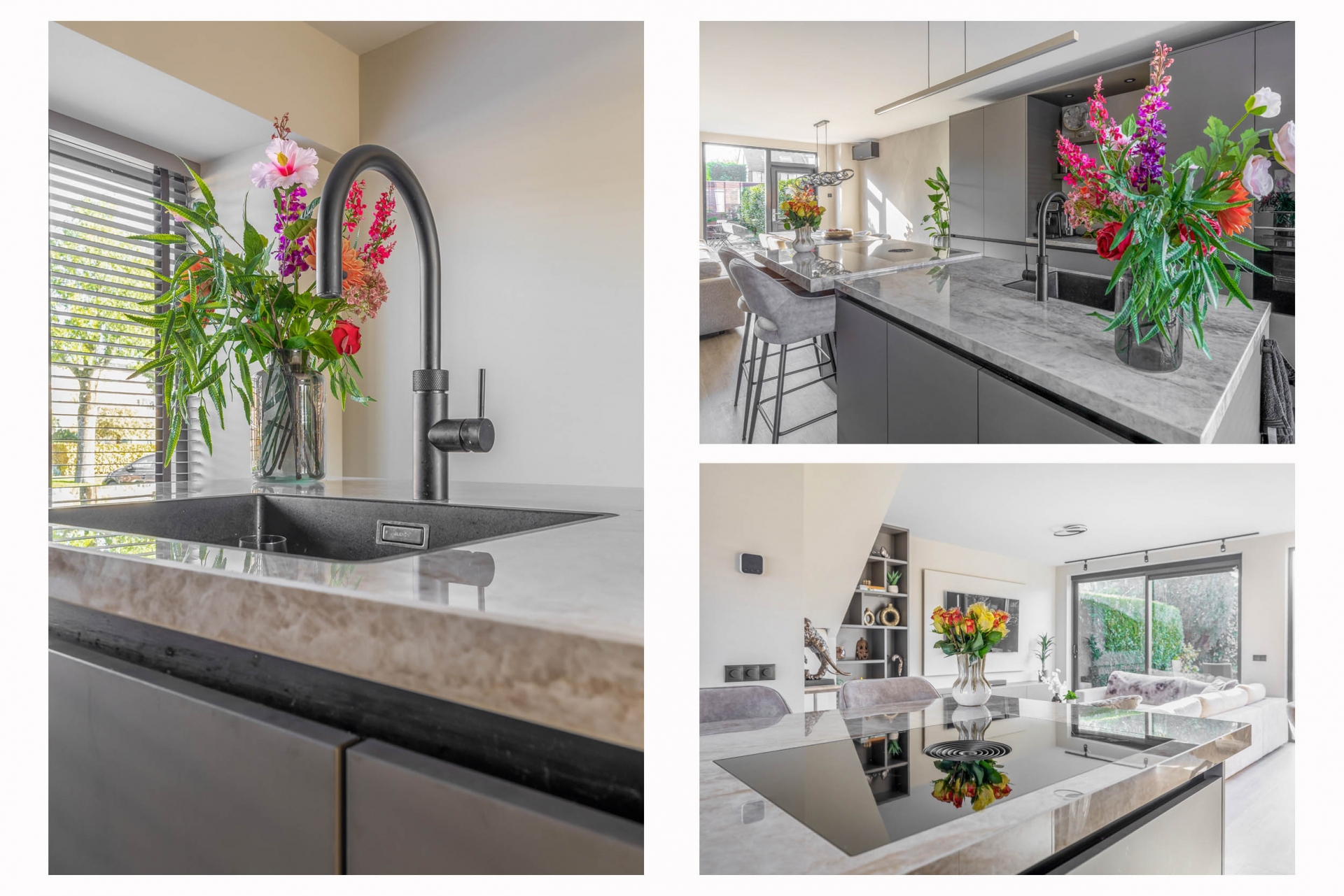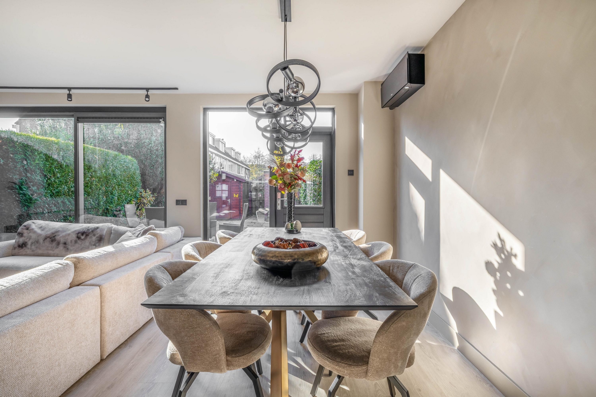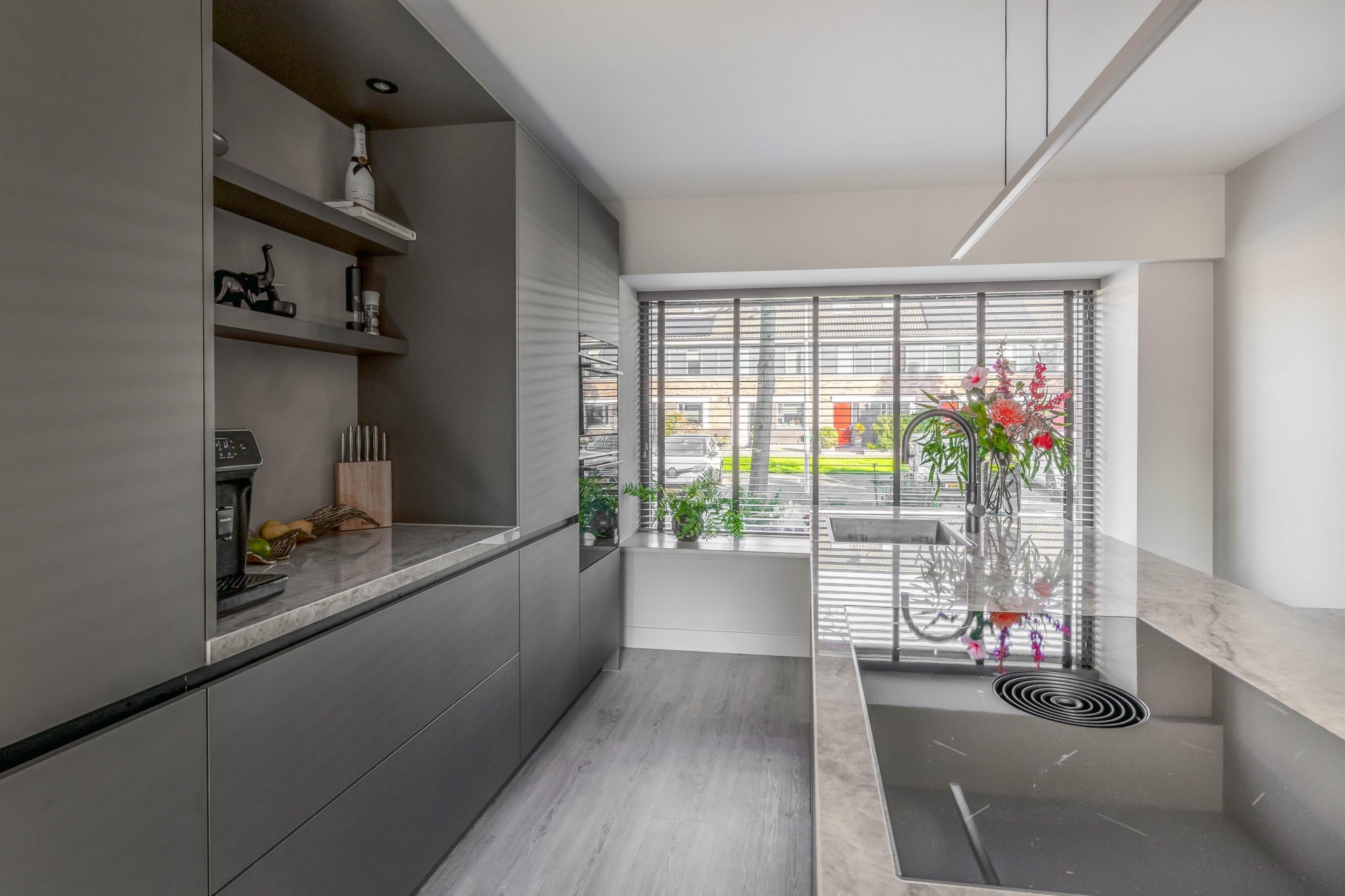 De woonkamer is het kloppend hart van de woning: licht, ruim en met een stijlvolle uitstraling. De luxe woonkeuken aan de voorzijde is een echte eyecatcher. Deze keuken is eind 2024 volledig nieuw geplaatst en uitgerust met moderne inbouwapparatuur, een royaal kookeiland en veel opbergruimte. Hier komen koken en gezelligheid samen. Dankzij de grote raampartijen en de schuifpui aan de achterzijde geniet je de hele dag van natuurlijk licht en een mooie verbinding met de tuin.
