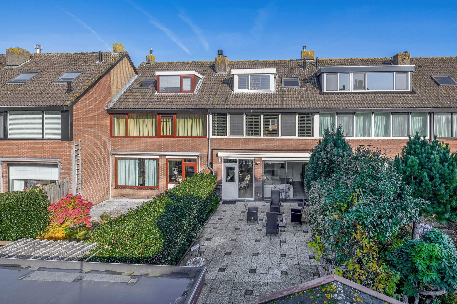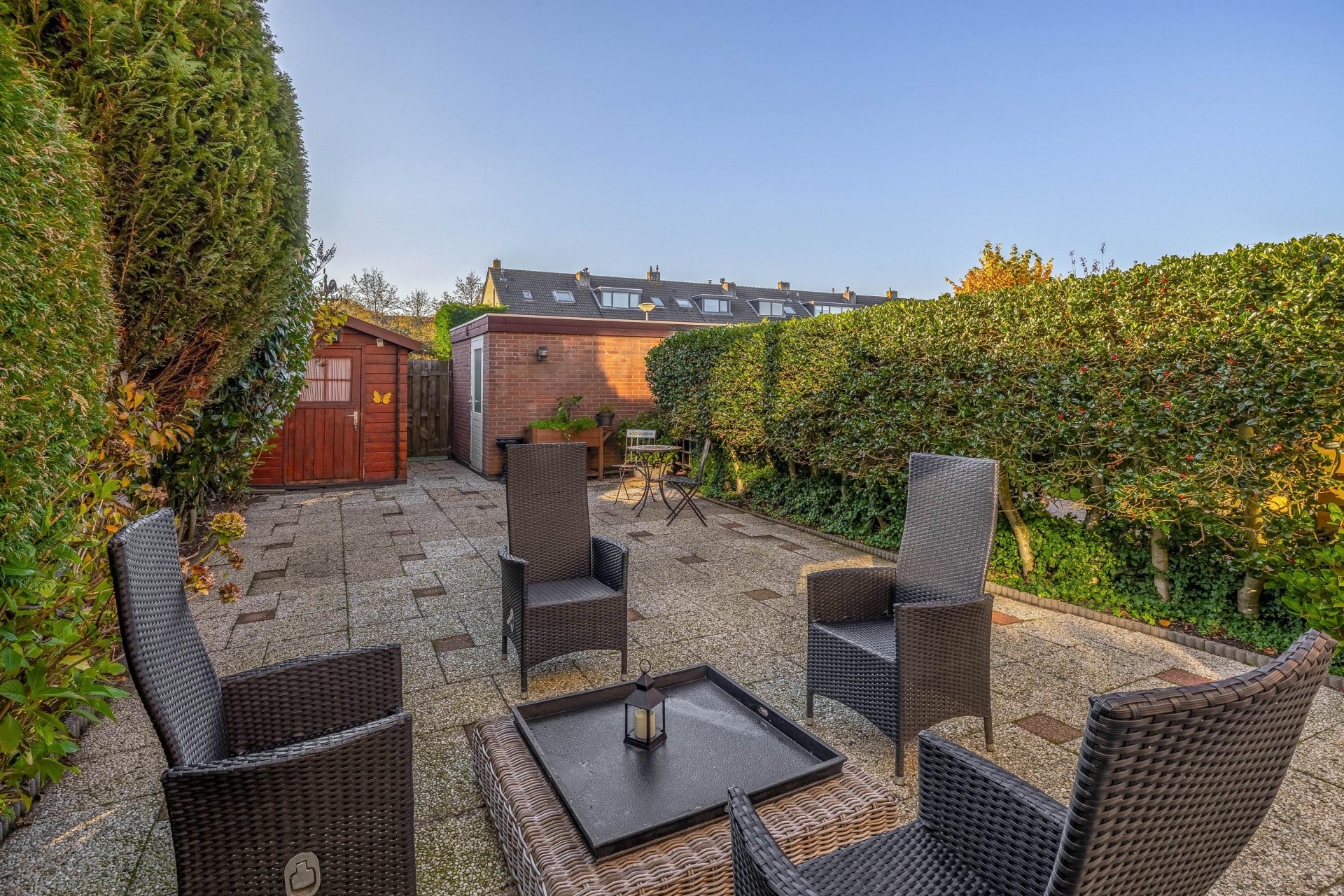 De achtertuin ligt op het zuidwesten, waardoor je tot laat in de middag en avond van de zon kunt genieten. De tuin is verzorgd aangelegd en biedt volop privacy. Via de schuifpui loopt de woonkamer naadloos over in het buitengedeelte, ideaal voor gezellige barbecues of ontspannen avonden in de buitenlucht. Achterin vind je zowel een stenen als houten berging, plus een achterom.